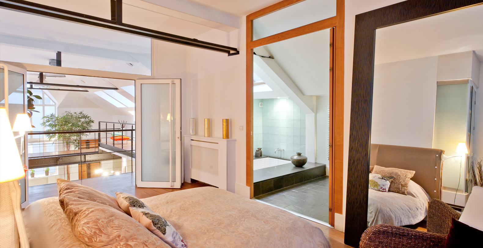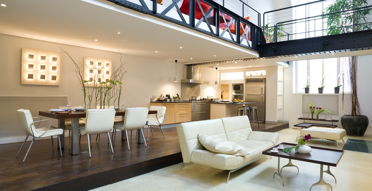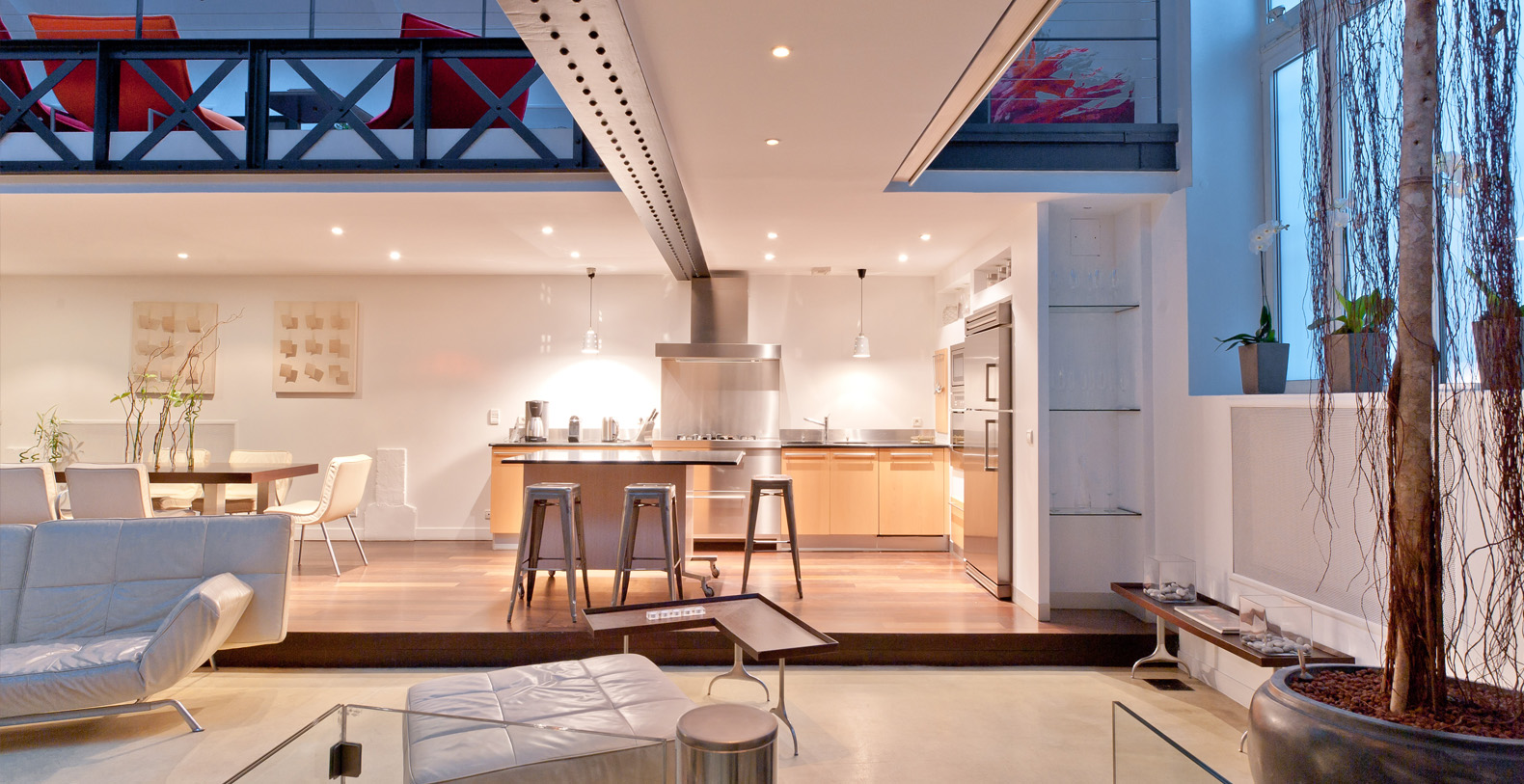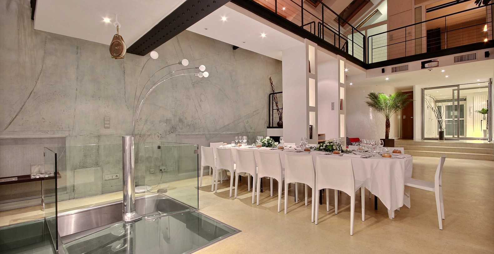Originally a 19th Century Industrial Printing House built by Gustav Eiffel, the Designer Lofthas been transformed into an exclusive, contemporary loft space, offering a warm atmosphere and modern facilites for professional or residential use. Designed to be modular according to differing requirements, the property offers diverse spaces that can be adapted according to needs, including two lounge areas, a kitchen with a mobile island that can be moved if required, floating passageways and up to 4 double bedrooms that can be made up on request. Furniture can be stored or re-arranged according to requirements.