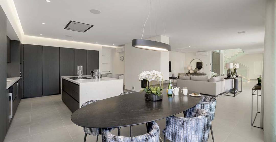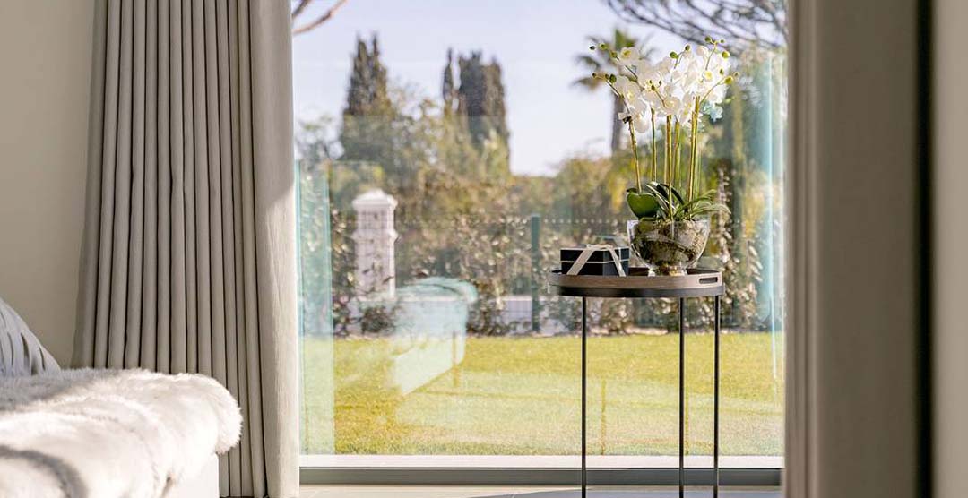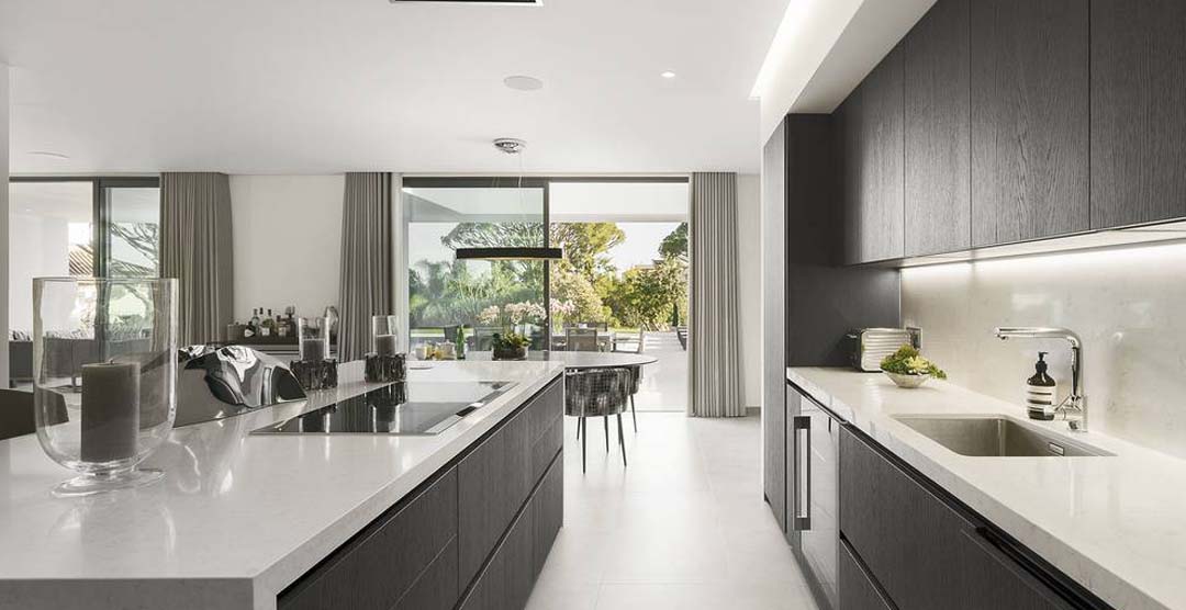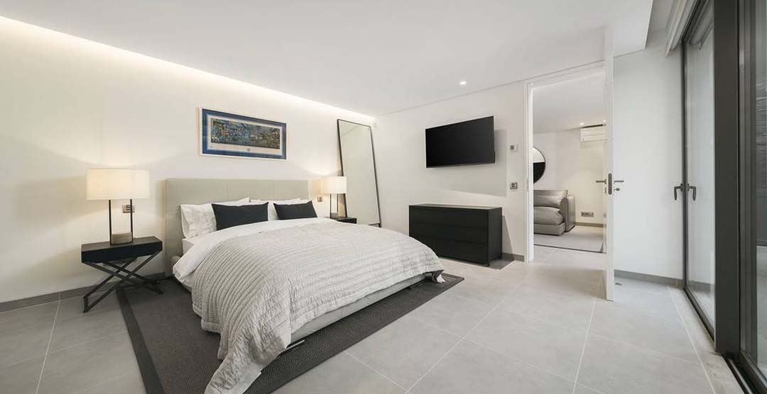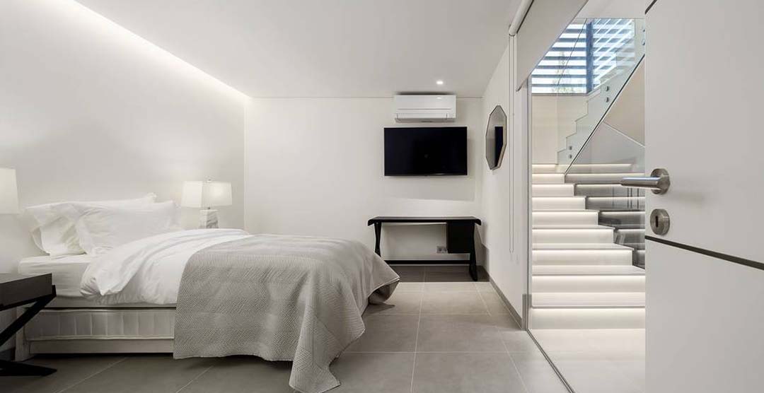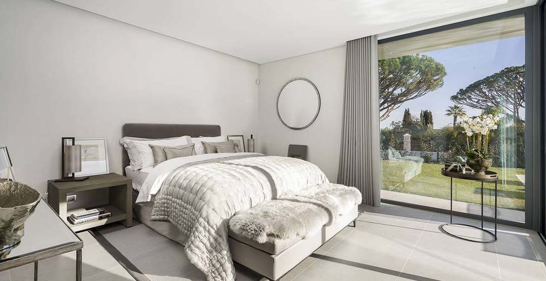 The wonderful living room is very bright and sumptuous, with large windows to the outdoor area. Still on the ground floor there is a guest cloakroom and 2 double bedrooms, both en-suite with walk in shower. On the first floor there is the master suit, with walk in shower and access to two private terraces, one of them overlooking the pool area. On the lower ground floor there is a self-contained area with two bedrooms, one double, en-suite with walk in shower and a twin bedroom with separate bathroom with walk in shower.