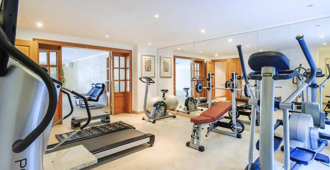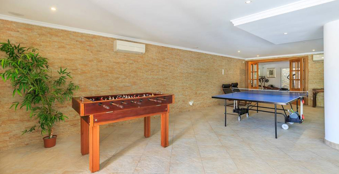 On the ground floor is a twin bedroom with doors to the terrace and adjacent bathroom with over-bath shower. Along the corridor are the steam room and gym, then into the indoor pool room, the pool is always heated so it's never too cold to swim and you can enjoy a game of table tennis or table football. Doors from the pool room open to the garden and the outdoor pool, also accessed by steps down from the first floor terrace. The pool terrace is well furnished with comfortable loungers and the pool has Roman steps in the shallow end, set in lovely gardens with lawns and borders with exotic shrubs give privacy.