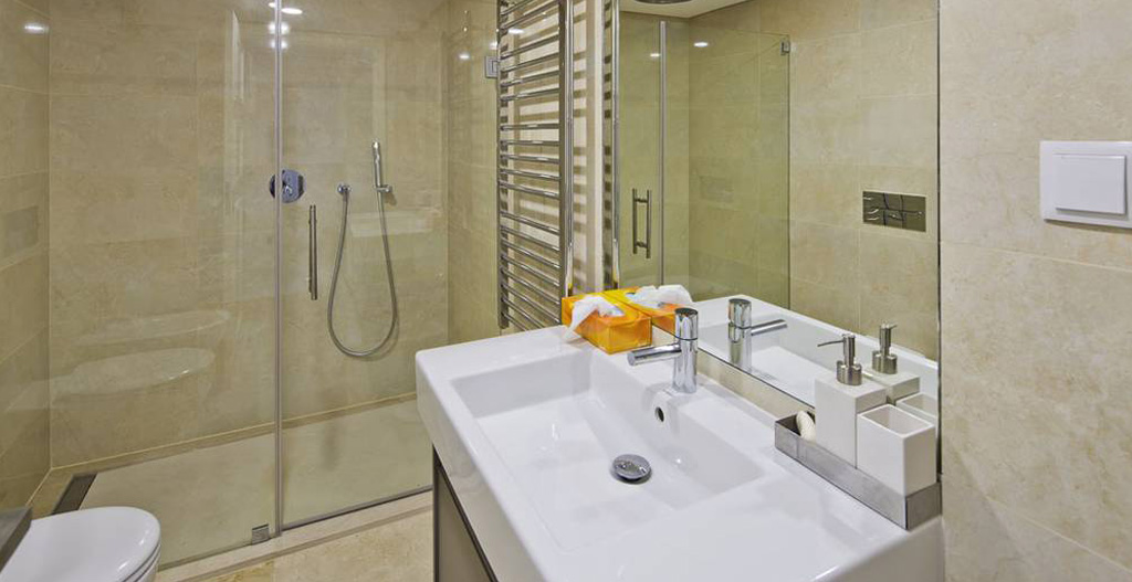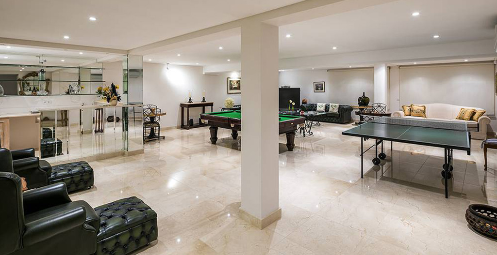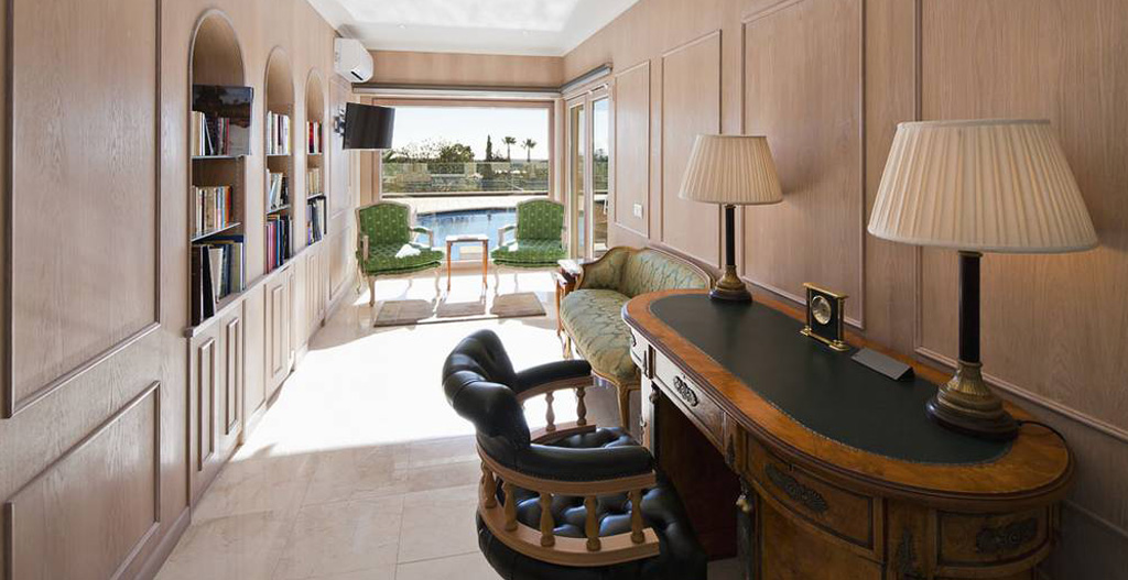 As you go in through the main front door, you realize that the villa has an exquisite decoration. From here you can access different parts of the property such as the kitchen, the main living/dining area, an office and 3 of the bedrooms. On the right side of the entrance hall you can also find a cloakroom.