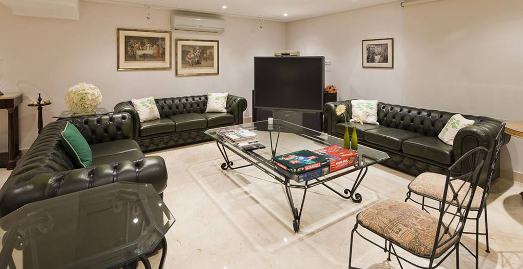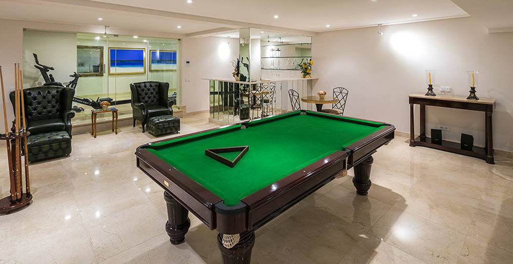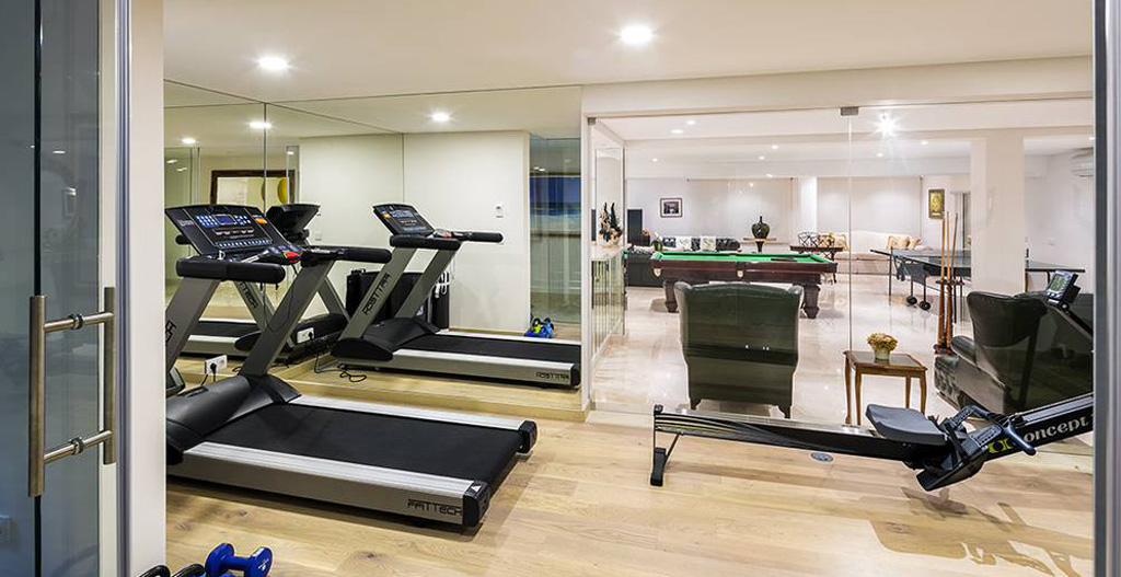 Going up the stairs or by the lift on the corridor from the entrance hall to the kitchen you can access the roof terrace, where there is worktop with a sink and a gas barbecue. On this terrace there is also a jacuzzi. From here you can benefit from a beautiful view of the nature reserve and the sea which looks spectacular at sunset. Going down the stairs or by the lift you will be able to find the garage and laundry area, a well equipped gym surrounded by glass, you can reach the other three bedrooms, two en suite and one with a separate shower room and an open space combining a games and bar area and a huge screen TV. The games room has a tennis table and a snooker table.