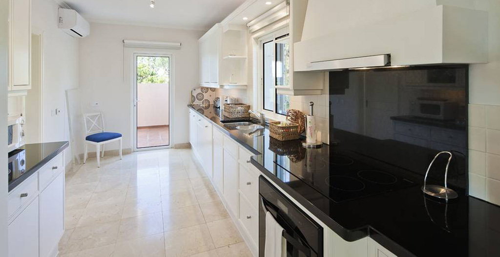 The corridor that leads you to the kitchen has a lift and also stairs so you can reach the first floor and the lower floor. The kitchen is fully fitted and equipped with an American style fridge/freezer, a dishwasher, coffee maker and a microwave. From the kitchen you can access the exterior where you will find a babecue.