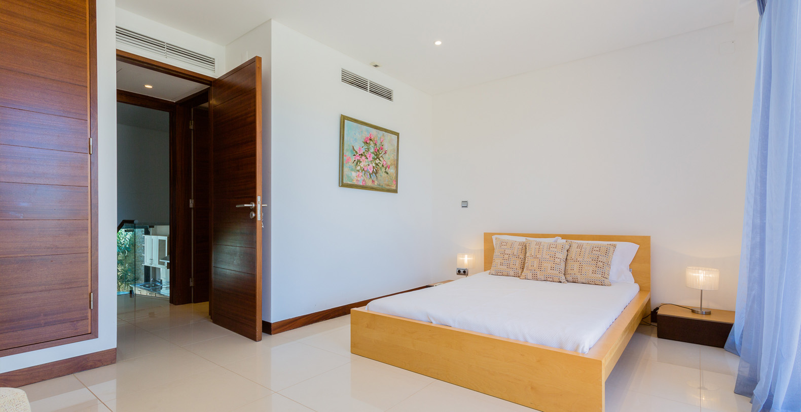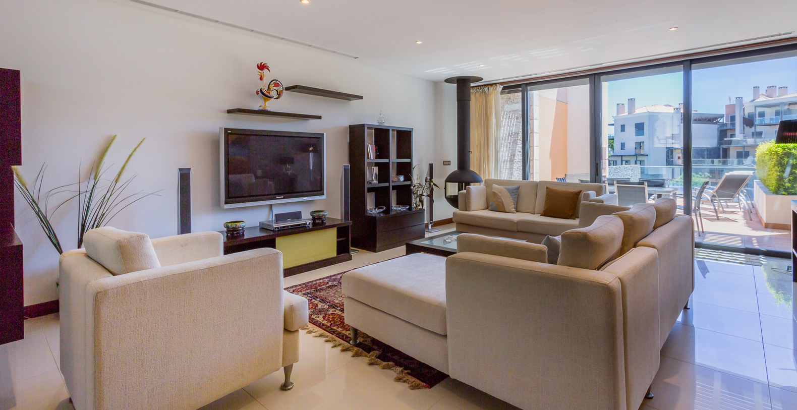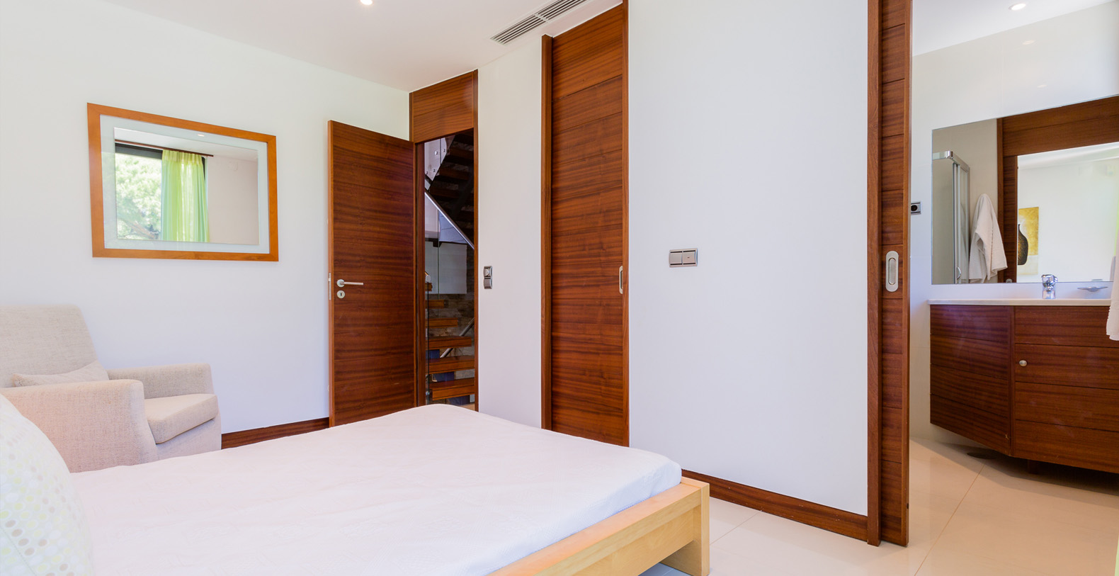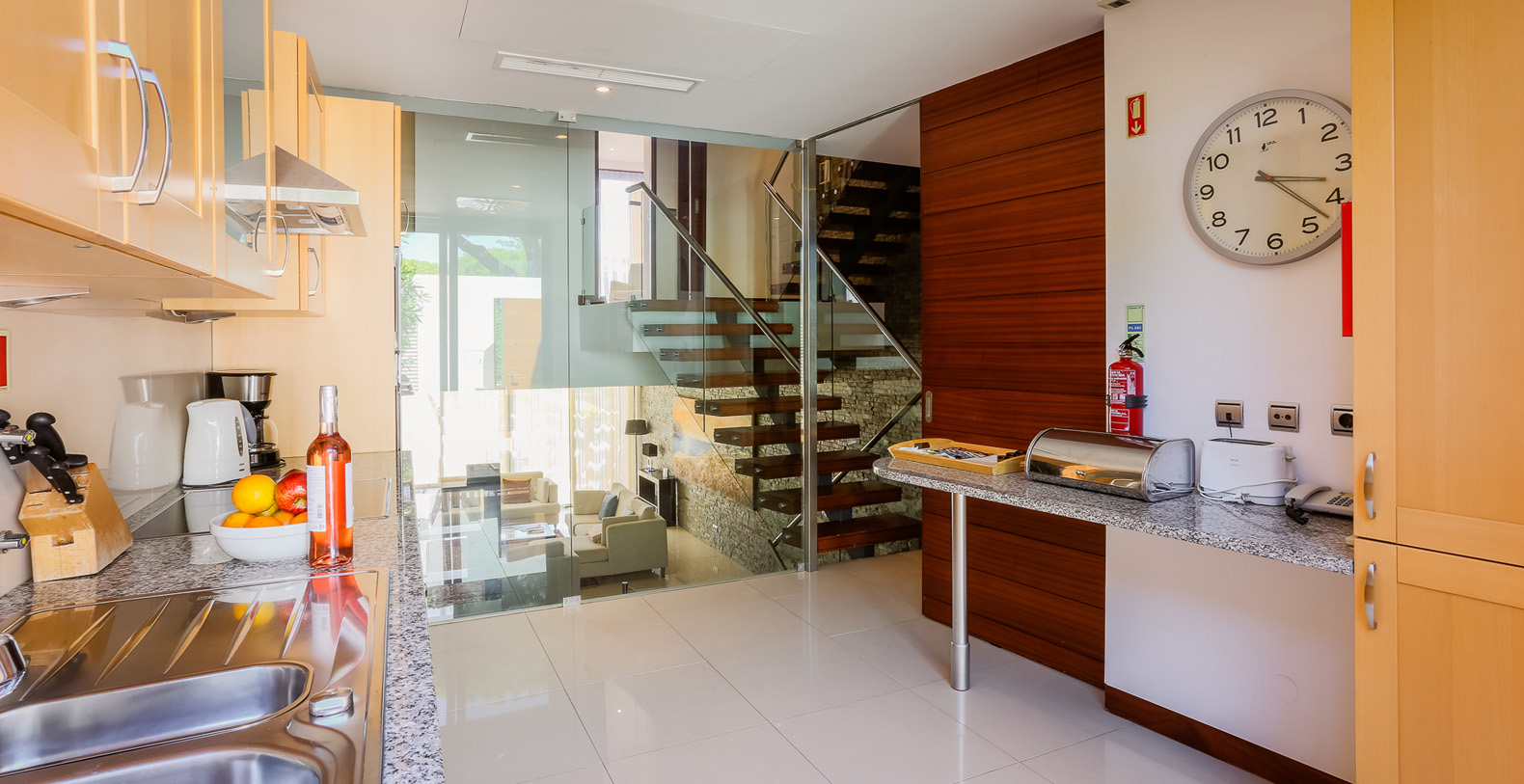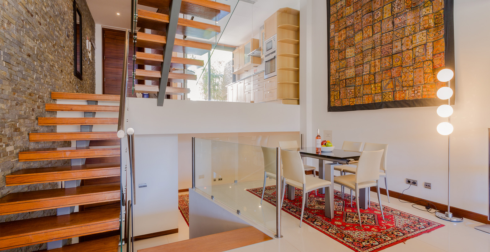 Luxuriously furnished and decorated, the villa has a dramatic interior; set over several open-plan levels with open tread, wooden stairs between levels and walls of glass, there’s wonderful light and space and delightful views through the main living areas, and private terraces to two of the bedrooms.