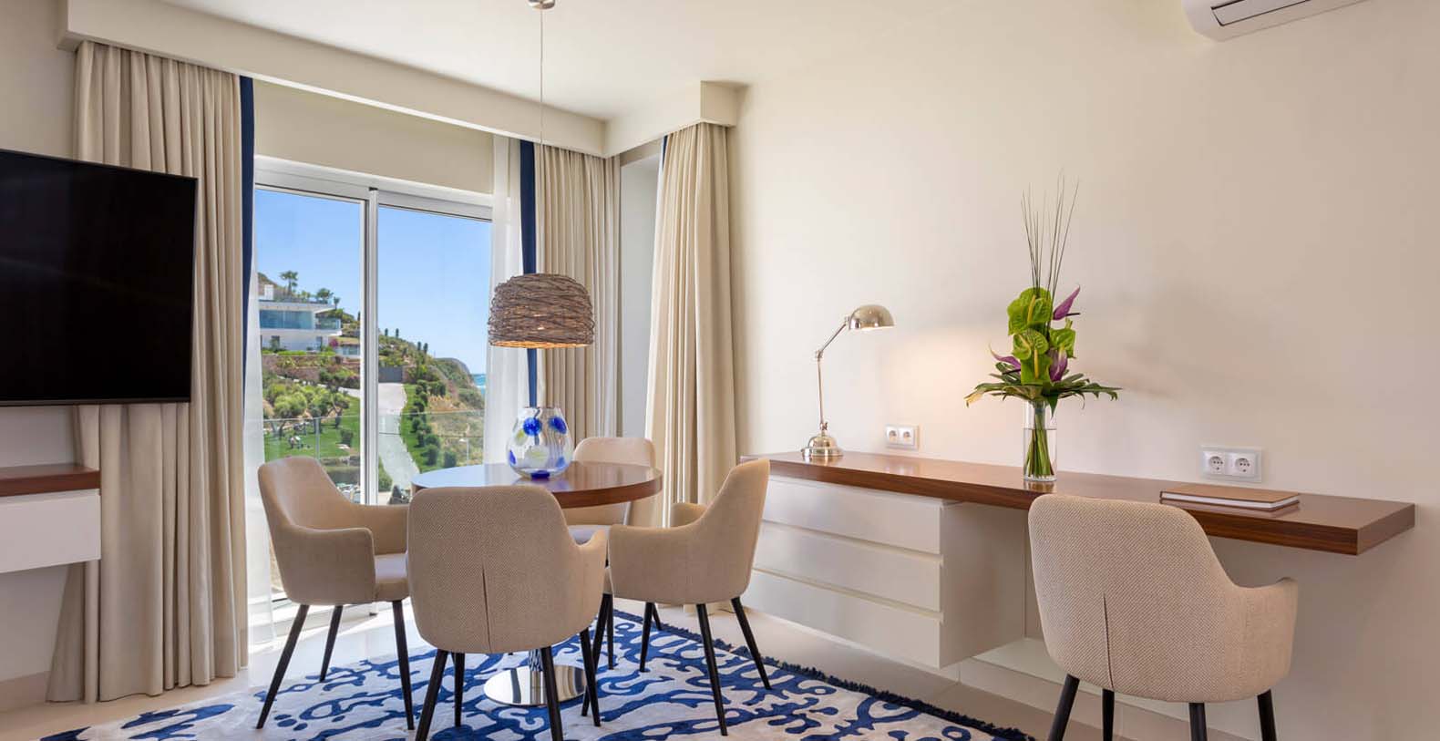 Open-plan bedroom and living room with en-suite modern shower. Small dining area for two persons. Working desk and sofa.
