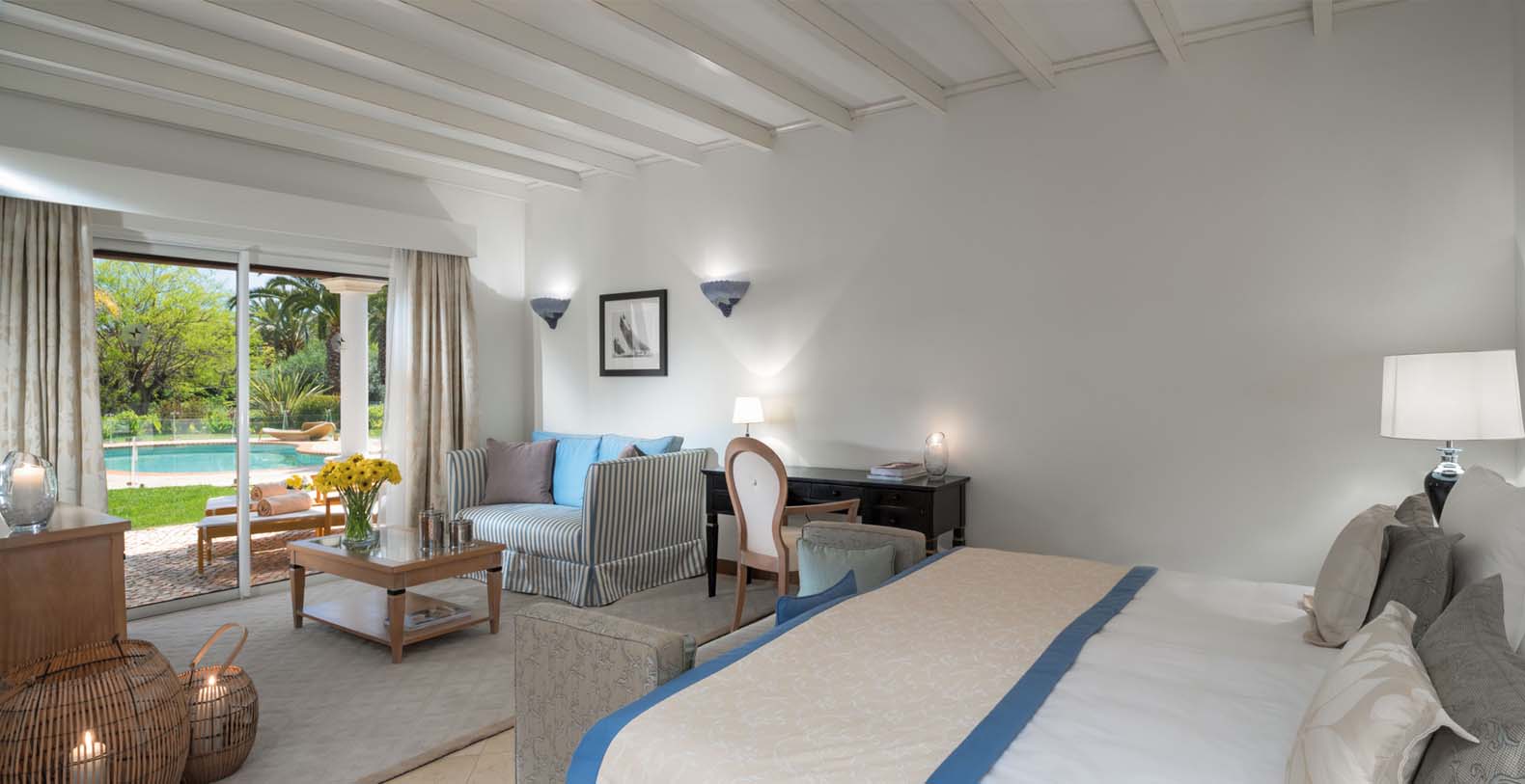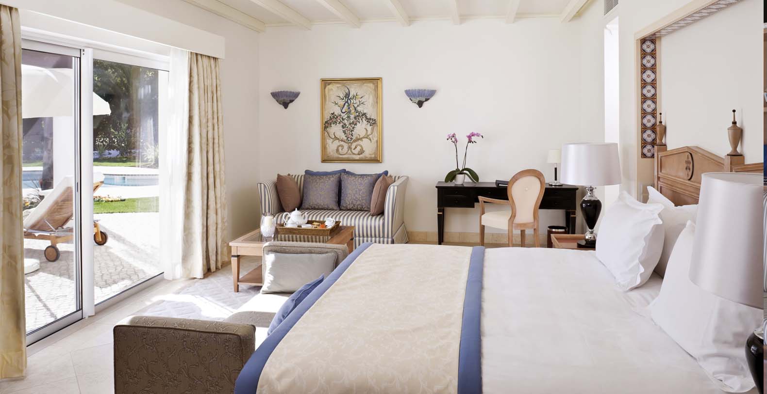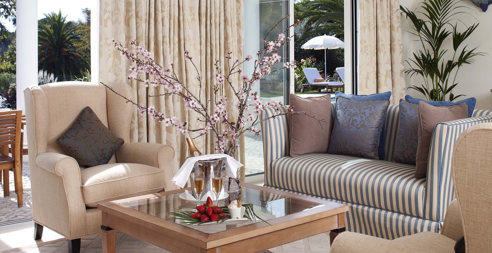 Each of the elegant bedrooms offers a large luxury bathroom and walk-in closet, complemented by a comfortable lounge with a private terrace leading on to the gardens and views across the Atlantic Ocean.