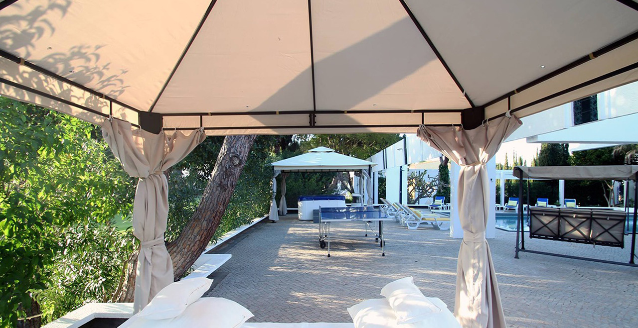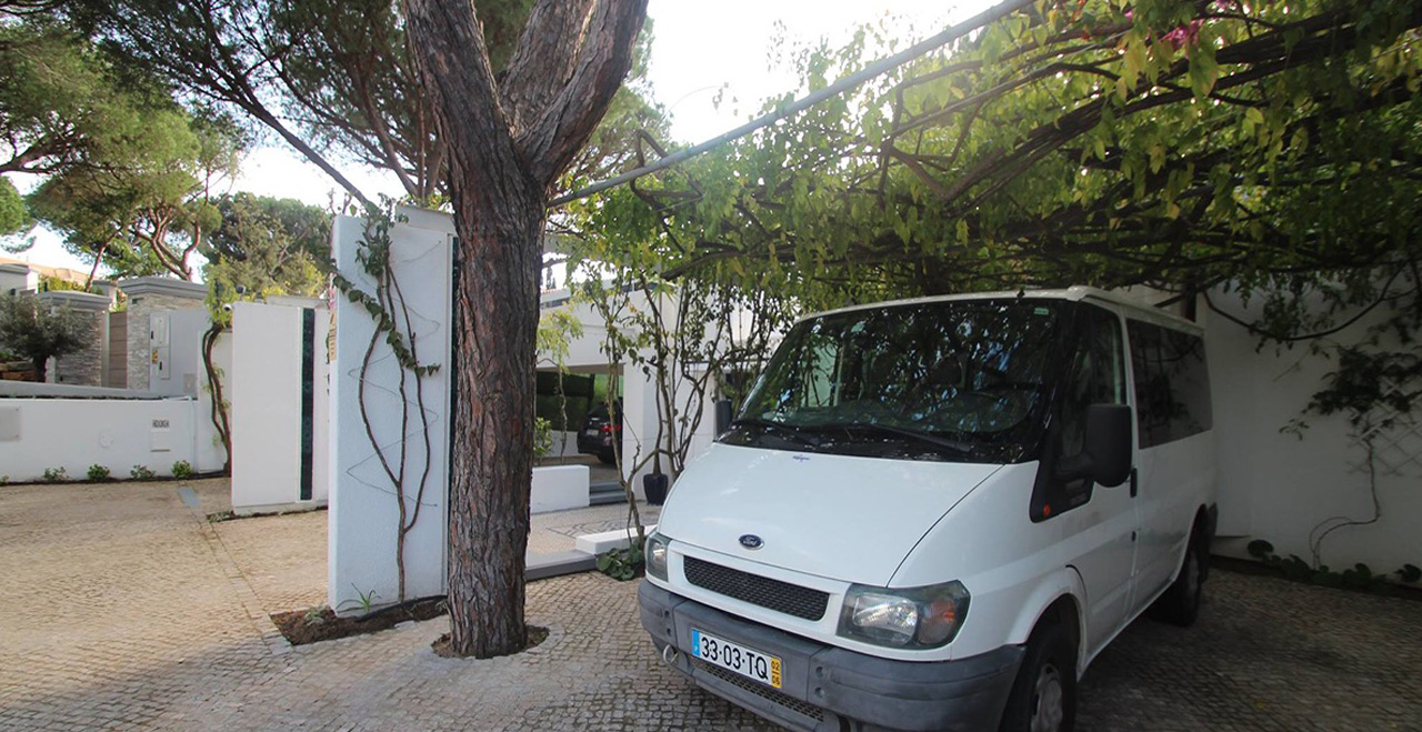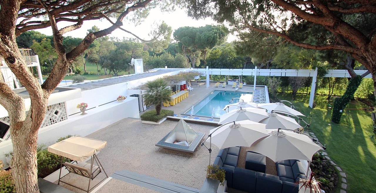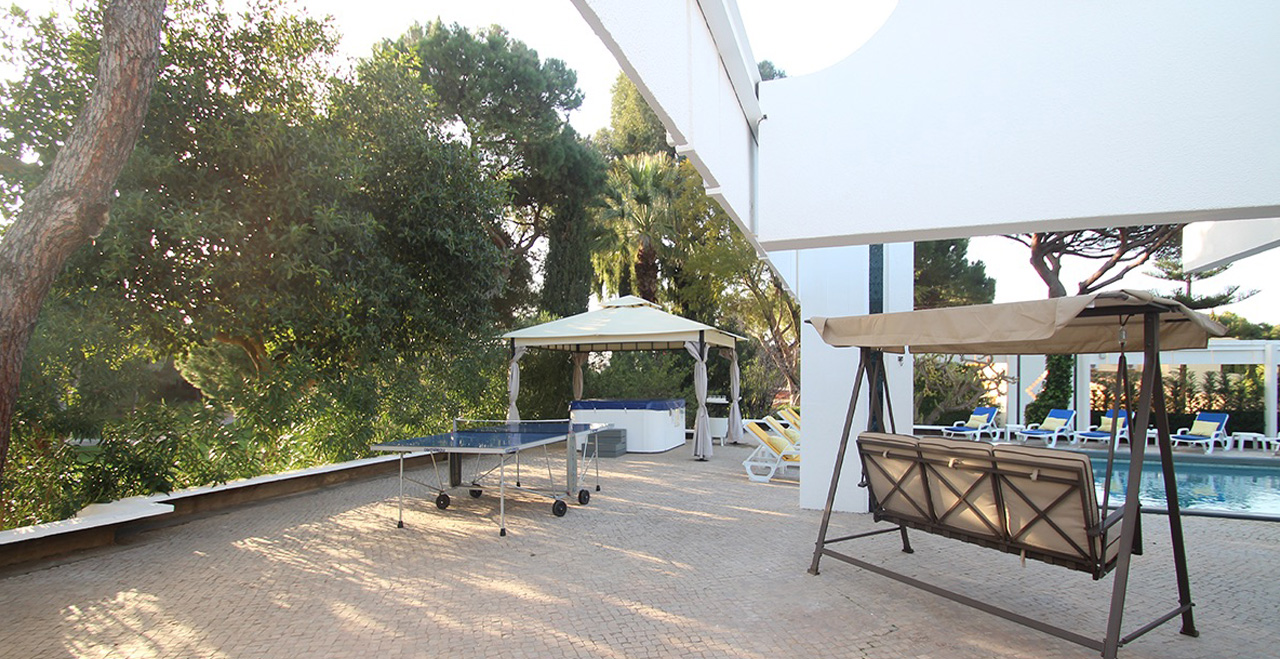 Villa Andreia is a very large one of a kind fully licensed 9 bedroom holiday rental villa located in most prestigious area of Vilamoura. The villa sleeps up to 22 adults + 3 infants. The villa is just a 25 minute drive from Faro airport and 3 minutes by car (courtesy 9 seater van included on the rental price) to the beach or 25-30 walk and the famous Vilamoura's Marina. Two of the five golf courses available in Vilamoura are also just a 10 minute walk from the Villa and Villa Andreia faces the fairway number 2 of Vilamoura's "Old Course". 4 minutes walking from the villa there is also a sports bar/restaurant where you can enjoy all kinds of land sports drinks and meals. A Michelin star restaurant and one of the most reputed SPA's in the Algarve are also just a short walk from the Villa. A small supermarket can be reached within a 15 minute walk and larger supermarkets can be reached within a 5 minute drive. Set in a 3200 square meter plot and with total inside area of 950 square meters. Of the 9 bedrooms, Villa Andreia has 3 rooms that offer several different configuration options (twin, double, triple and quad (4 single beds).