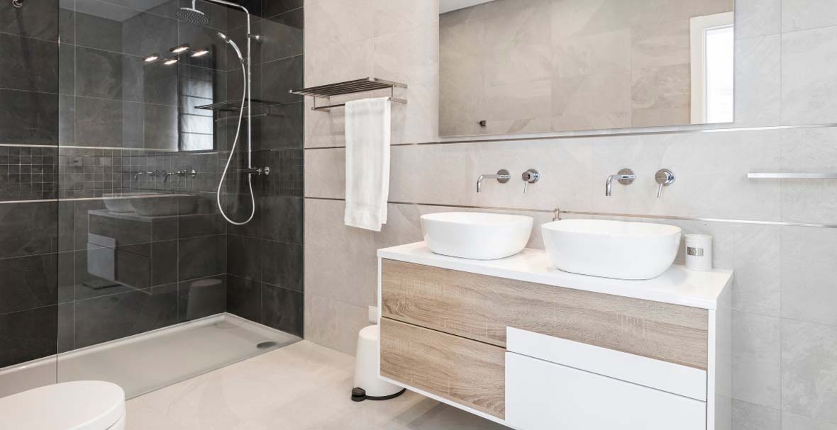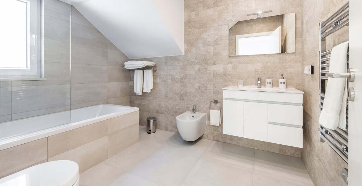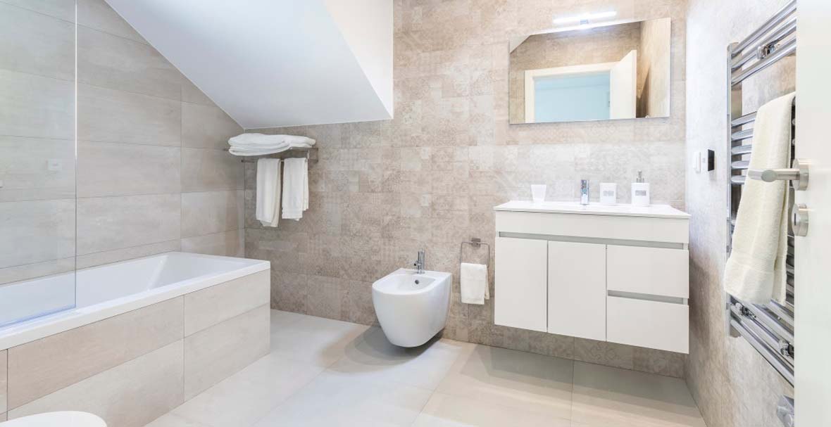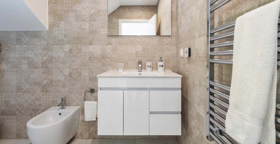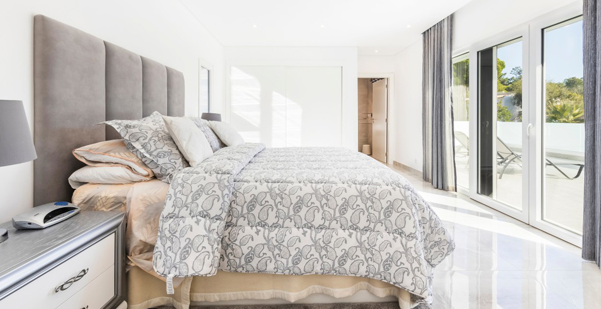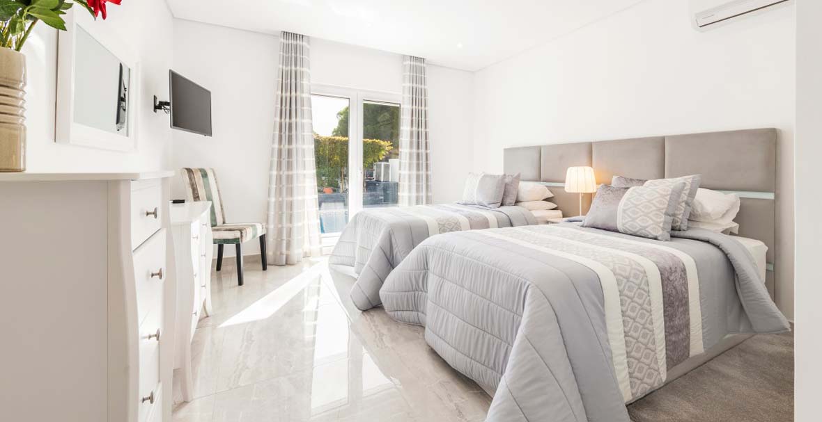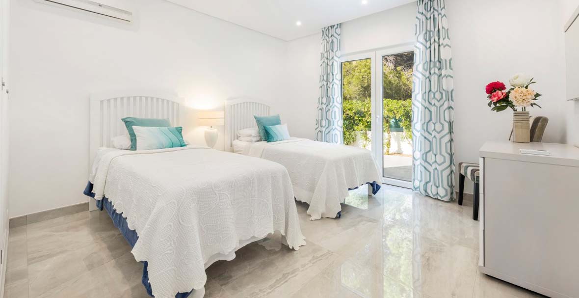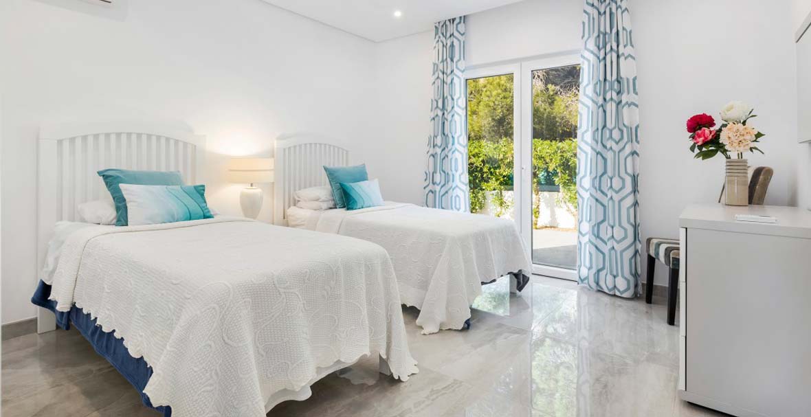 Bedroom 1 has a twin bed with patio doors to terrace bathroom ensuite. Bedroom 2 has twin bed with ensuite bathroom