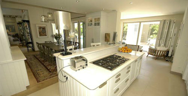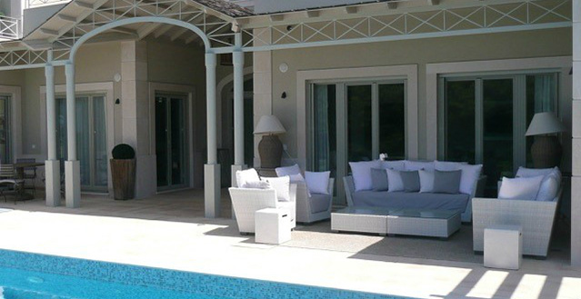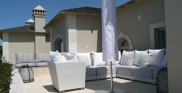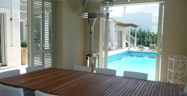 The German designed fold back glazed units open up the entire space achieving a very clever indoor / outdoor feeling to the entire ground floor of the property.The Italian designed Gervassoni external furniture on the various terraces at ground and first floor level provide those renting the property superb external spaces in which to relax and appear to be a natural extension of the interior design. The heated 10 meters pool with electric cover is surrounded on four sides by idyllic relaxation and dining areas. The pool pavilion with its sensational views to the beach provides a covered dining area comfortably seating 10 and has a flat screen TV and gas fire for those who wish to avail of either. The BBQ entertainment area is discreetly positioned to the rear of this pavilion.