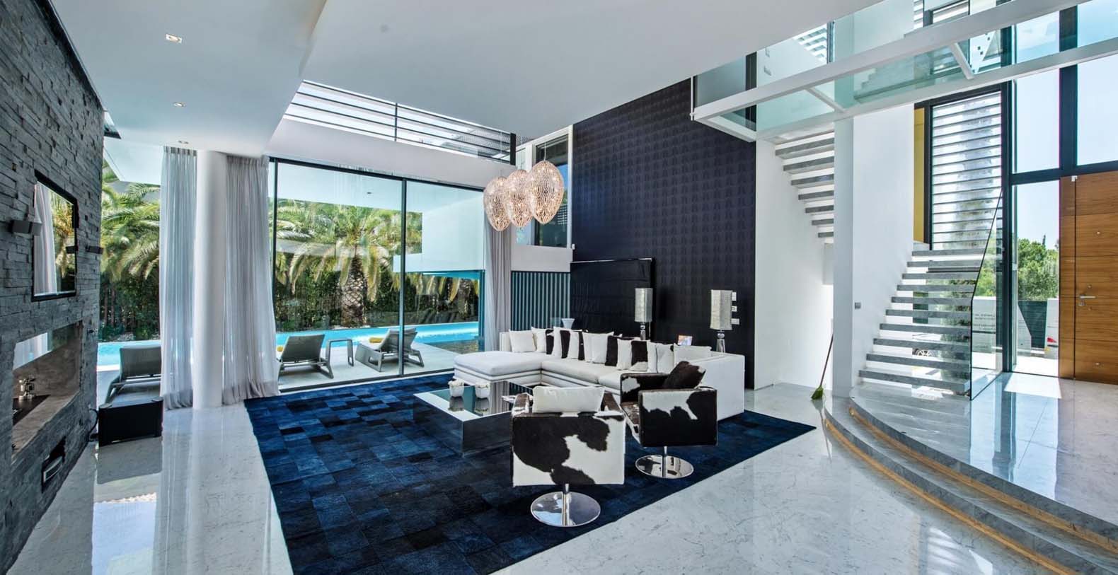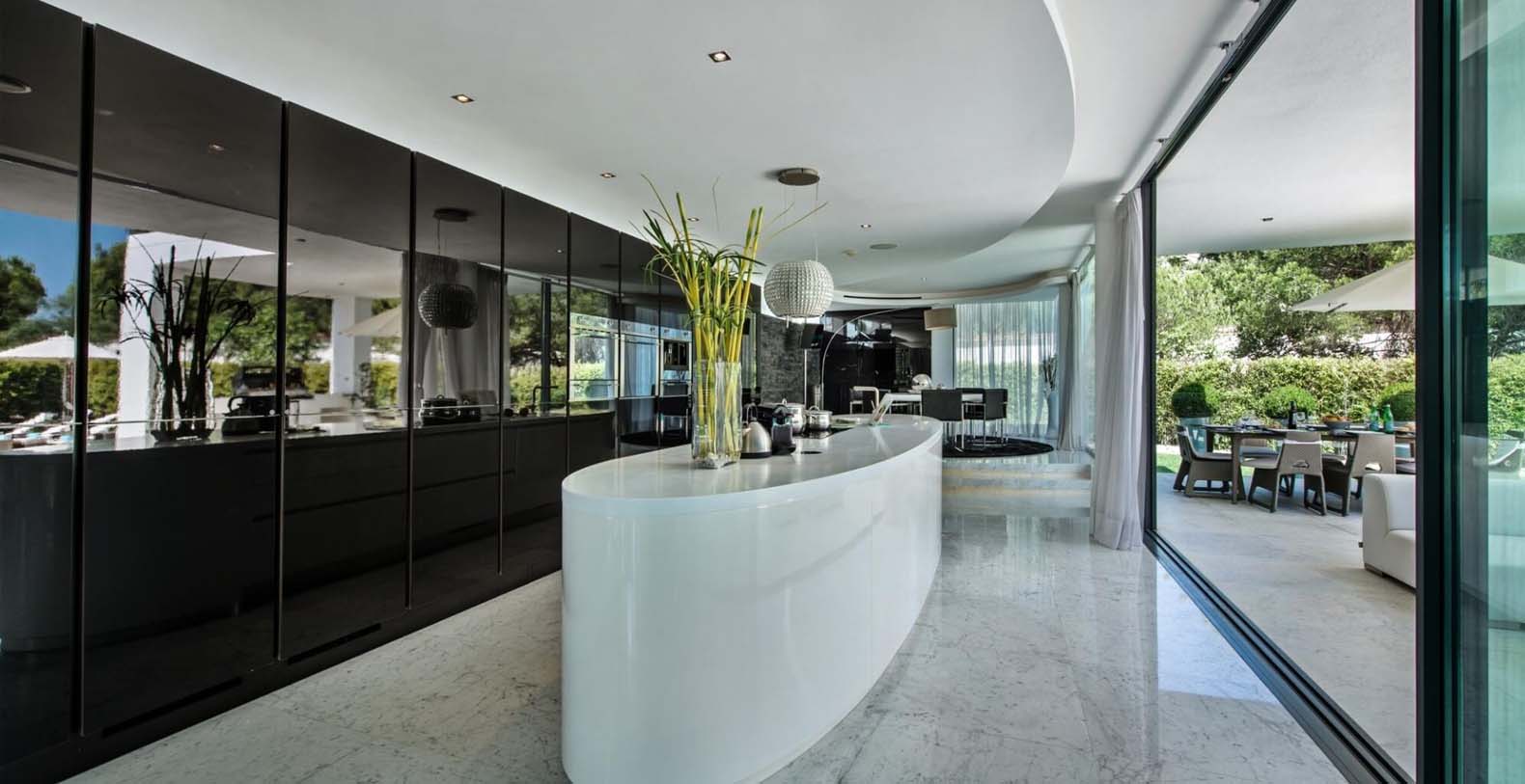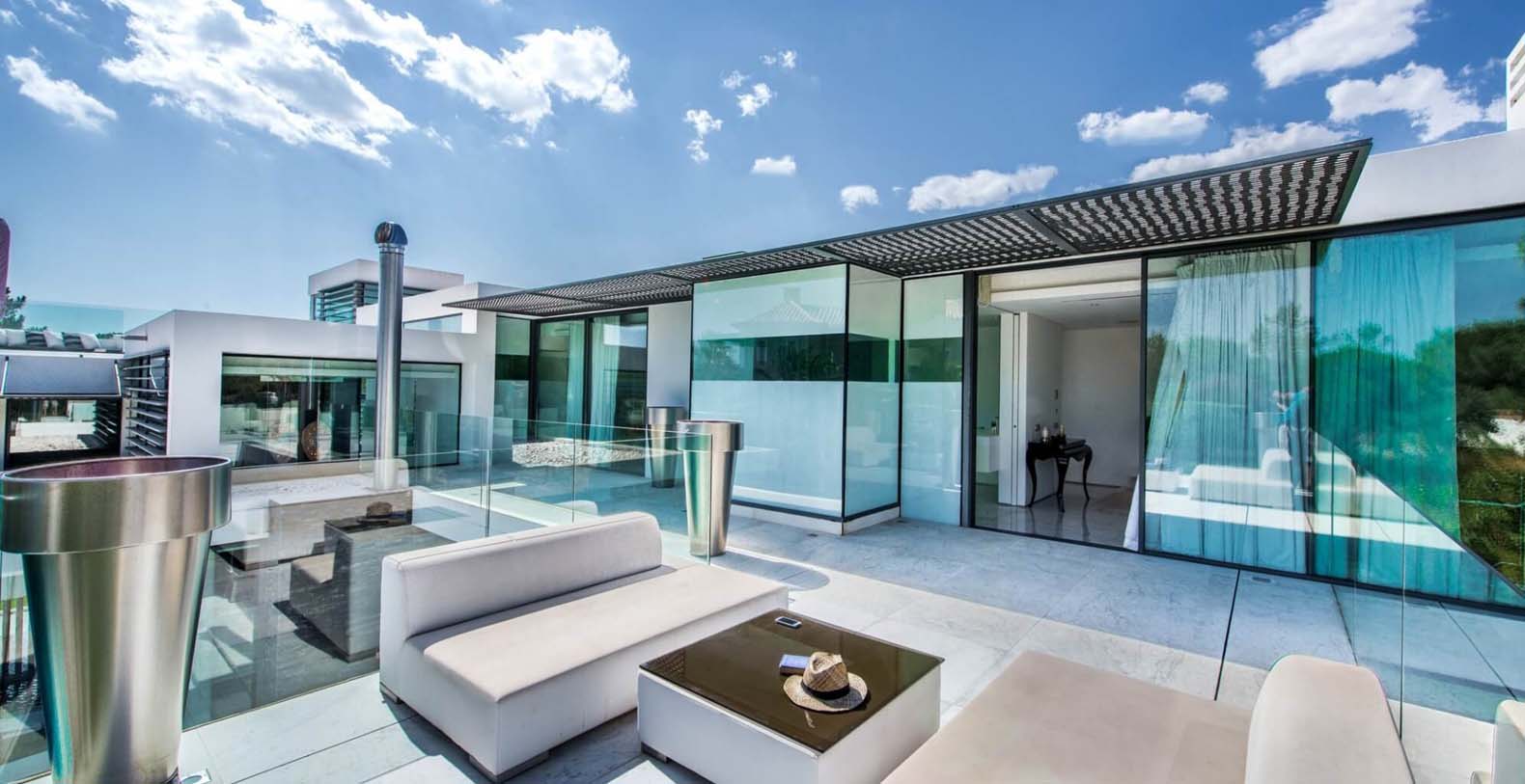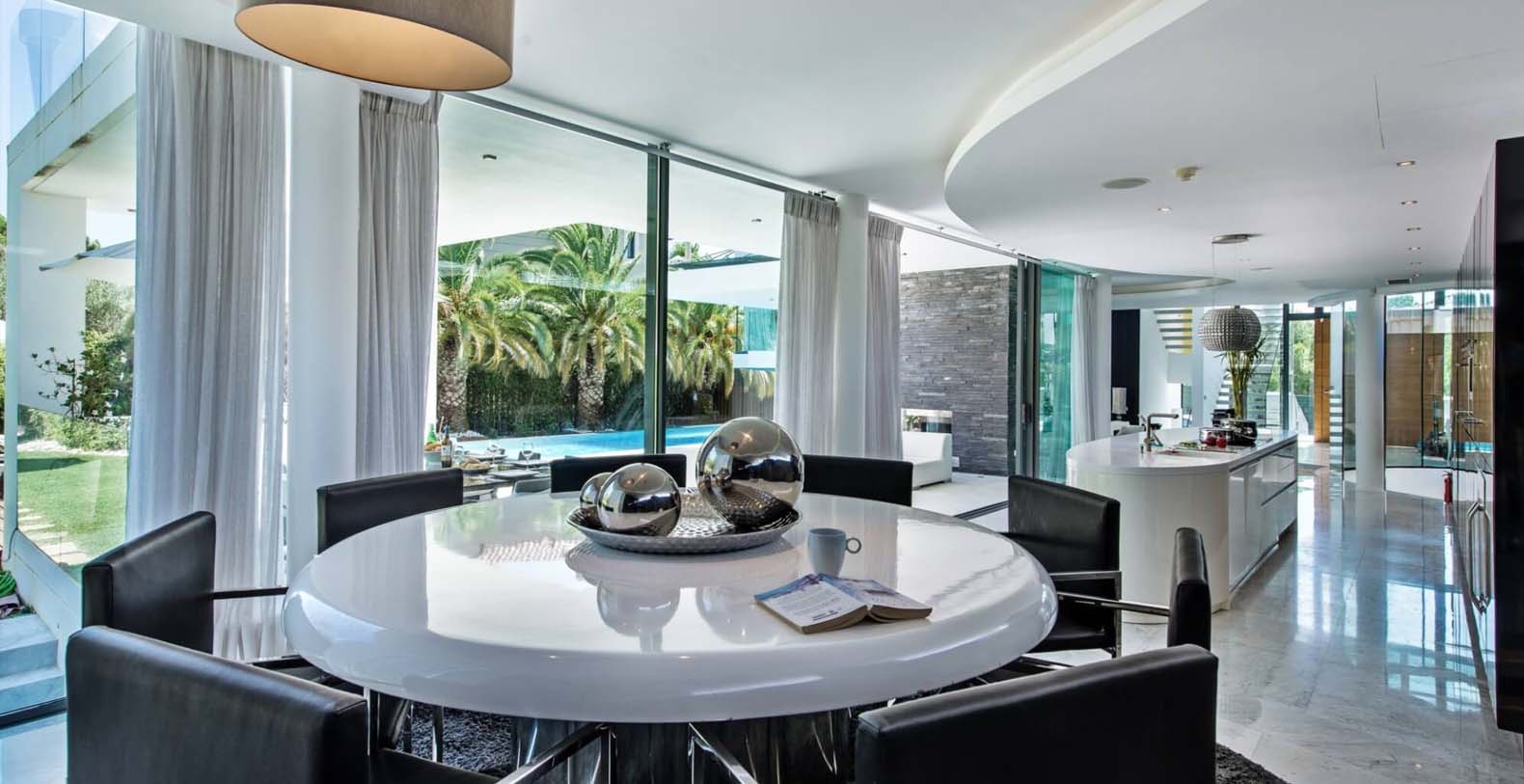 The interior is spacious, open plan and modern, exuding subtle and sophisticated elegance. The spacious sitting room offer confront and elegance, the expansive dining room table seats 8 with similar capacity for outdoor dining on the terrace, and the four contemporary bedrooms all have bathrooms en suite and open out onto patios, terraces and the pool. The lower level of the villa also has a large games room with a spectacular pool window brings in light, a home cinema room, spa area with steam room and garage. The furnishings throughout are of the highest quality and standard. The roof terrace has a Jacuzzi and the terraces offer great views to the surrounding hills.