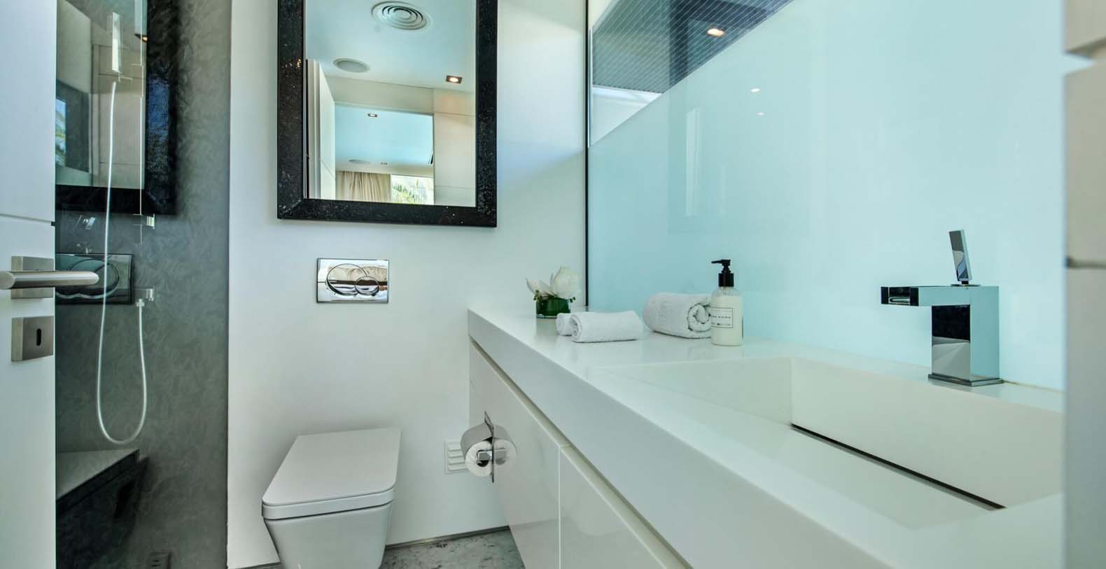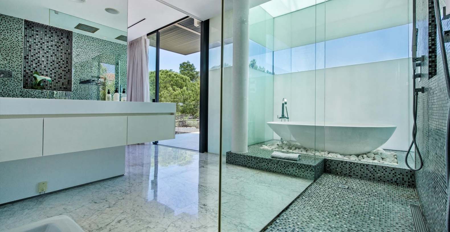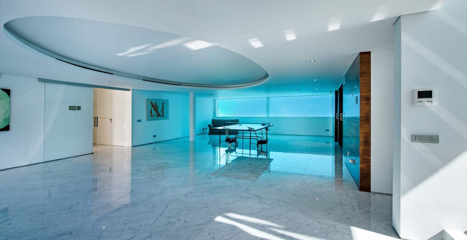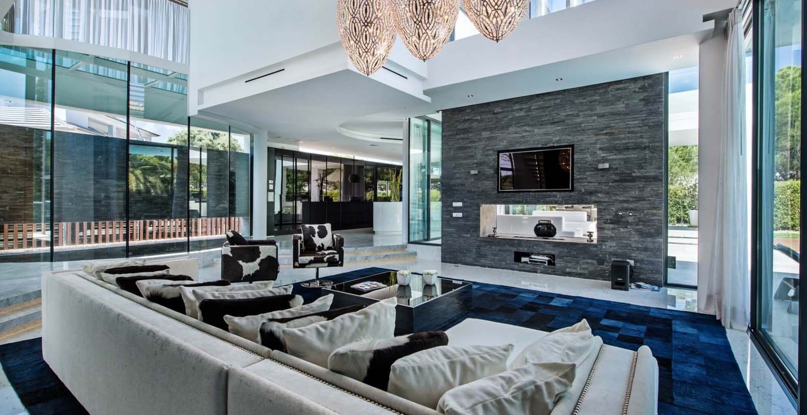 The interior is spacious, open plan and modern, exuding subtle and sophisticated elegance. The spacious sitting room offer confront and elegance, the expansive dining room table seats 8 with similar capacity for outdoor dining on the terrace, and the four contemporary bedrooms all have bathrooms en suite and open out onto patios, terraces and the pool. The lower level of the villa also has a large games room with a spectacular pool window brings in light, a home cinema room, spa area with steam room and garage. The furnishings throughout are of the highest quality and standard. The roof terrace has a Jacuzzi and the terraces offer great views to the surrounding hills.