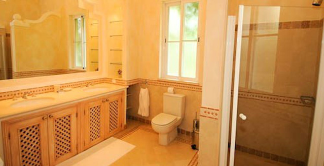 Outside next to the kitchen is the charcoal barbecue.On the ground floor there are two bedrooms, all with e-suite bathrooms.On the 1st Floor you will find a spacious master bedroom with king-size bed, walk-in wardrobes, en-suite bathroom (bath and shower) and leading to a sun terrace with stunning views onto the golf course and pool. The guest bedroom has views onto the front of the villa and has en-suite bathroom.