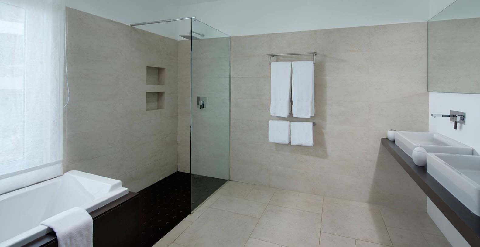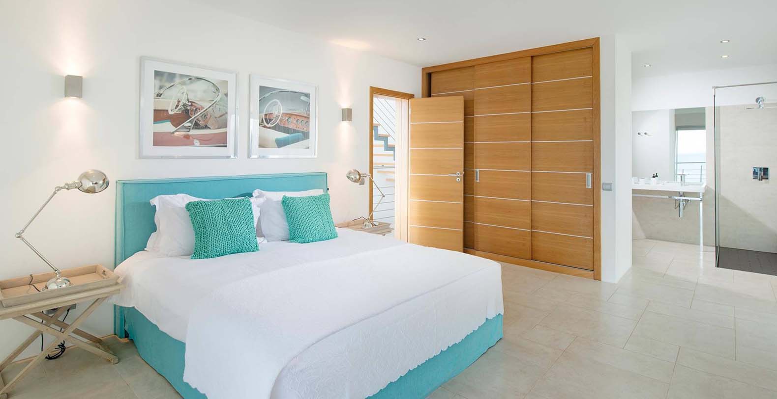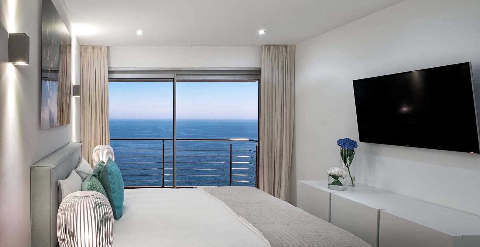 Three ocean view bedrooms with large double beds, each bedroom with en-suite bathroom (two are full bathrooms and one has a shower room) and large screen TV.