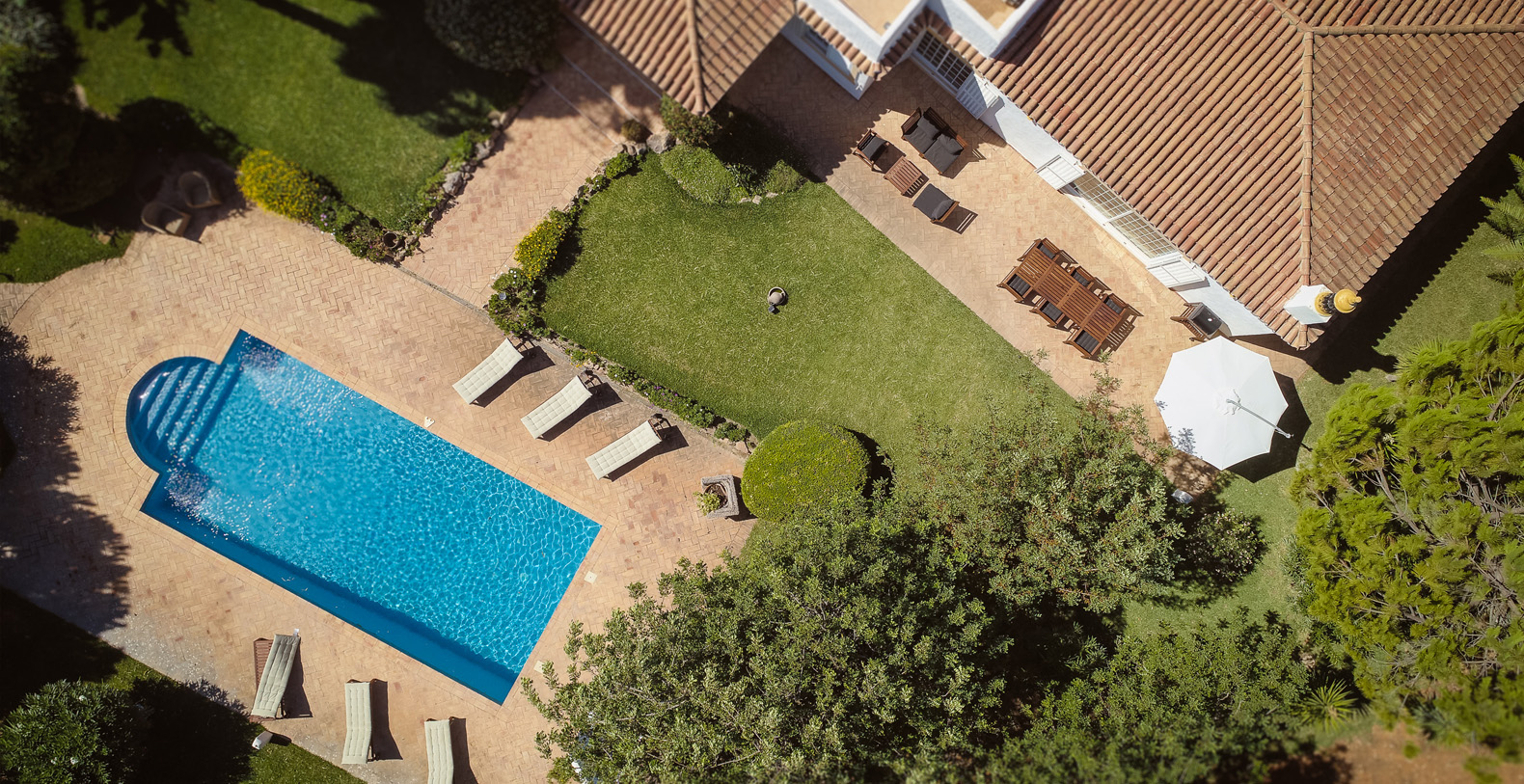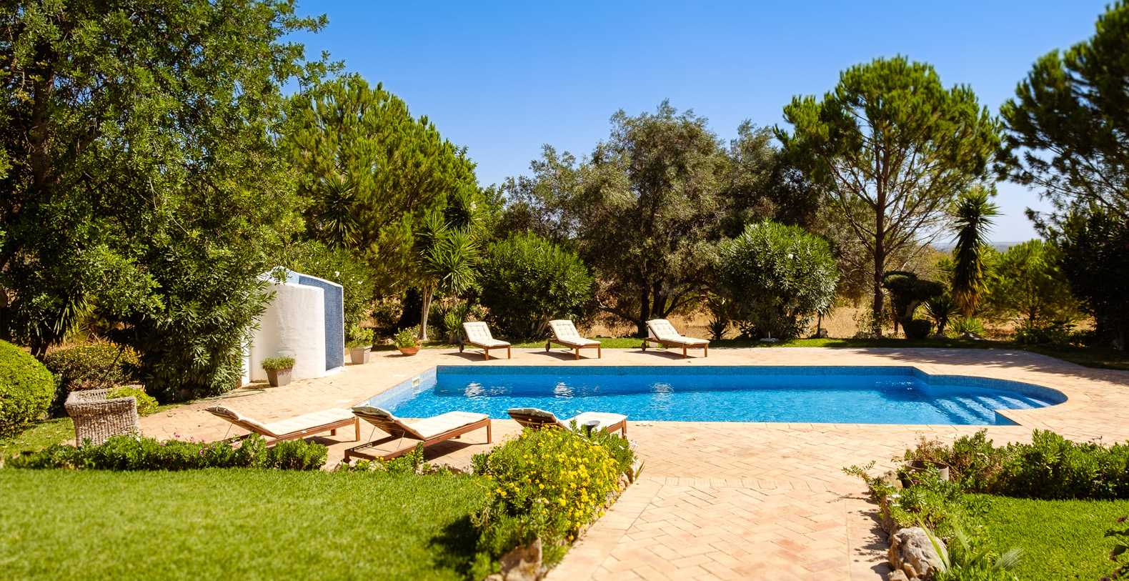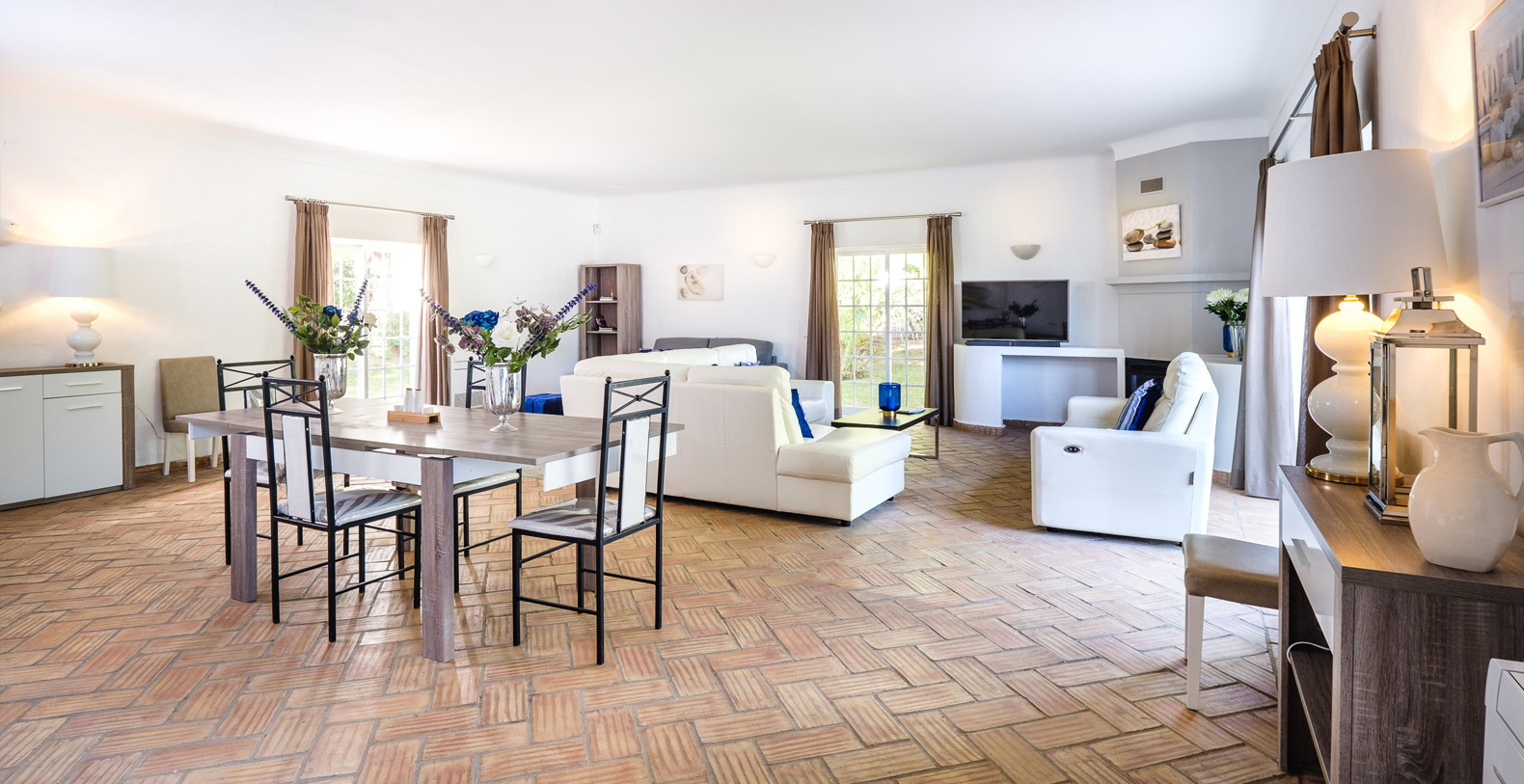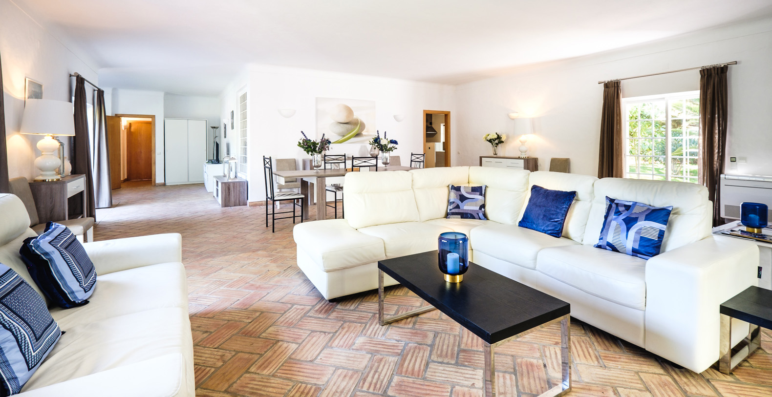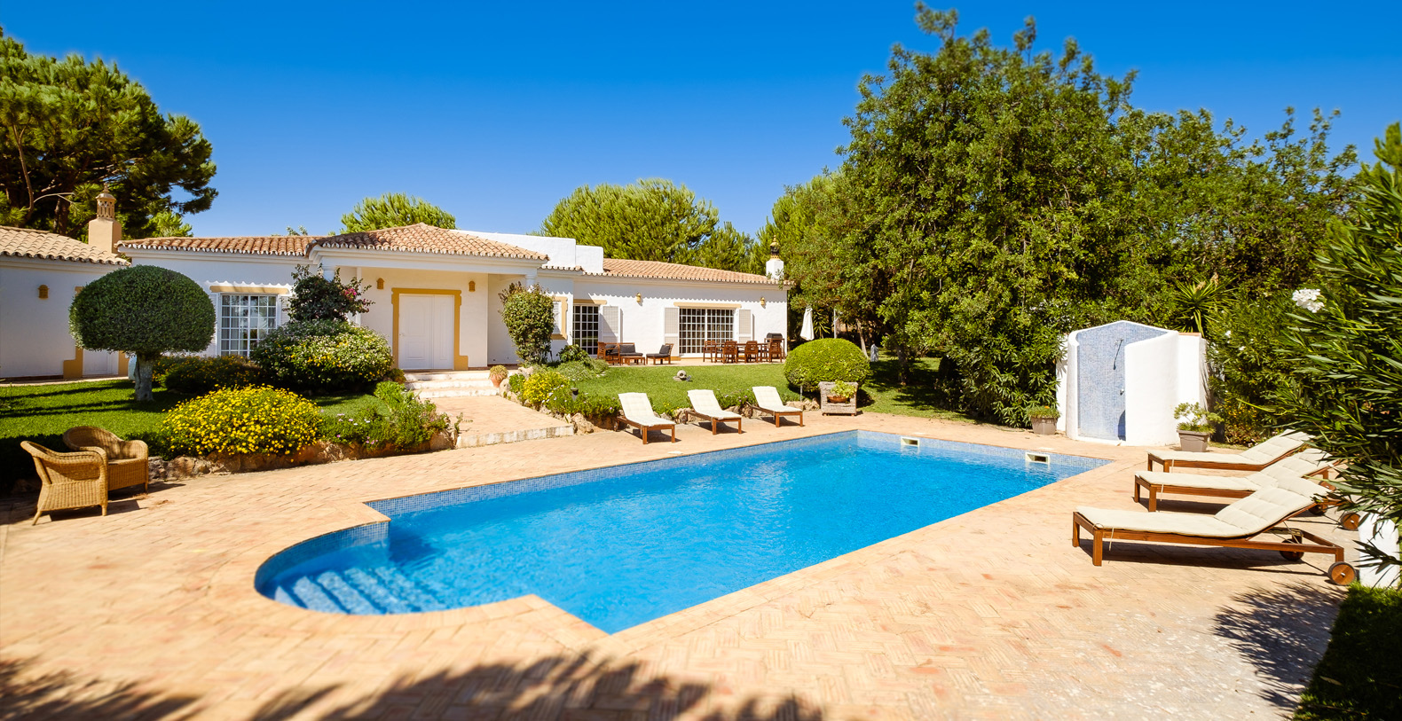 This stunning 3+1 bedroom villa offers the best of both worlds; a retreat environment in a spectacular garden oasis, yet only a 10 minute drive from the vast variety of restaurants, golf courses and entertainment of Vilamoura and Pine Cliffs 5 Star Resort. Only a 25 minute drive from the airport, Vale Do Lobo and Quinta Do Lago, Vila Moura is utterly idyllic and boasts a huge open plan living room, with a spacious dining area. The kitchen is newly installed and well equipped, and all of the bedrooms are also spacious and each have their own bathrooms. The villa is contemporary in style but with a beautiful authentic Portuguese flair, and is single storey, making it safe for children or older guests. The house benefits from an enormous terrace which winds its way around the house, offering a number of places to enjoy a glass of wine al fresco, or read a book in peace and quiet. The swimming pool is large with a terracotta terrace surround with plenty of space for sunbathing.