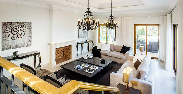 Sitting room on a lower level with open fireplace (Gas connection) accessing the external courtyard and the covered terrace, pool and garden