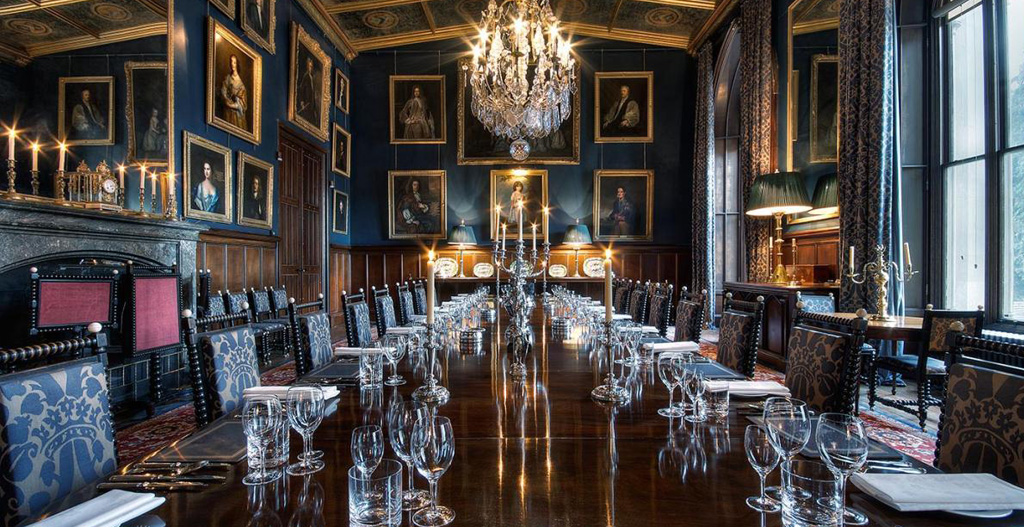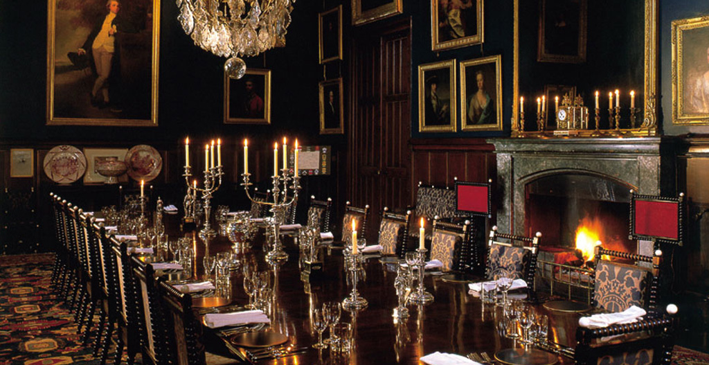 THE STATE DINING ROOM: Smirke created Gothic arches at each end of this room and over the doors. These were removed by Lady Somers in 1933, partly to create a better space for pictures. When the room was redecorated in 1990, more pictures and mirrors from elsewhere in the Castle were hung here, creating the pleasing effect which visitors can see today. Among them is a portrait of Lord Chancellor Somers - look for it in the Room Notes.