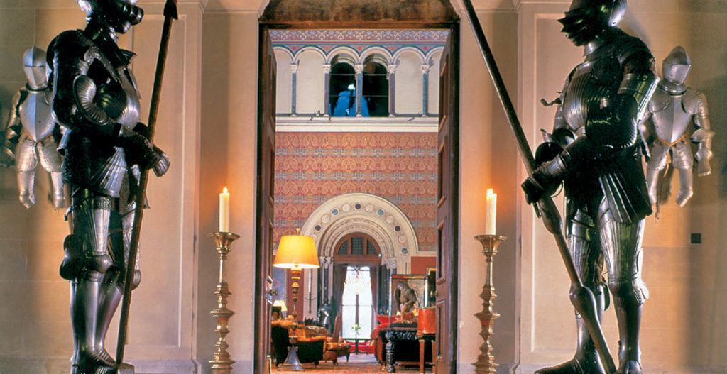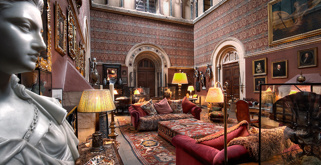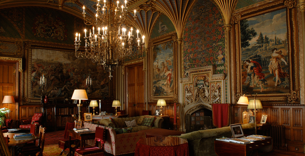 THE GREAT HALL: This impressive room was designed in the style of a medieval baronial great hall, and was plainly intended to be the heart of the Castle. A clearer impression of this is provided by a water color of 1820 - you can look for this in the rooms notes. The Great Hall is furnished today in the style of a vast Edwardian drawing room, with ottoman, sofas, armchairs and portraits.