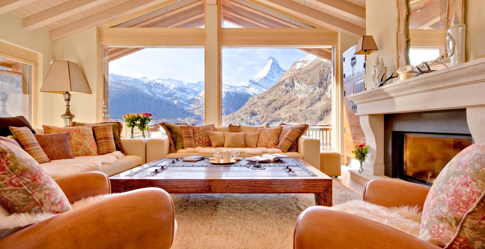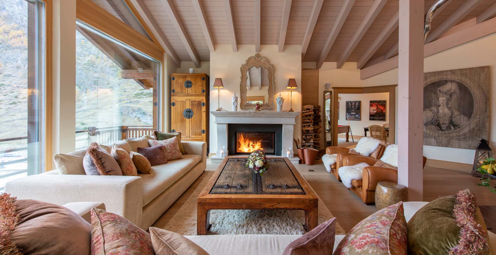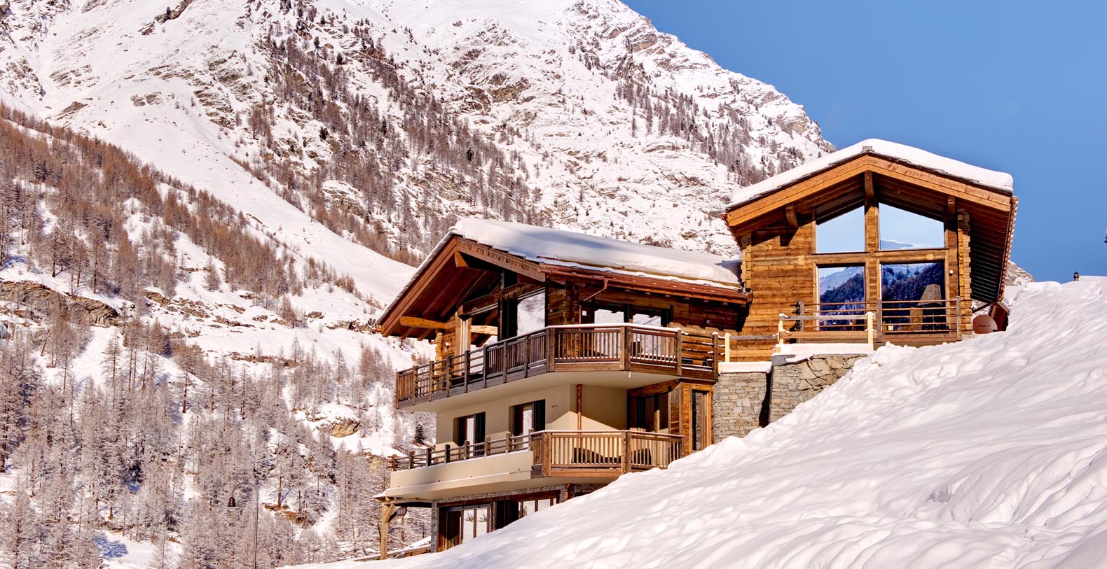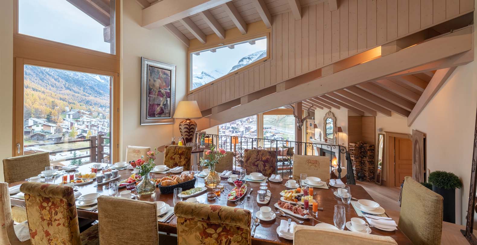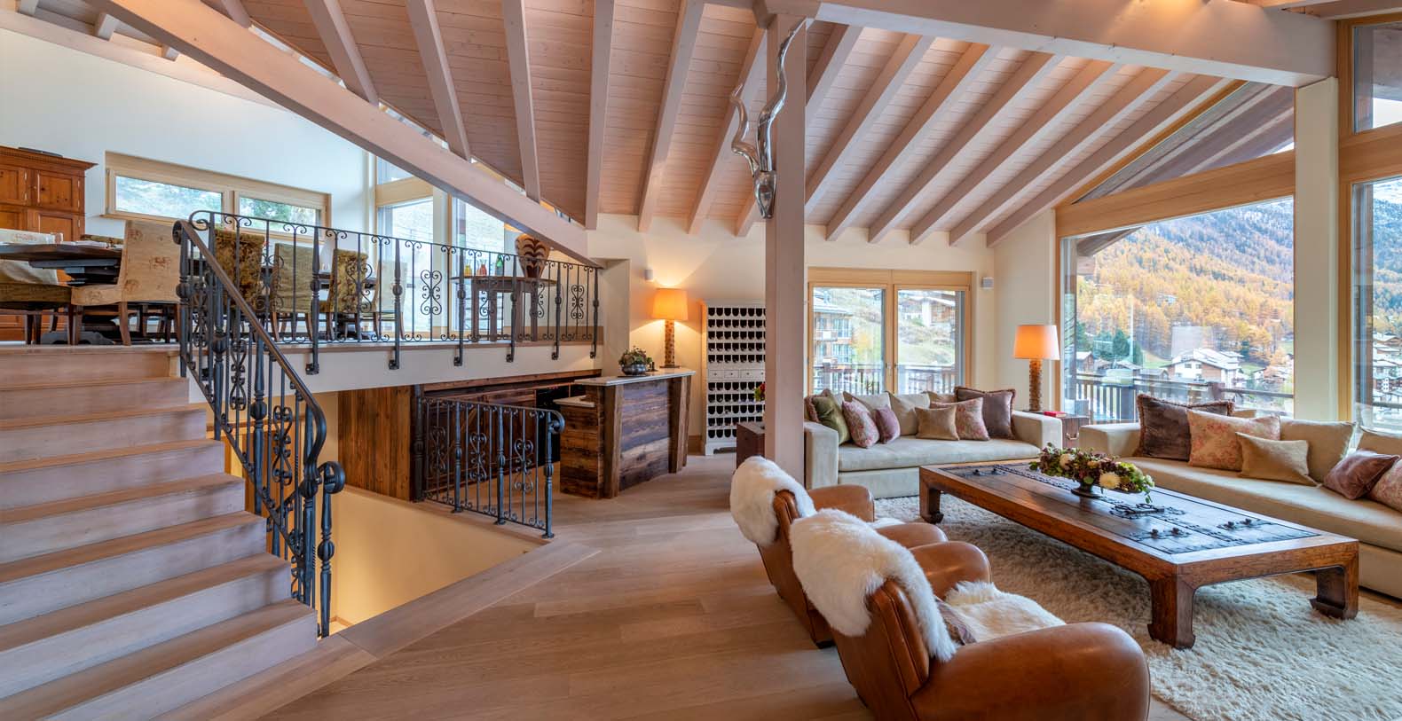 This chic and sumptuous Chalet is built to the highest standard, featuring floor to ceiling windows on all three levels, and a dramatic vaulted interior. South facing balconies capture the breathtaking scenic views of the Matterhorn and surrounding mountains.