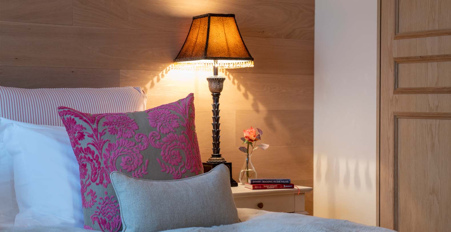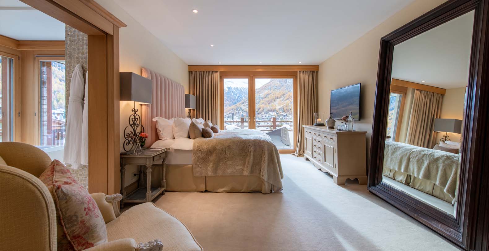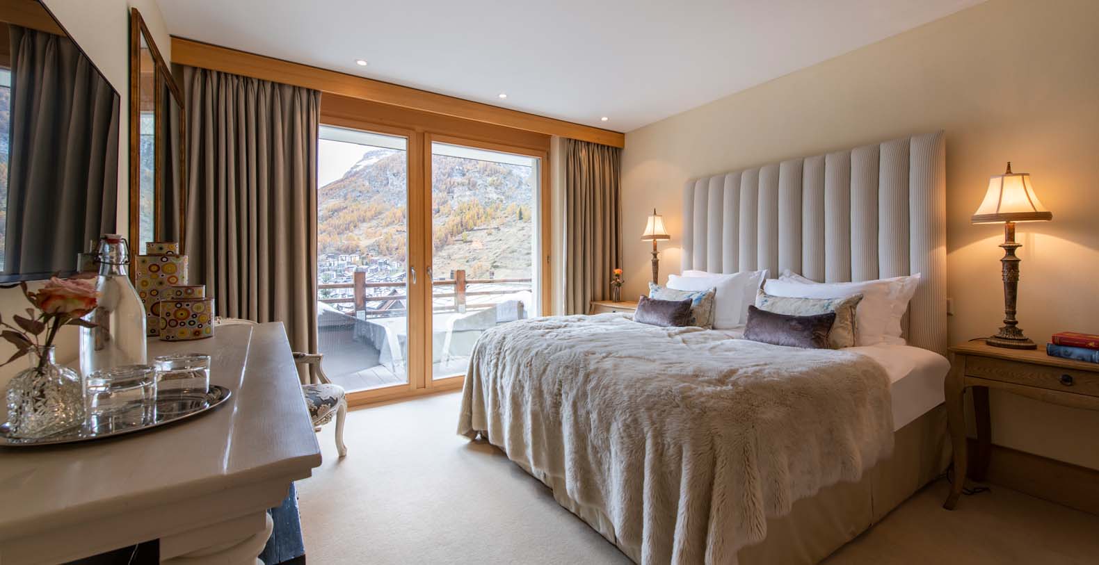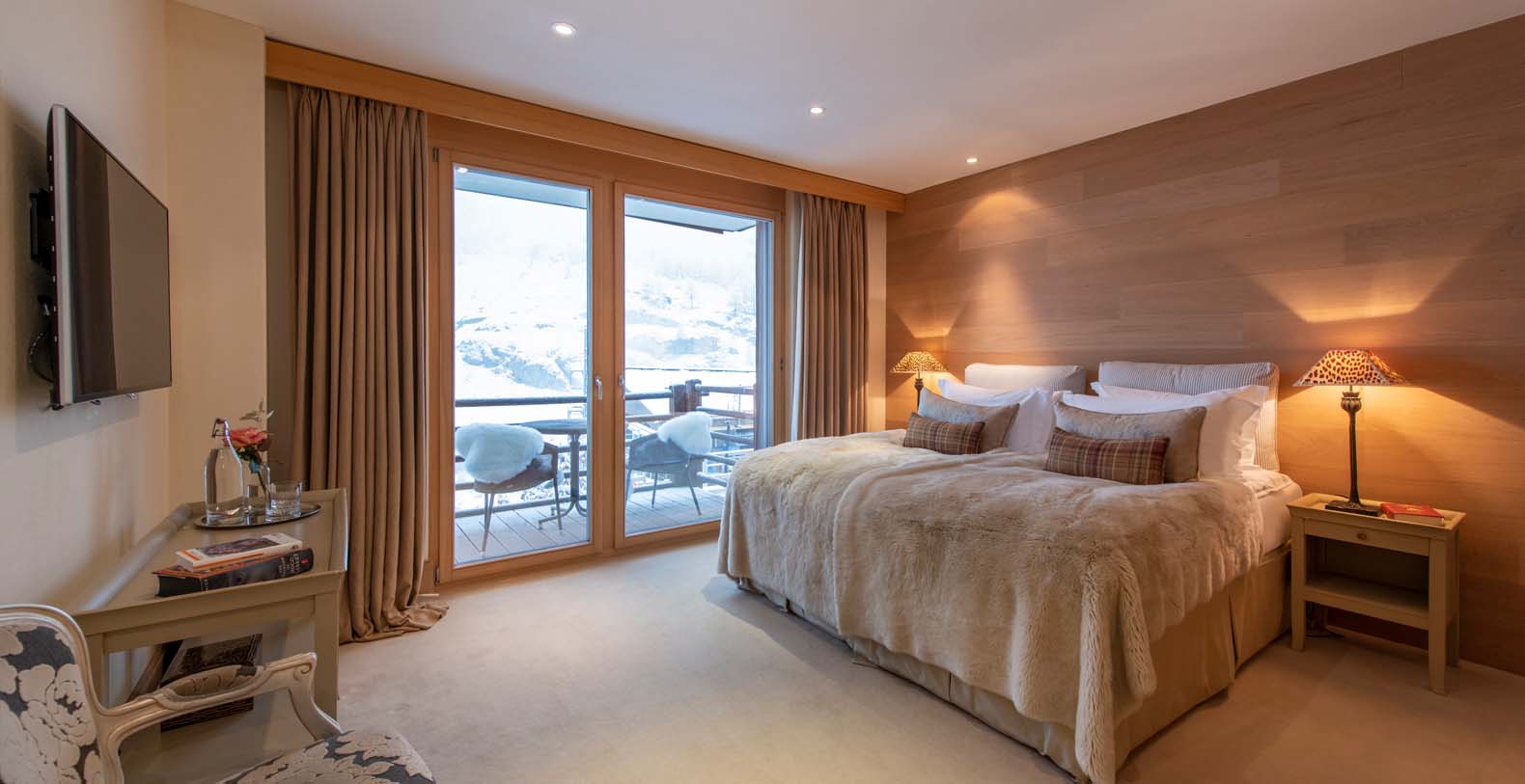 Twin or Superking size bed. En-suite bathroom with shower. Opens to private balcony, view across Zermatt to Matterhorn. Plasma TV with Sky & DVD Player.