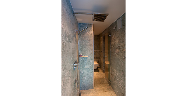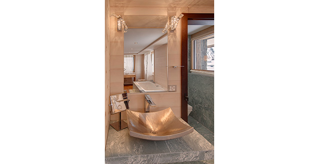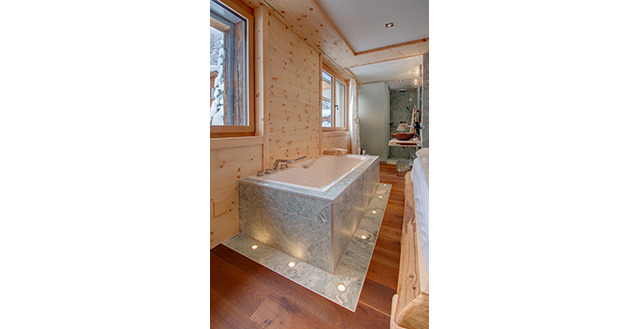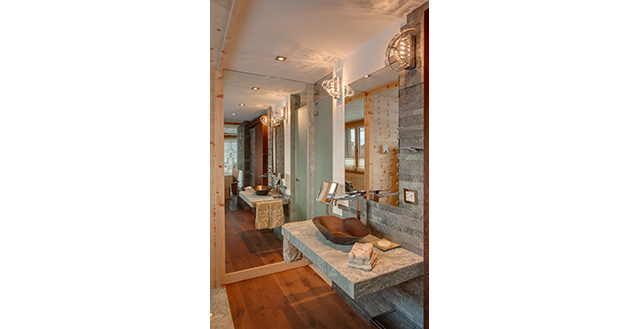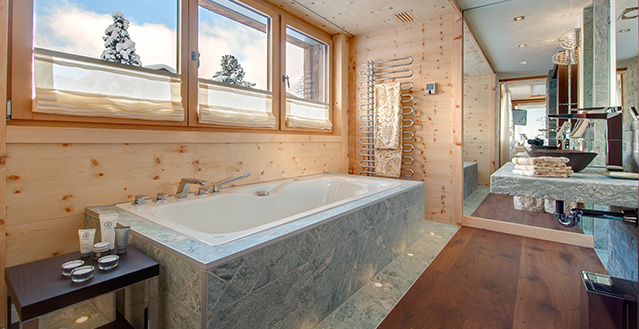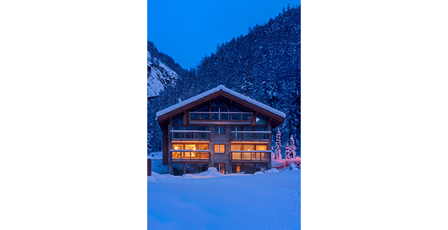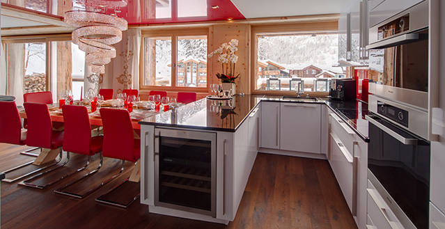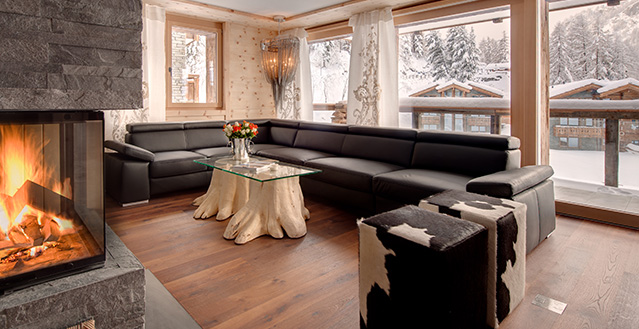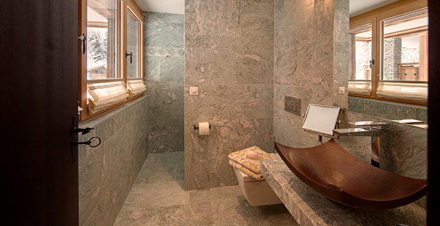 The glass sided balcony spans the length of the residence; a perfect place to take in the champagne air of Zermatt while watching the skiers returning from the slopes.