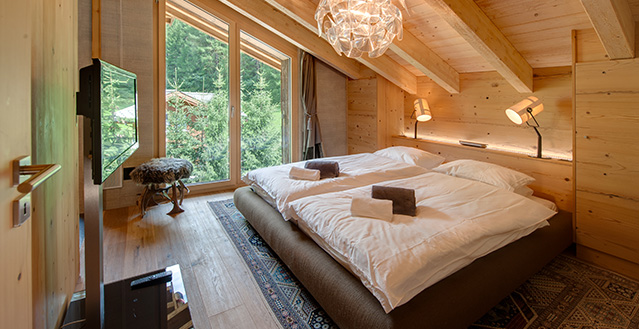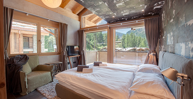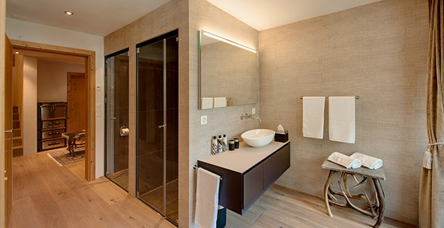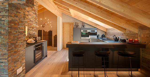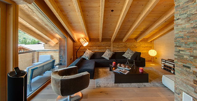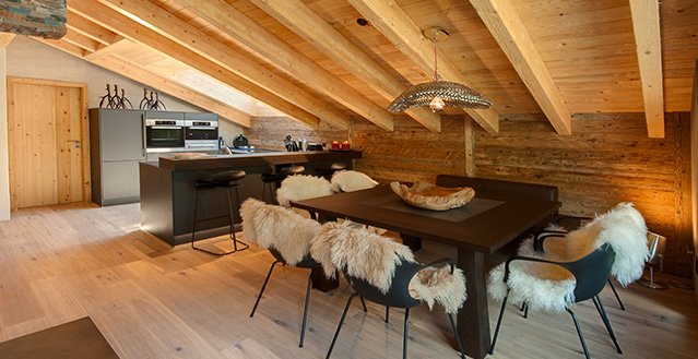 Zermatt’s Chalet High 7 Penthouse provides accommodation for up to 24 guests, this exquisite chalet is made up of a 4 apartments, a spacious 235m2 four-bedroom, duplex penthouse, two three-bedroom apartments and one two-bedroom apartment. The chalet is located in Zermatt’s only ski-in ski-out district, Winkelmatten. This is known as the “Beverly Hills” of Zermatt and from the chalet you can ski through the meadow and down to the Klein Matterhorn Express Lift and you can ski back to the door of the chalet down the Moosweg ski-run.