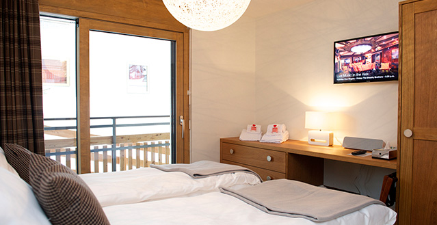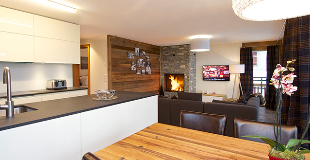 The lounge has an open fire, a plasma TV and is a cosy environment to unwind after a day on the slopes, it is a lovely space in which to relax and spend time with friends. This apartment is spacious, opulent and offers the comfort of a home-away-from-home. It has been luxuriously finished to cater for your every need and can be accessed by stair or lift.