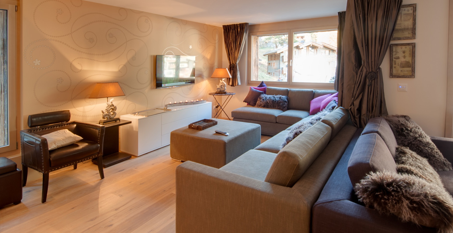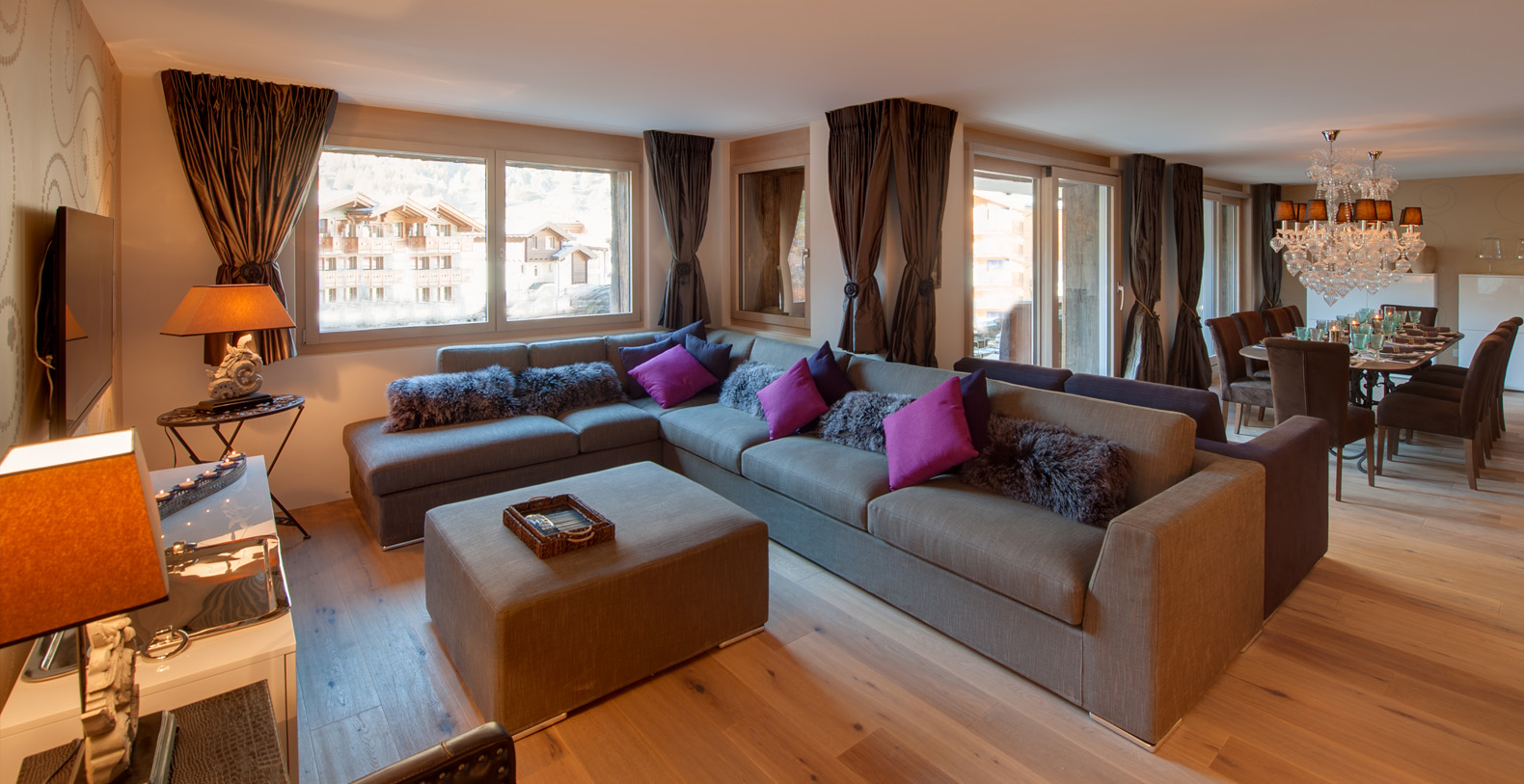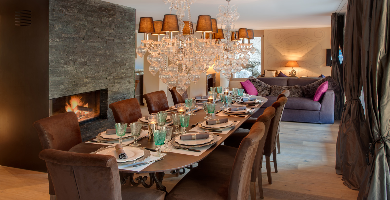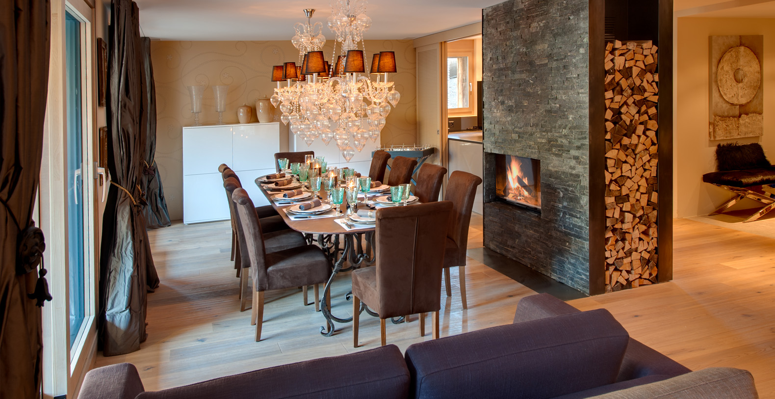 The dining area is located on the ground floor and the solid oak dining table can accommodate 14 comfortably. There is also comfortable lounge and open fire where you can relax after an unforgettable day on the slopes with a glass of wine or a hot chocolate. The lounge has a large LCD TV, DVD and veiws of the Matterhorn. The chalet has and wireless internet throughout. There is a separate closed kitchen where our hand-picked team will work to create fabulous cuisine throughout your stay.