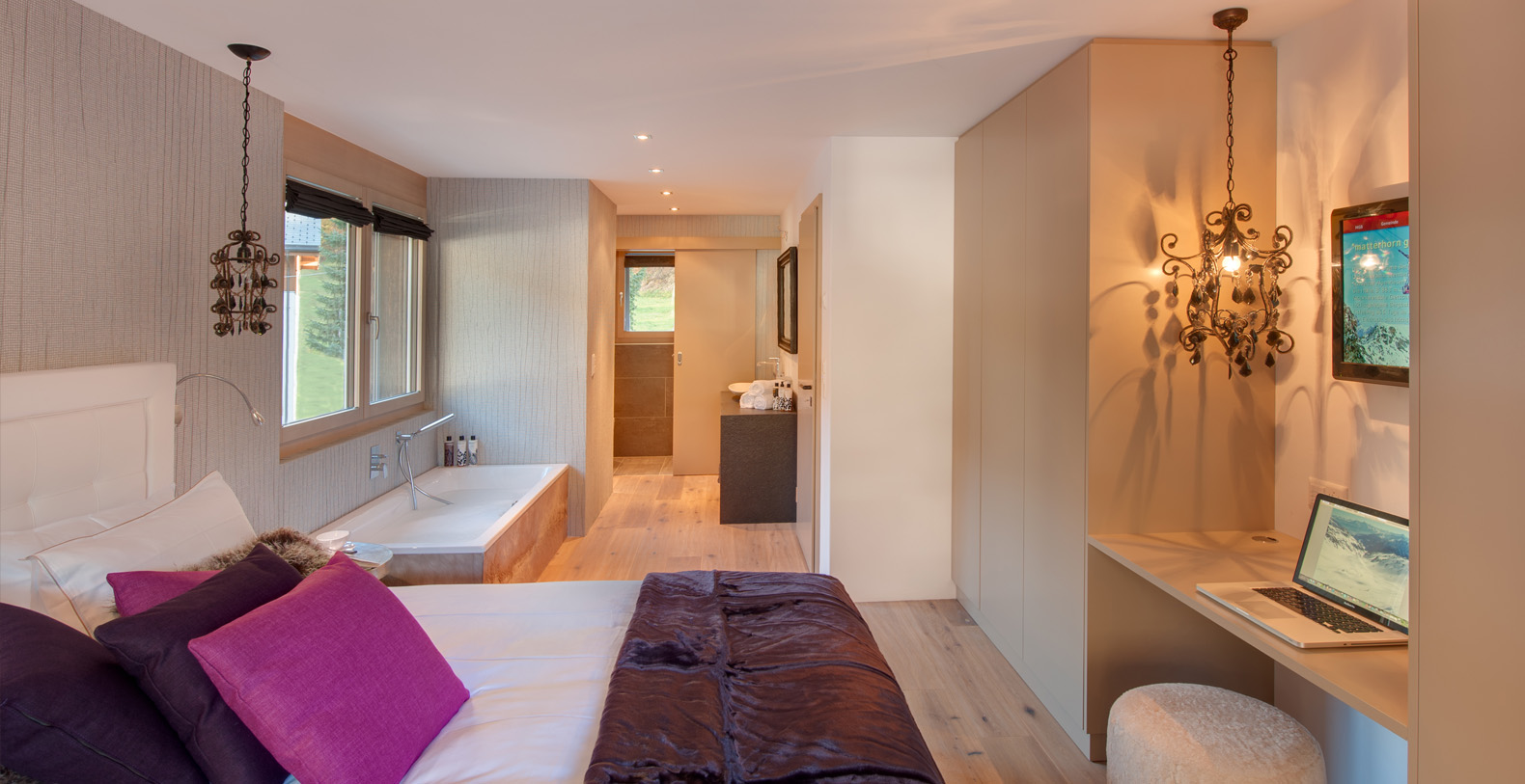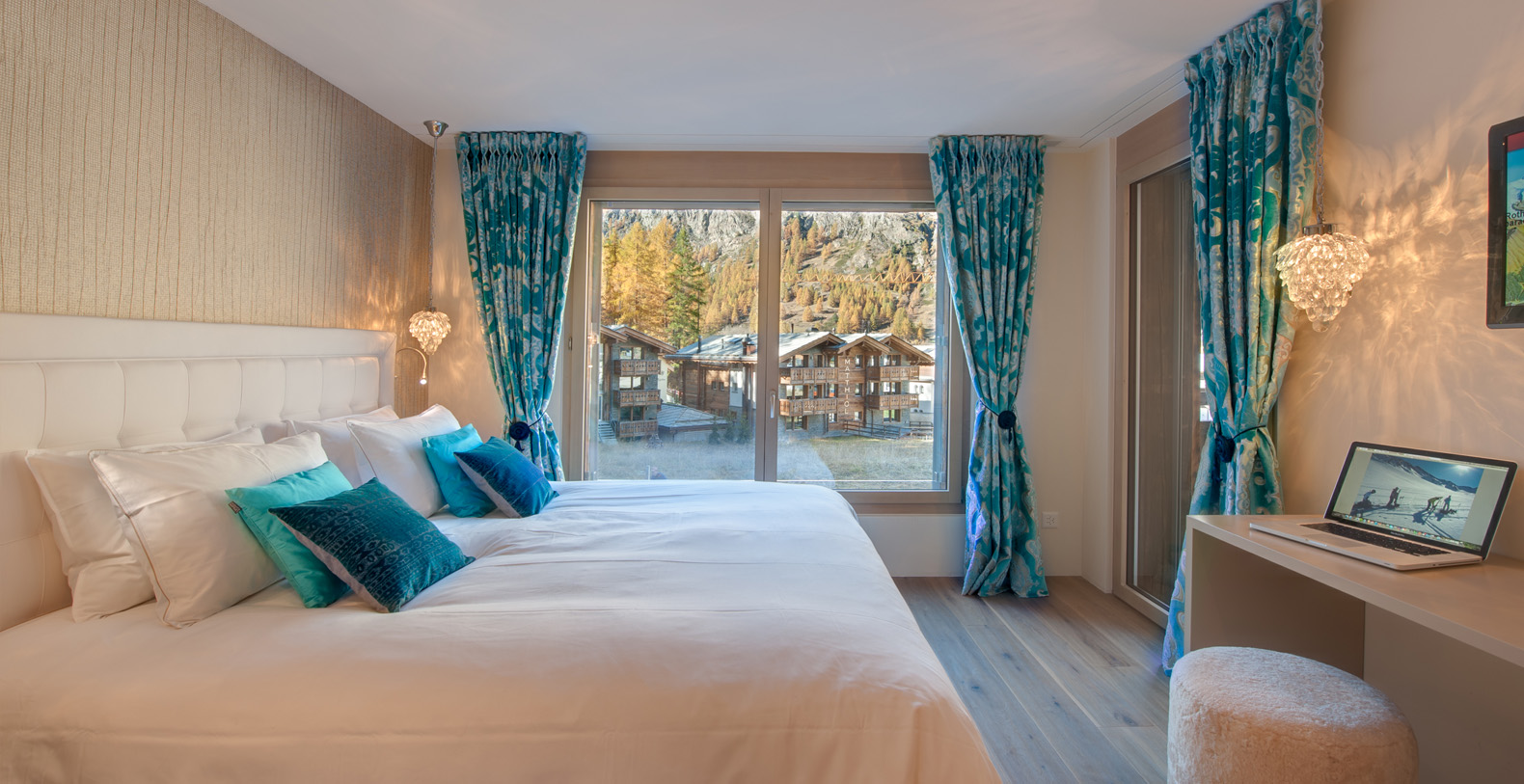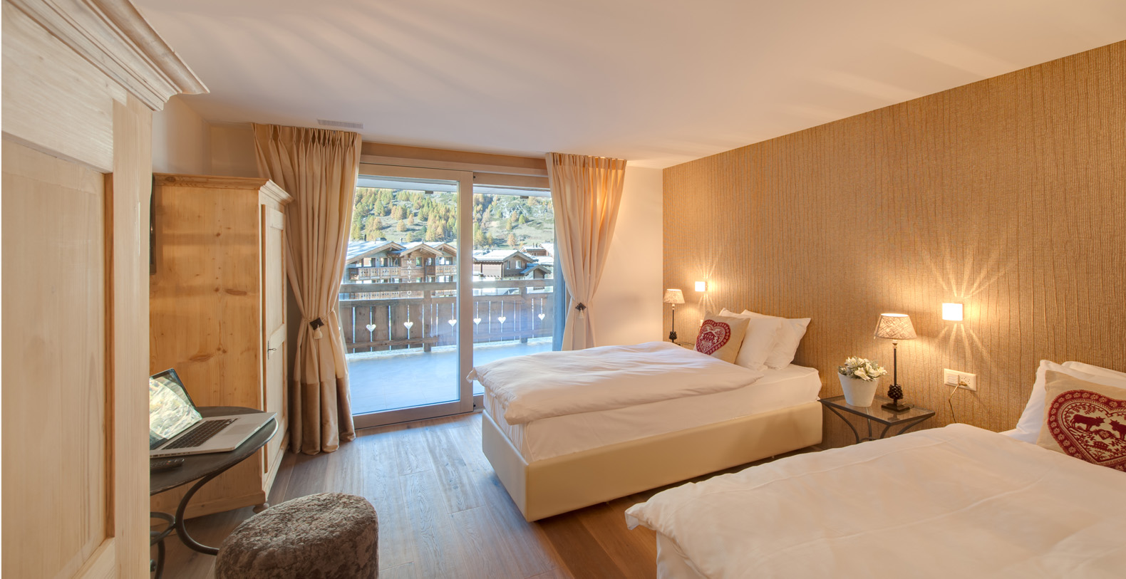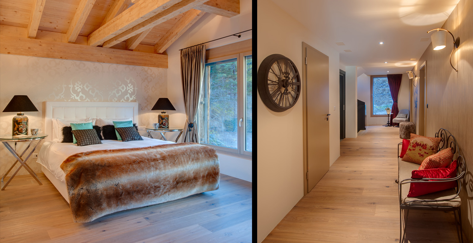 The first floor of Chalet White Pearl comprises of two large en suite double bedrooms with balconies and Matterhorn views. The third bedroom can either be a king size double bedroom or a quad room for a group of up to four younger guests (there are two extra full size couchette single beds that can make this room a great den for children), this bedroom has a private bathroom adjacent to it.