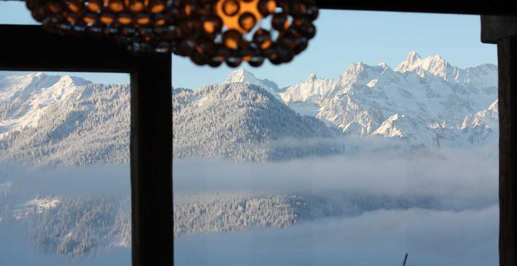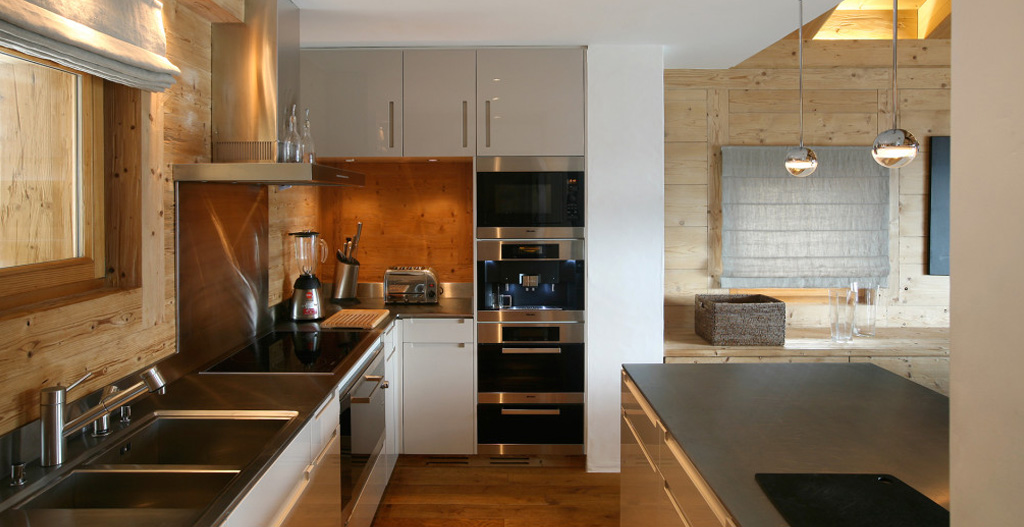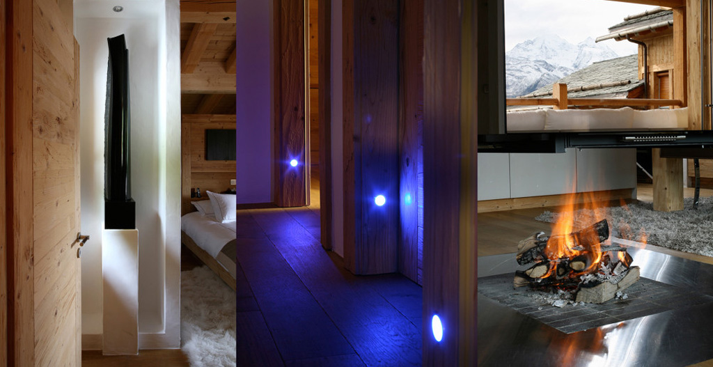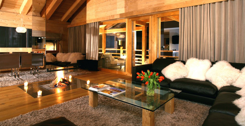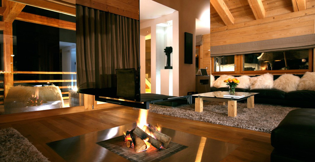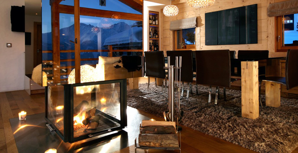 The living room is spacious with materials and colours offering the promise of complete relaxation and South, East and West facing panoramic views of the Alps. The central fireplace, an important architectural element underlining the rooms contemporary atmosphere, has a hearth level with the floor