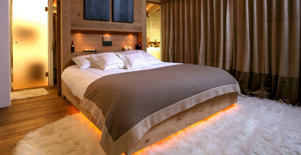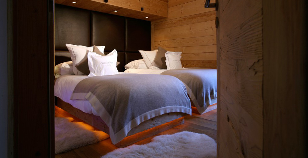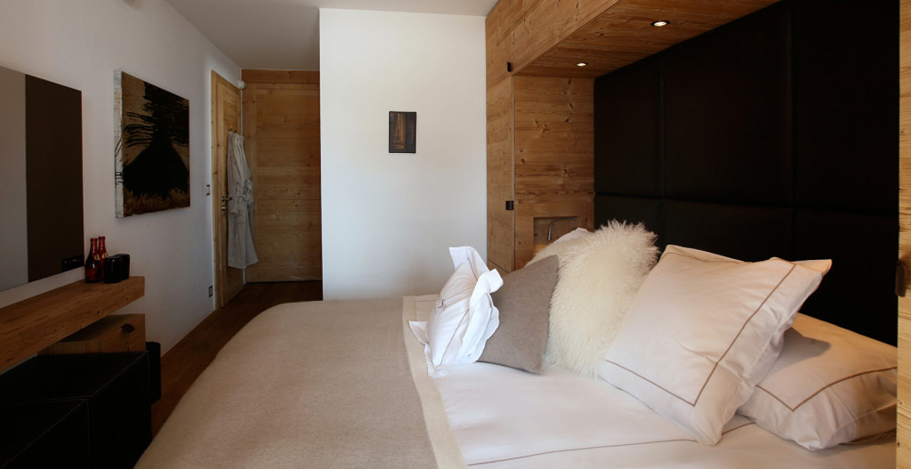5 bedroom (all en suite) including a beautiful penthouse master suite with king size bed, private terrace and minibar, with 4 further bedrooms which can be set up as king size or twin bedrooms. The master suite on the top floor has an original glazed gas flame fireplace cut in the wall opposite the bed, and through the flames the view is to the mountain beyond. Within the master suite is a luxury bathroom, with rain shower, a private jacuzzi bath with mountain views, and twin his and hers basin