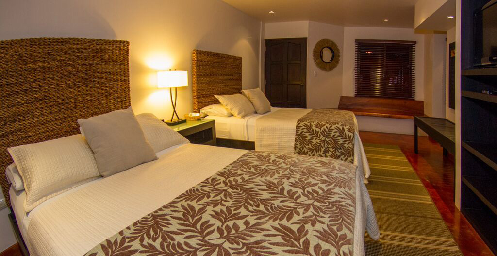 STANDARD DOUBLE ROOM 350 sqft - two full beds with cotton linens – seating area - cotton waffle robes and slippers - complimentary Wi-Fi - 32" flat screen TV - evening turn down service - air conditioned.