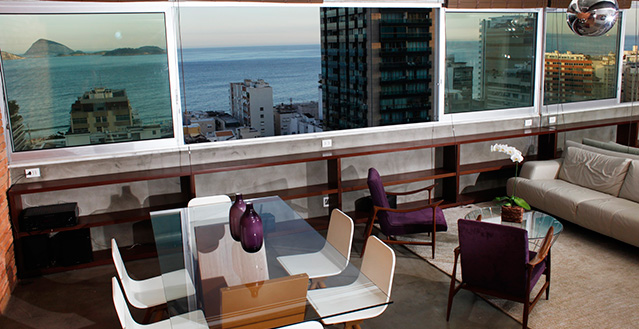 An impeccably styled living room blends seamlessly with the dining area, both sharing a spectacular ocean view through which you can see the beautiful coastal islands of Rio. Perfect for inviting friends over, having dinner parties and relaxing after a day spent seeing the wonders of Rio.