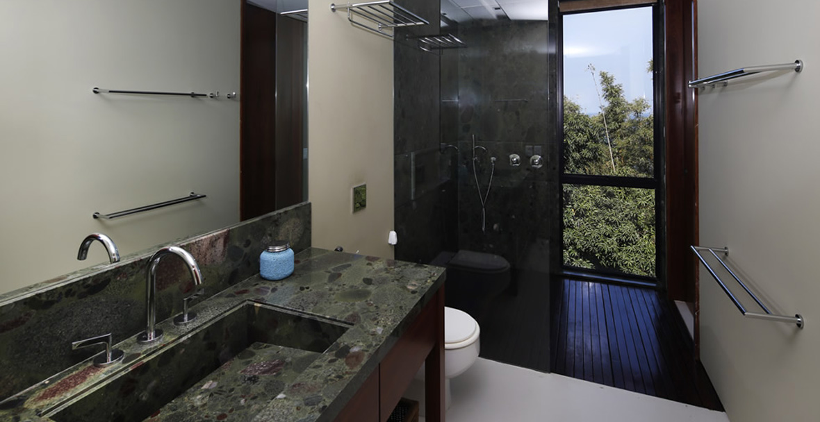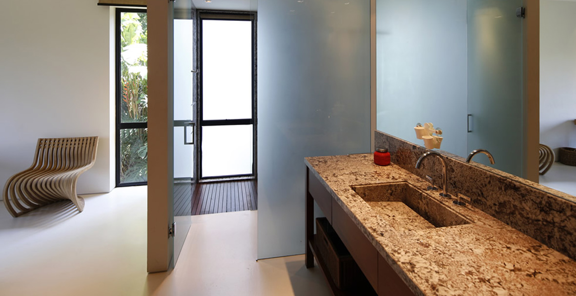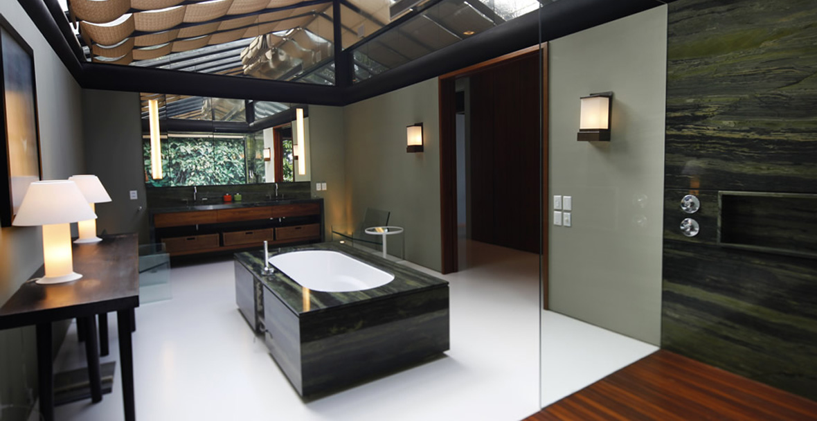 The villa itself is full of natural light due to the large glass walls and glass roof and ceiling as well. Because of this very unique and innovative project, it has natural light from many different angles, all day, from sunrise to sunset. There is also an infinity pool which shares the stunning views. The house has 900m2 and consists of 3 beautiful suites. The main bathroom has a hot tub, is simply exquisite in its beauty and design, There is an impressive living-dining room, surrounded by glass, and tropical plants abroad, with the focal point that is custom built table for up to 20 people. The kitchen is very stylish and modern, with clean lines and state of the art appliances throughout.