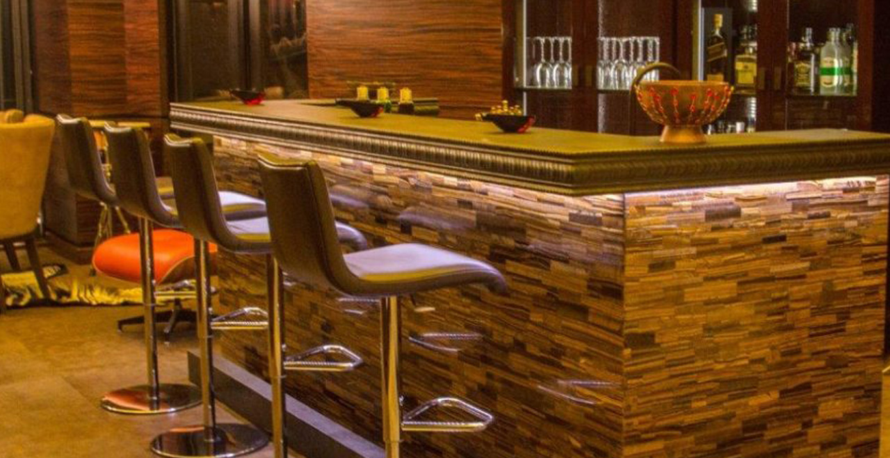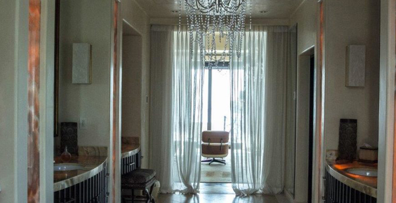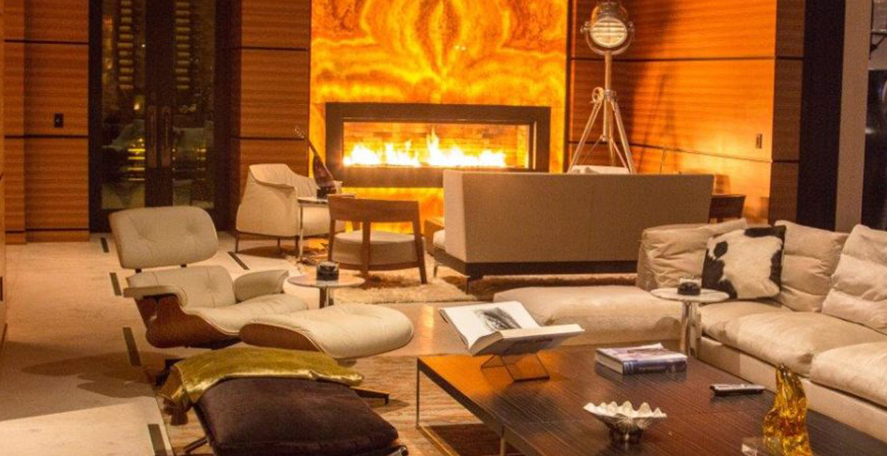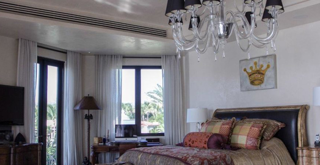 The fine detailing continues into the living spaces, where a staircase skylight made of Onyx is a conversation-worthy highlight. A powder room with nacar-shell walls highlight the area’s beautiful natural resources, and copper and Bumanier marble from France lends an elegant effect, as do art-gallery-worthy glass doors to the wine cellar and Bar Salomon. Within the classically styled living spaces you’ll find modern touches: an 87″ TV in the living room as well as Apple TV, Dish, Sky and satellite TV, retractable doors, a guest kitchen with access to commercial kitchen. Bar Salomon, with its bronze countertop, game tables, and multiple high-end TVs, makes a perfect retreat for watching the game – or toasting with a shot of Patrón.