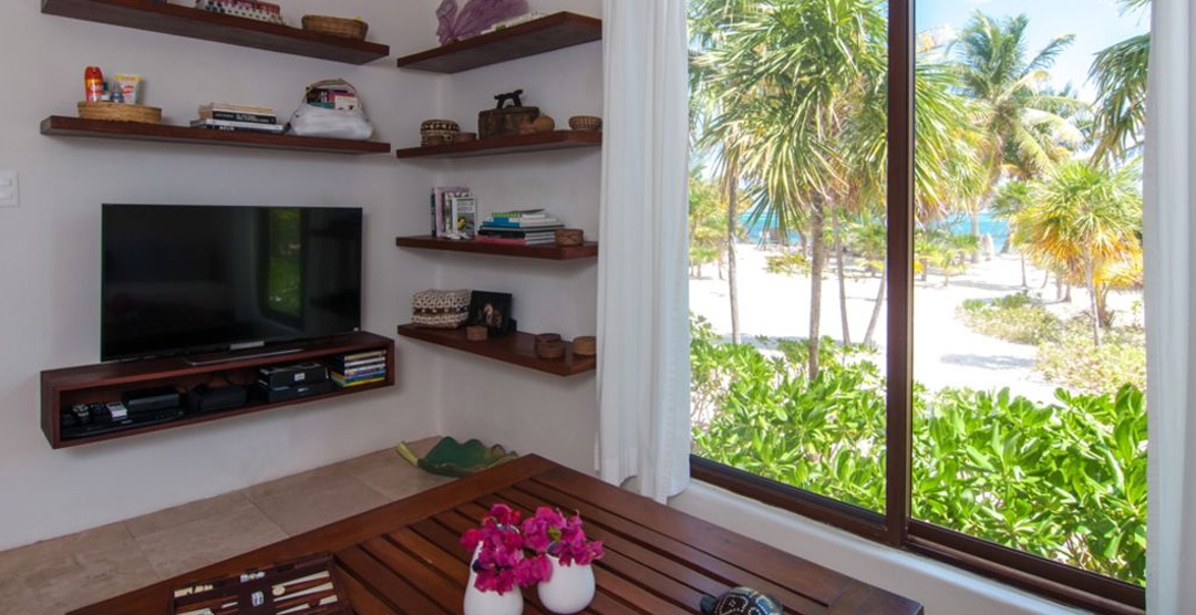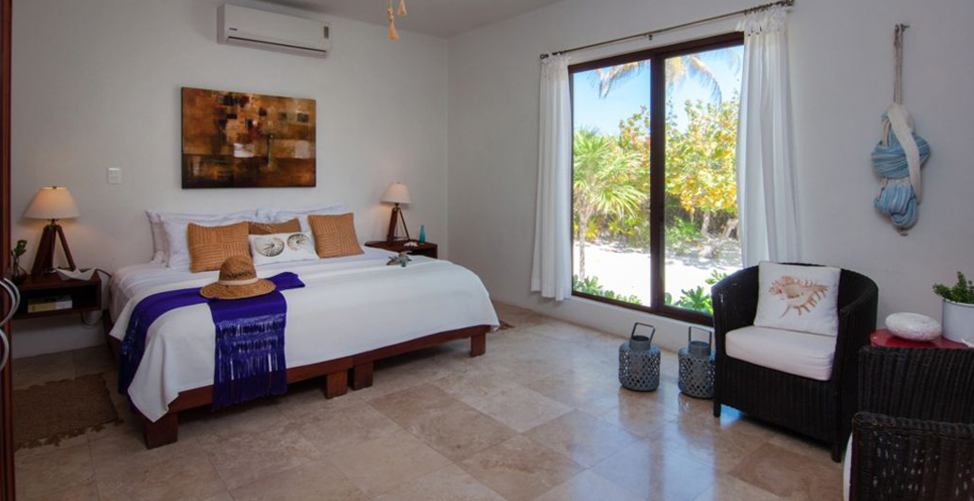 The spectacular white-sand beach is situated in a very large cove brimming with the beautiful colors of the light reflecting by the Caribbean sea. Throughout Mexico, all beaches are public. But here you will almost never see any other people. Your company is the sound of the waves and the large birds gliding by. Take a swim, kayak, or simply relax in the warm waters. A large reef is just 400 meters away, waiting for you to explore. It is truly a tropical paradise.