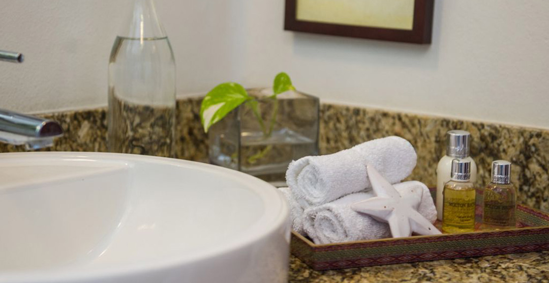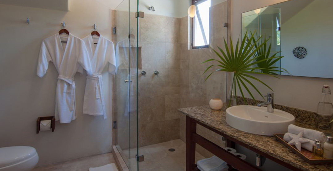 The bedrooms are air-conditioned and feature high quality, eco-friendly linens. The bathrooms feature marble floors and granite countertops, and eco-friendly towels, bathrobes, luxury soaps, and shampoo.