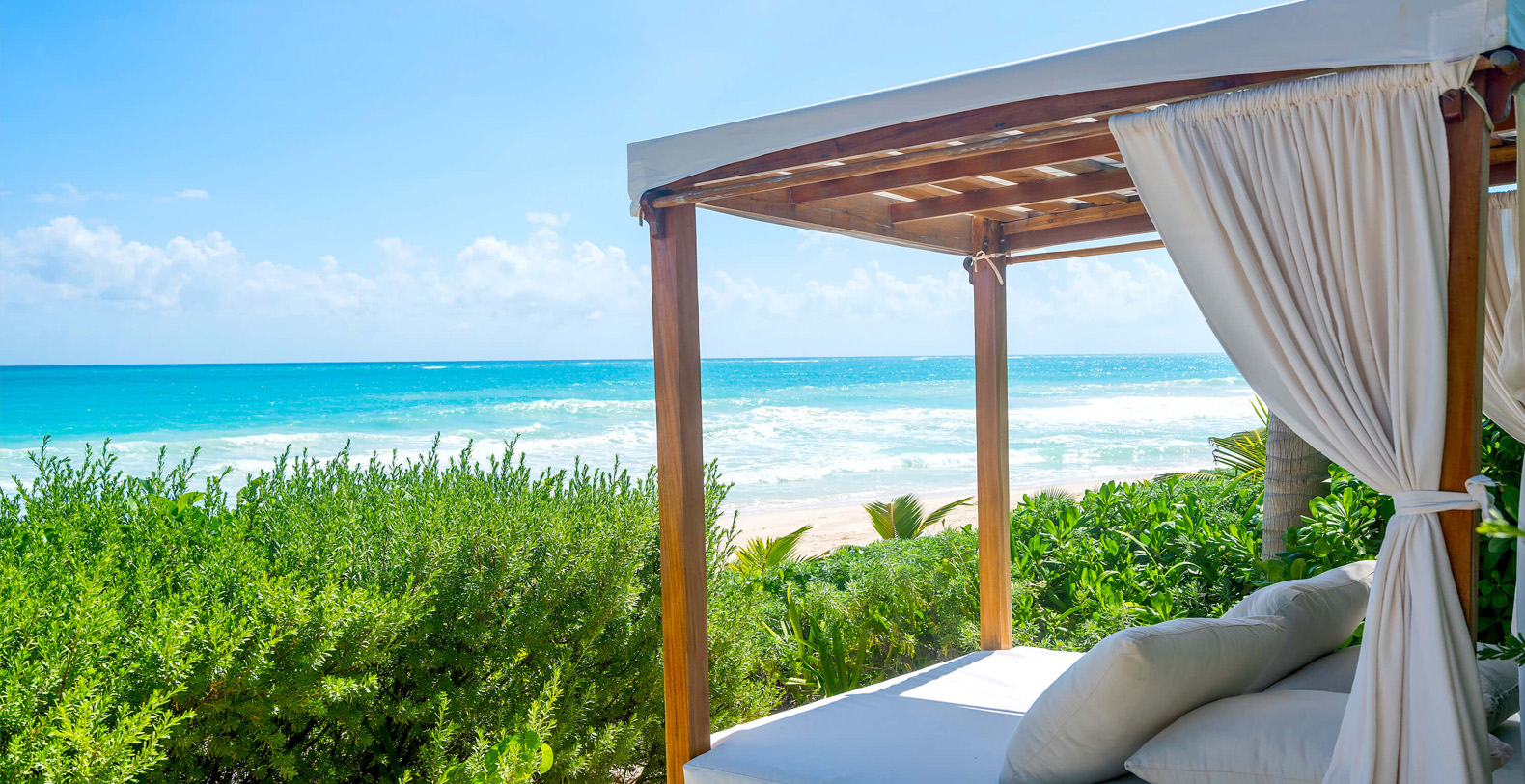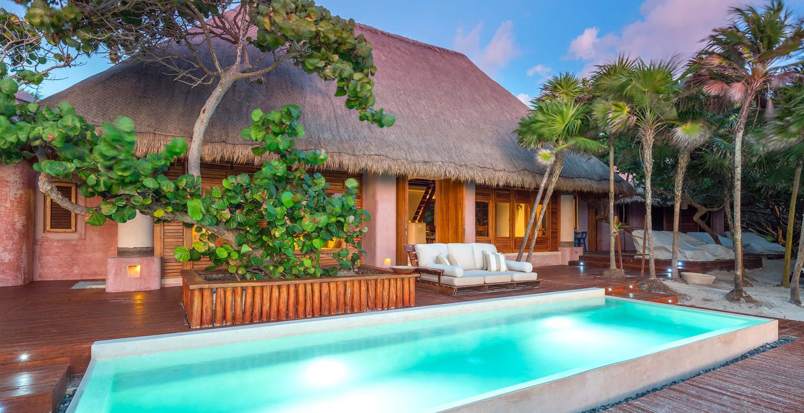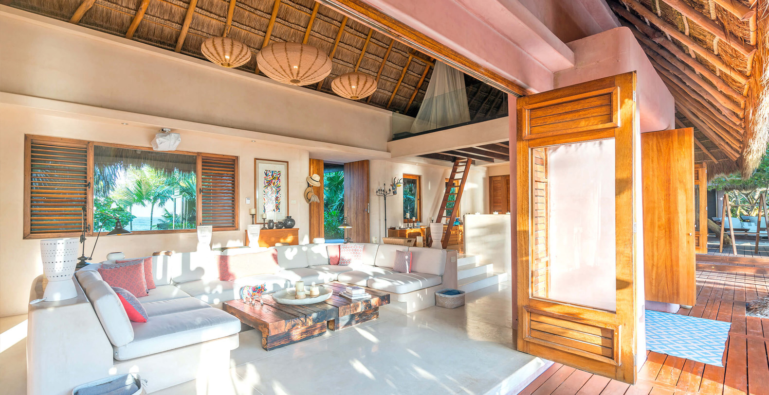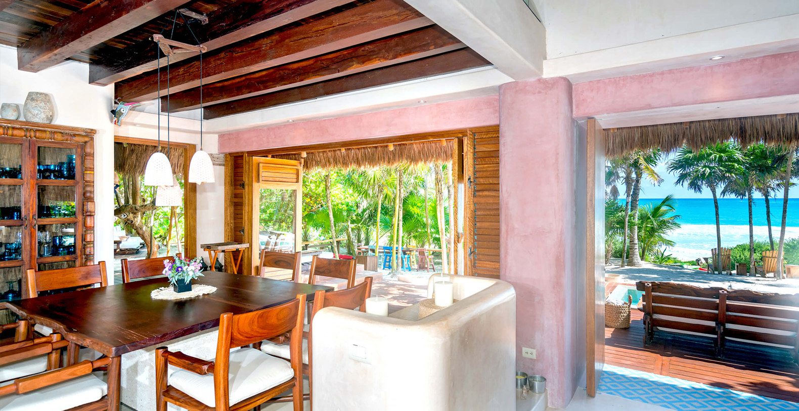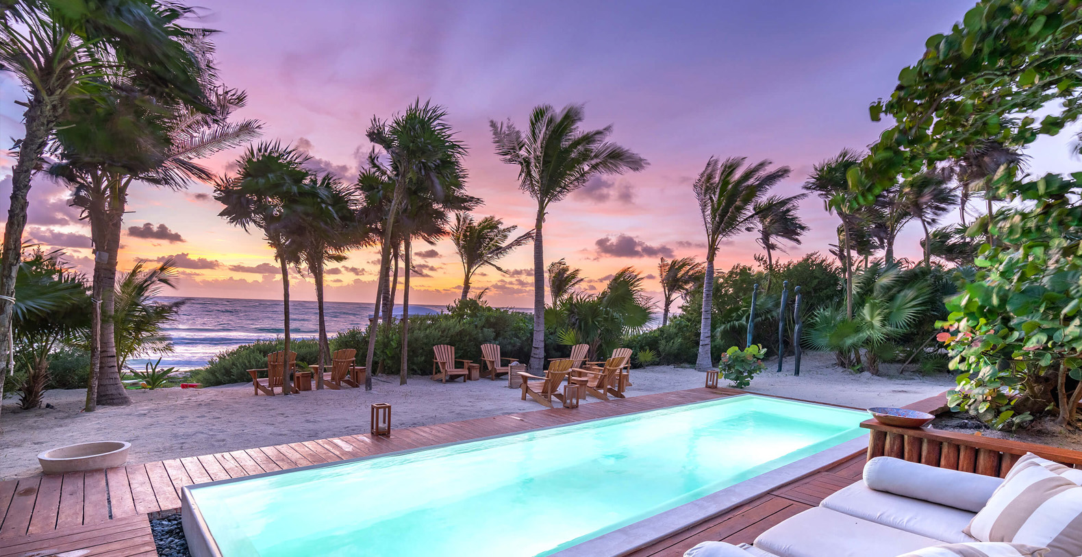 The four-bedroom Villa is nestled on a 100 m beautiful stretch of Sian Ka’an coastline, offering stunning sea and lagoon views, a beachfront pool and a variety of outdoors dining and lounge areas.