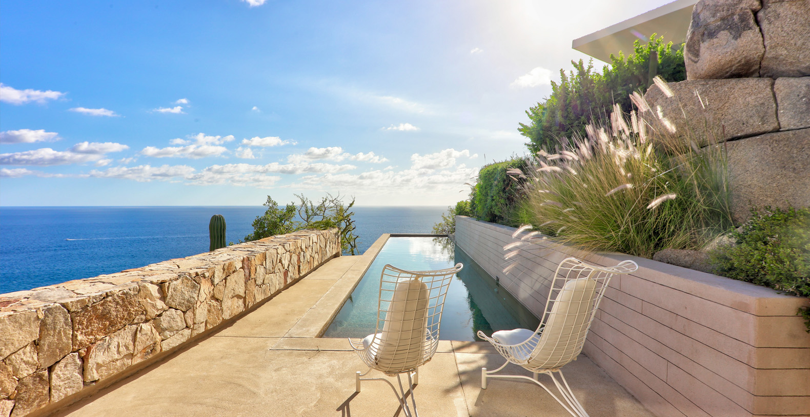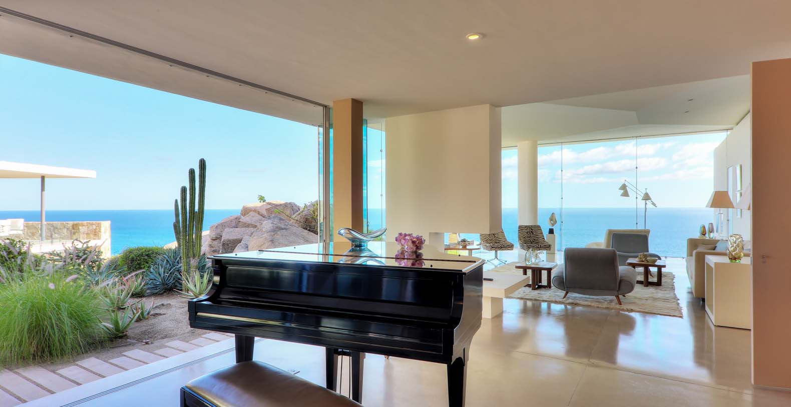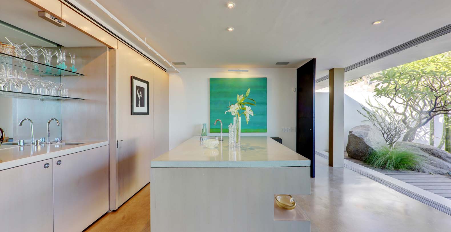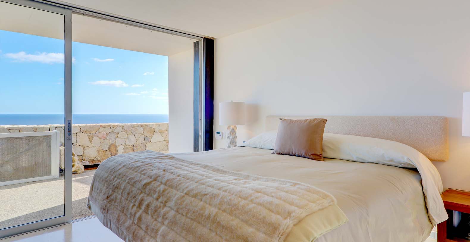 Architect Steve Harris designed this unique and modern gem combining minimalist design with rustic touches. Literally built into the mountain, the indoors melds seamlessly with the outdoors and the outdoors blends into the indoors. Solid glass walls provide unobstructed views of the Pacific Ocean and allow you to connect with the abundant wildlife which is always visible in the waters around Cabo.