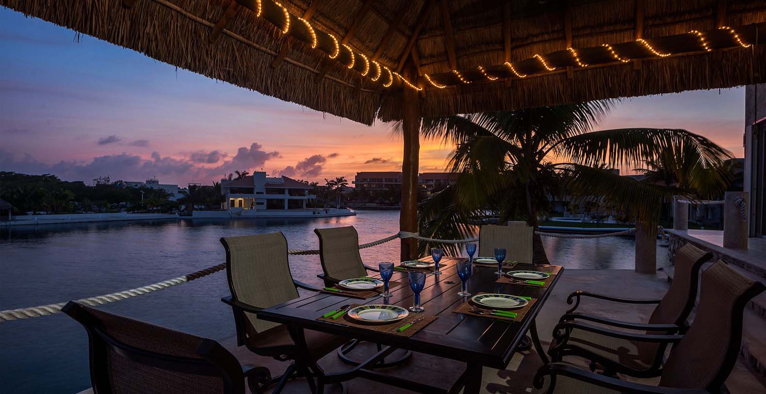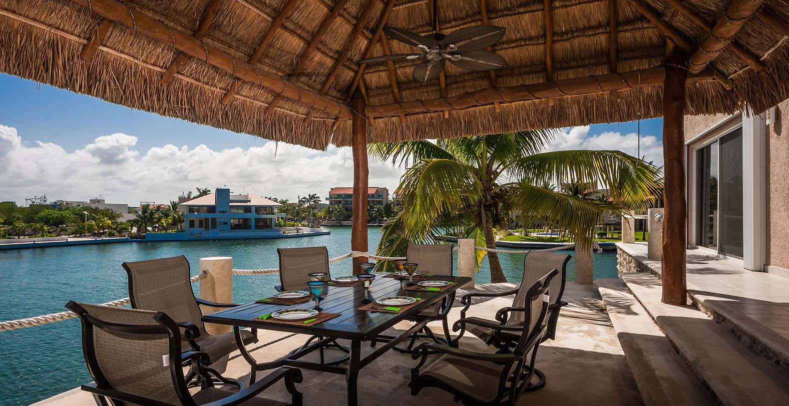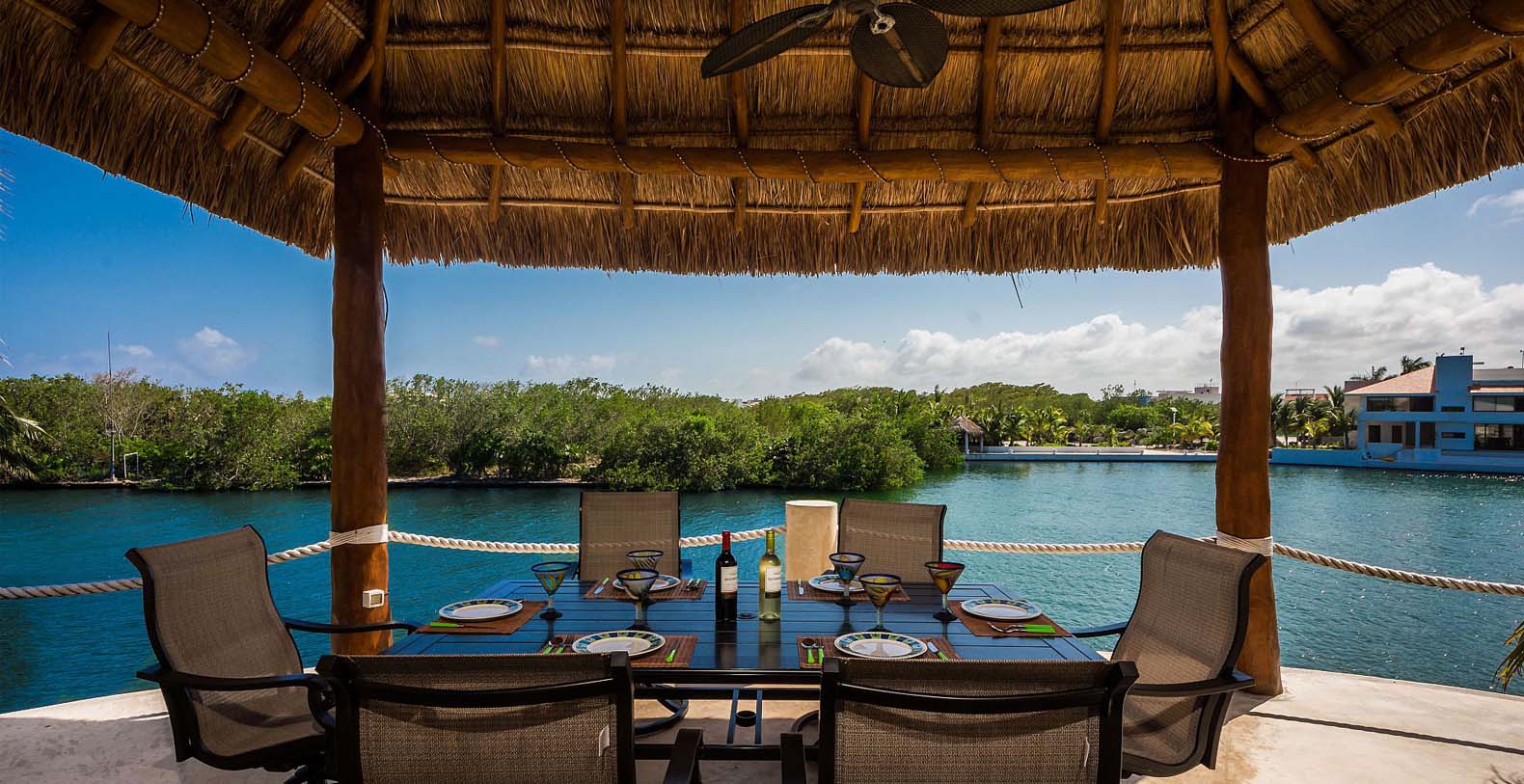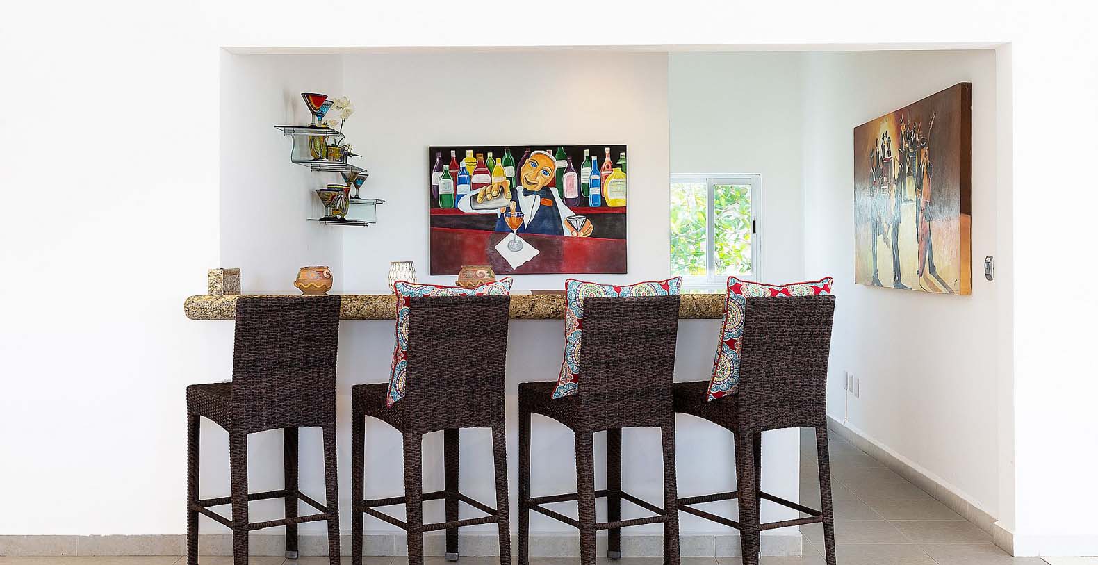 A large open plan for dining, exquisite cocktail bar area with wine cooler, and adjacent powder room, and comfortable living room all have an absolutely stunning view, looking out to the Palapa covered large terrace and beautiful Puerto Aventuras Ocean waterway.