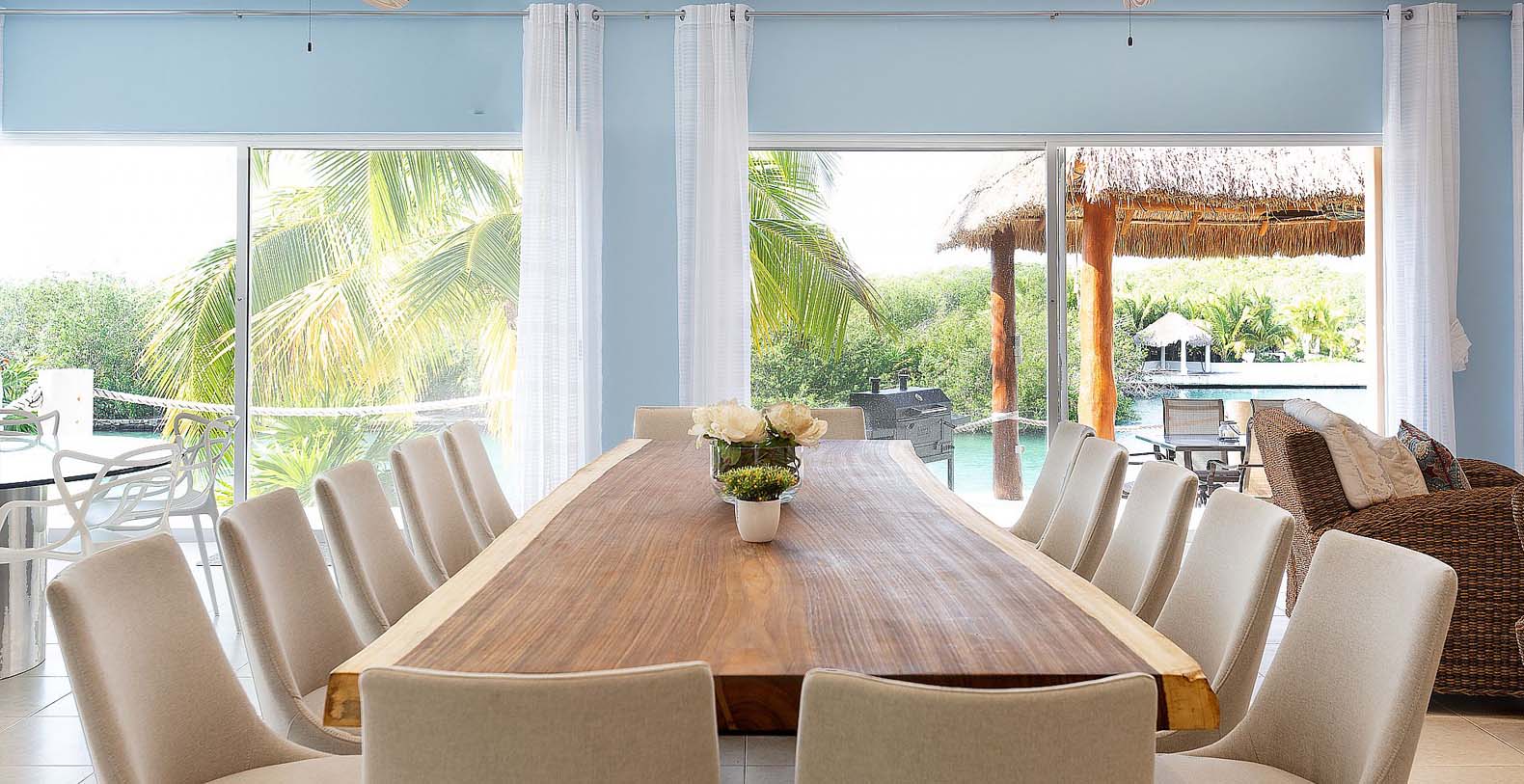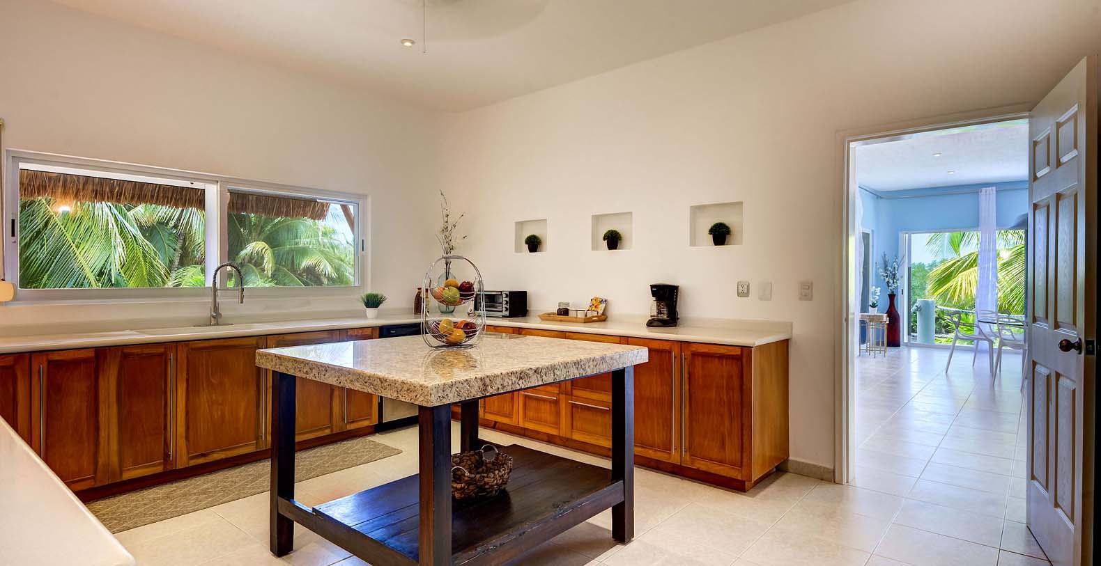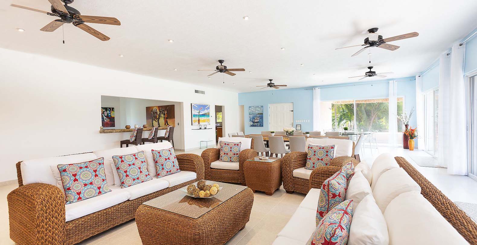 A large open plan for dining, exquisite cocktail bar area with wine cooler, and adjacent powder room, and comfortable living room all have an absolutely stunning view, looking out to the Palapa covered large terrace and beautiful Puerto Aventuras Ocean waterway.