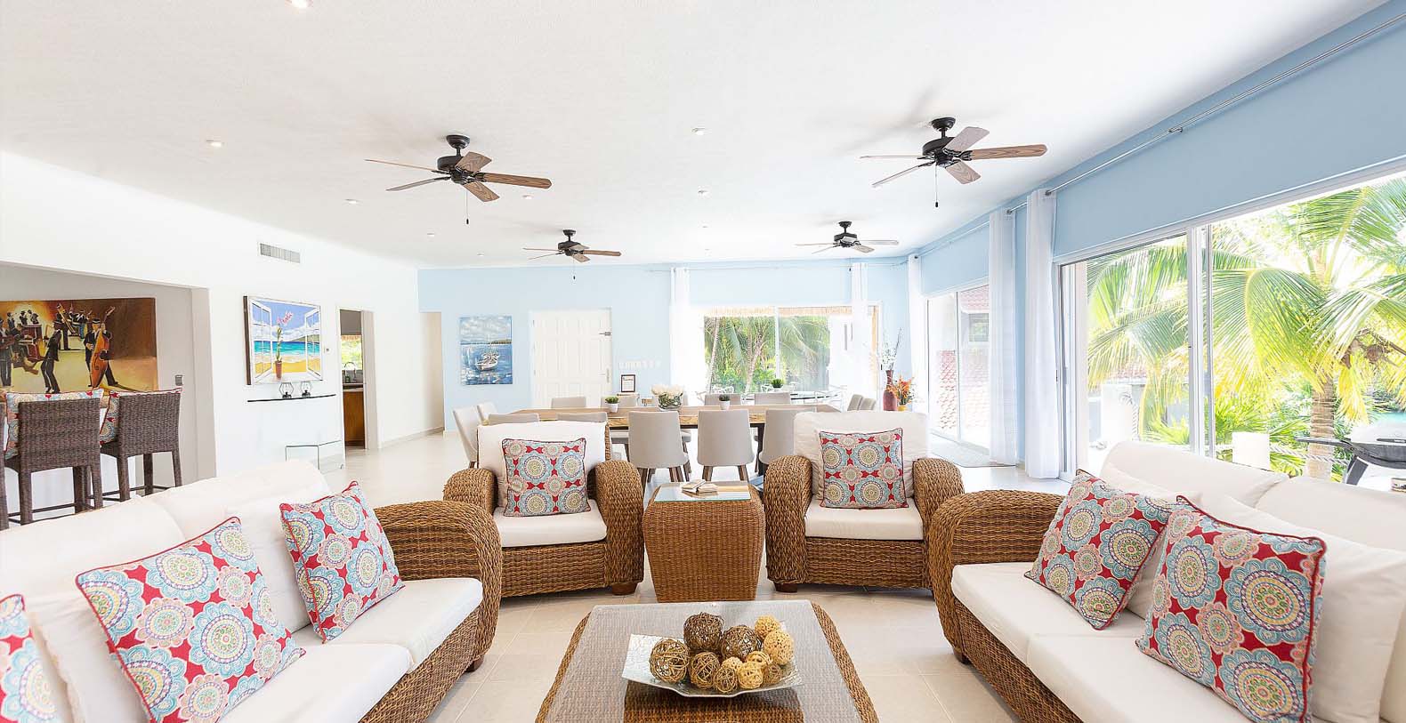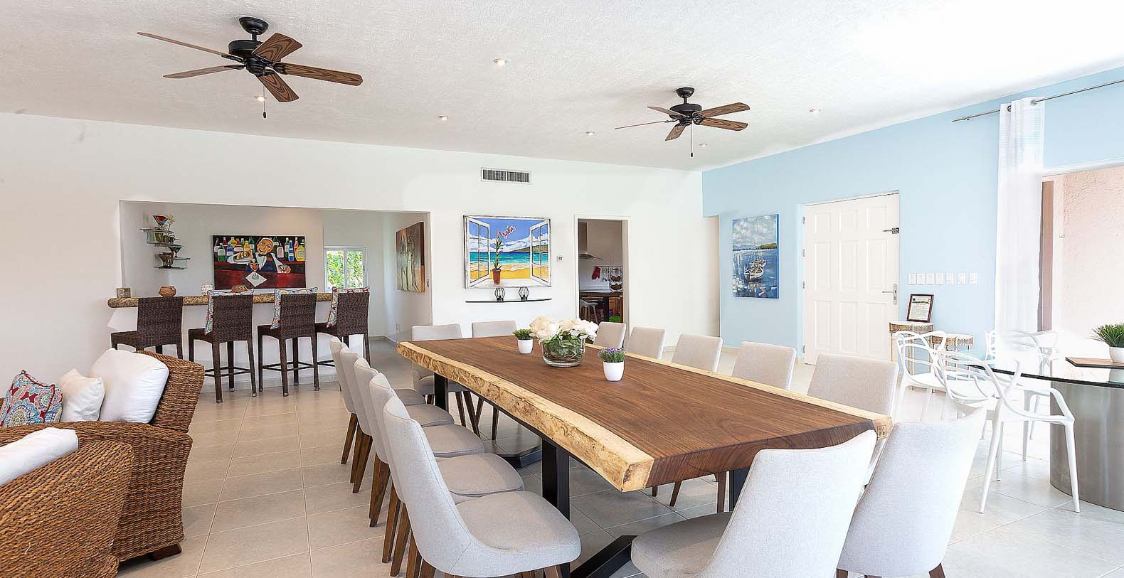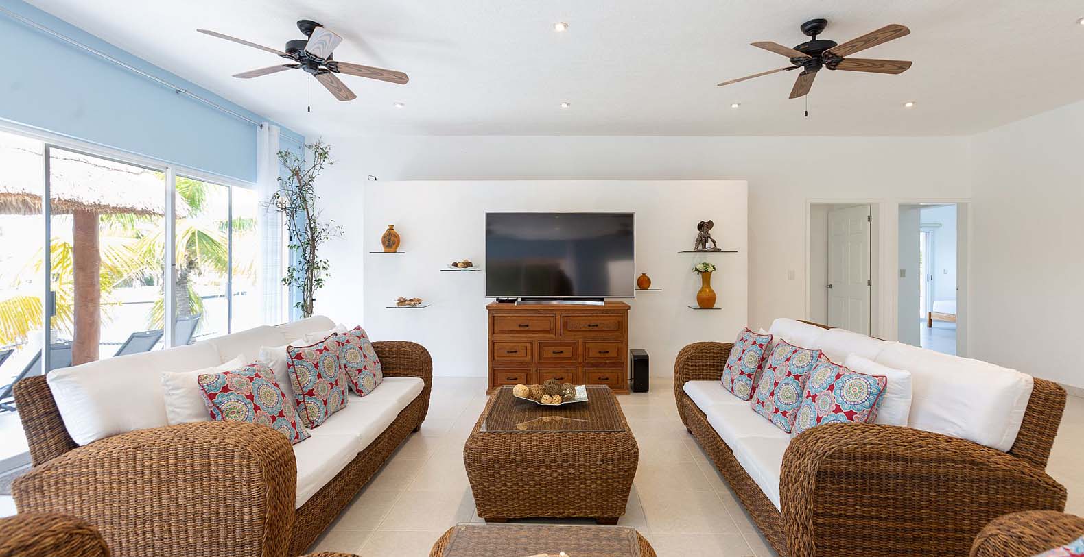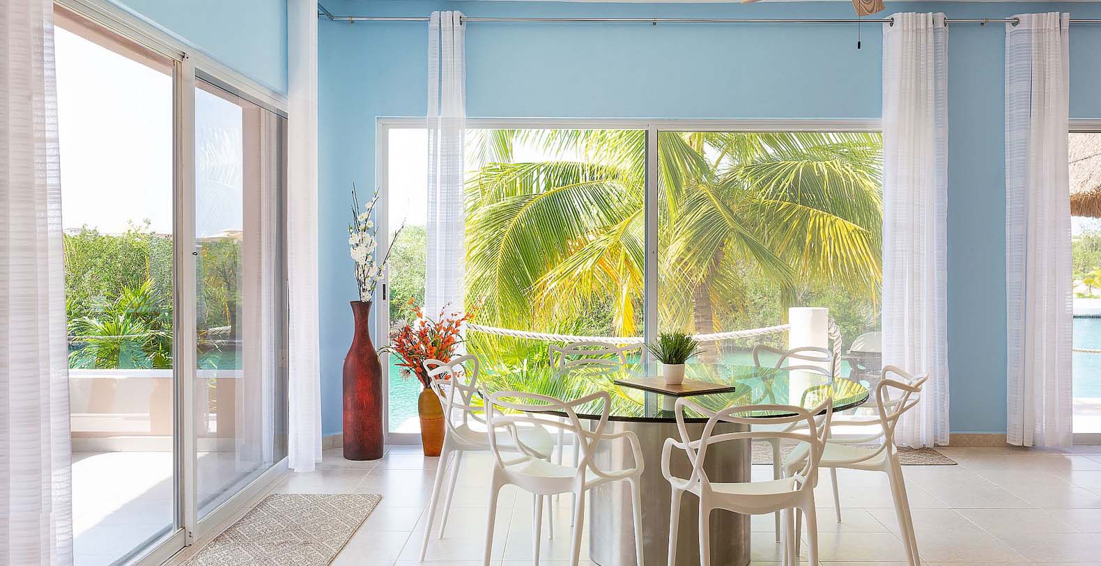 A large open plan for dining, exquisite cocktail bar area with wine cooler, and adjacent powder room, and comfortable living room all have an absolutely stunning view, looking out to the Palapa covered large terrace and beautiful Puerto Aventuras Ocean waterway.
