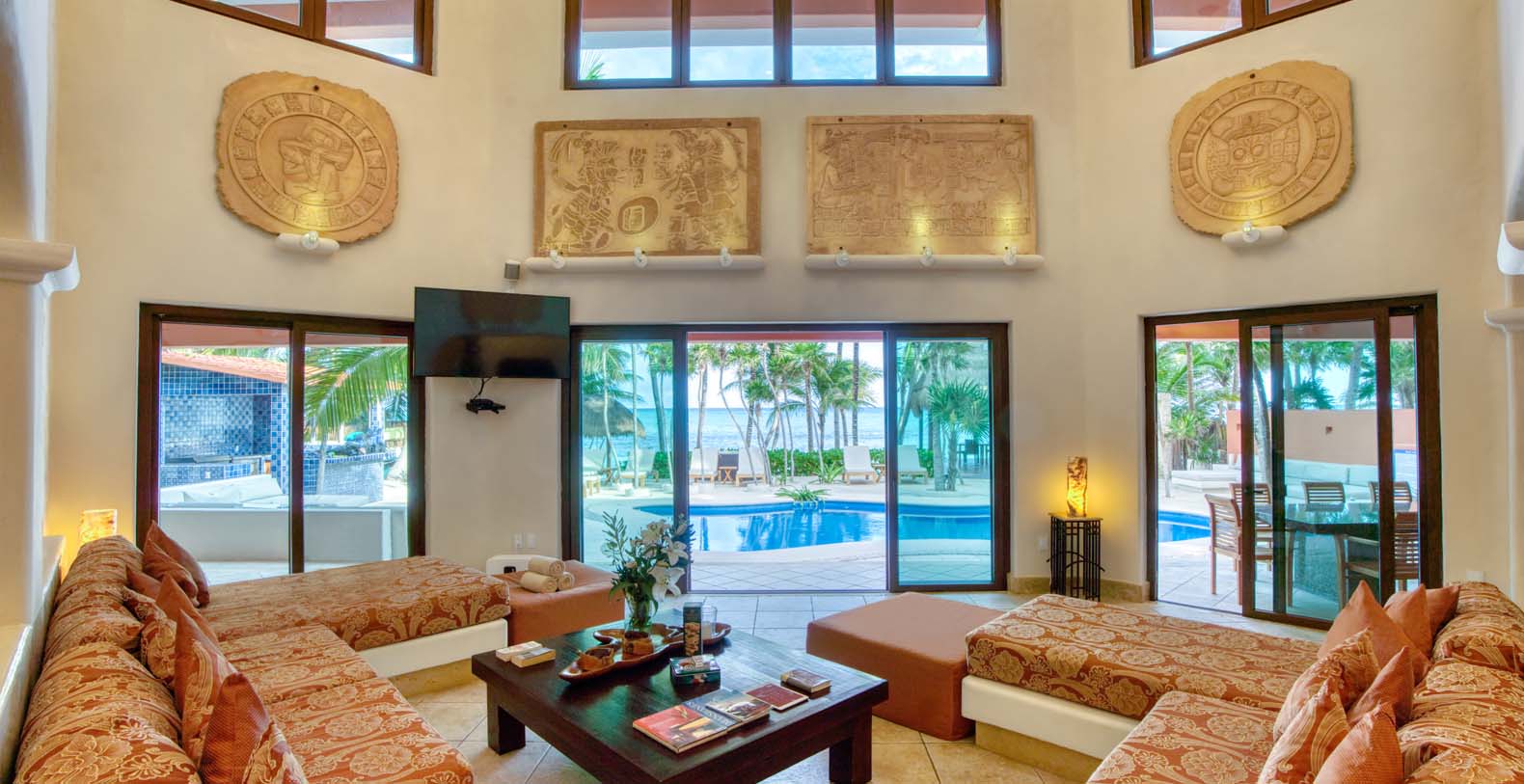 Its spacious living room offers a thirty foot ceiling, an impressive half circle lounger that can seat together its guests comfortably with a spectacular view of the pool and the beach, which is ideal for relaxing and entertaining. The pool area is also equipped with an outside shower for your comfort. Free internet access is available which makes it ideal for modern vacationers. Our manager also provides personal assistance that include planning day trips and booking authentic Mayan massages at the comfort of your dream vacation home. Casa Yardena has five full time caretakers and a security service is also included, a security service company provides your vacation home with a security night guard.