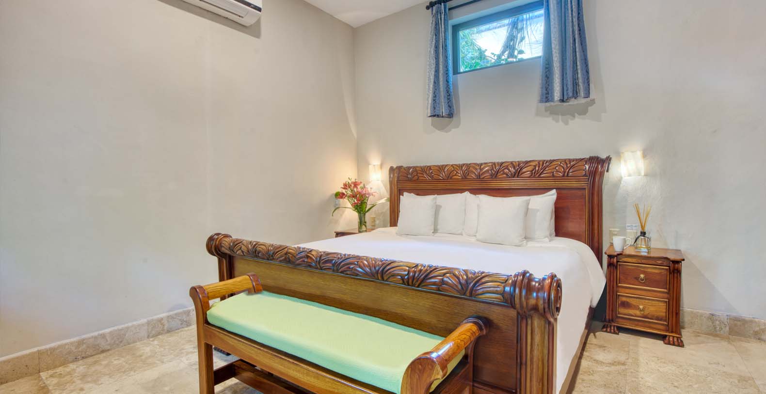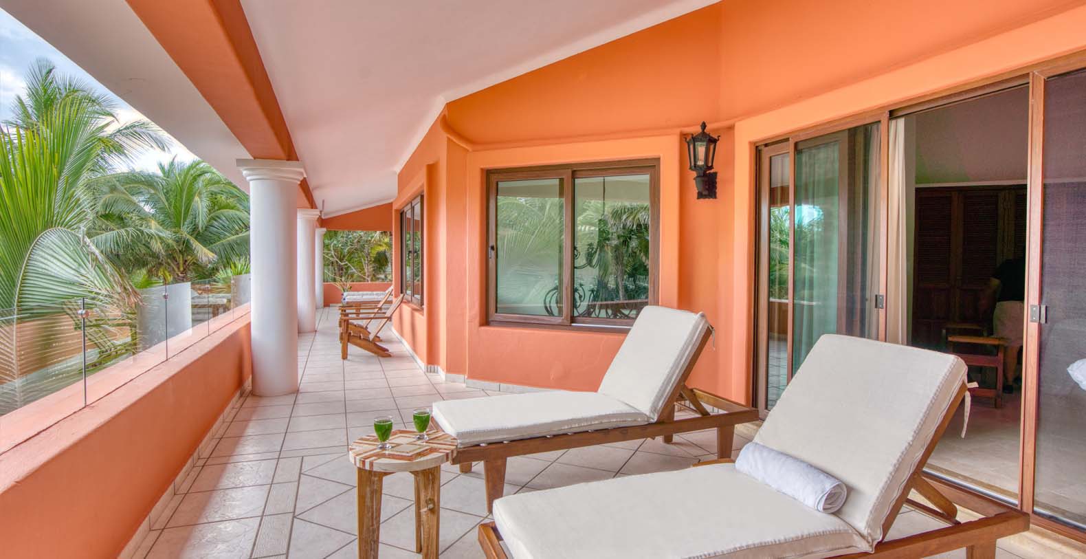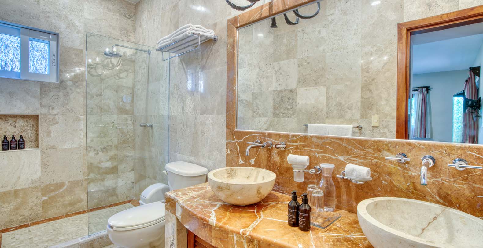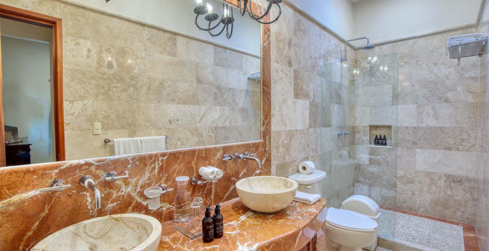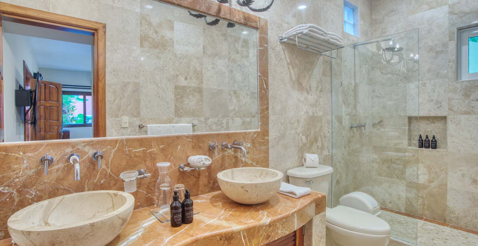 There are five artistically designed air-conditioned bedrooms with fourteen foot ceilings inside the villa, two bedrooms are furnished with two queen size beds, two bedrooms are furnished with one king size bed and one bedroom is furnished with one queen size bed. There are also four lovely guesthouses located outside, two of the guesthouses are furnished with two king size beds and the two other guesthouses each have one king size bed. Each of the nine bedrooms are equipped with ceiling fans, satellite TV, a DVD player, and a security safe. Casa Yardena's magnificent decor was inspired by Mexican architecture and craftsmanship. Every Bedroom has its private luxurious marble bathroom and the Master bathroom has a Jacuzzi tub with an incredible view of the Caribbean.