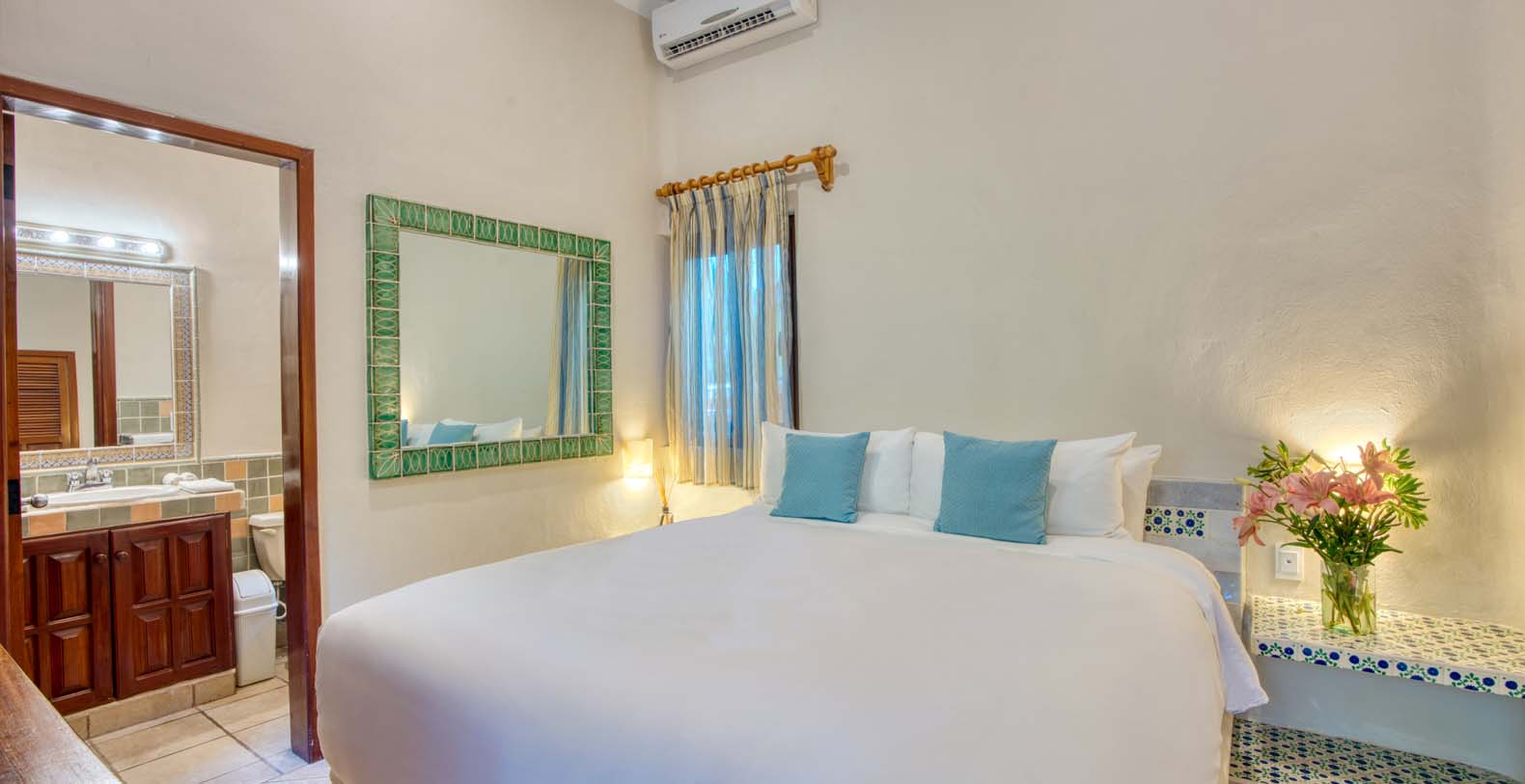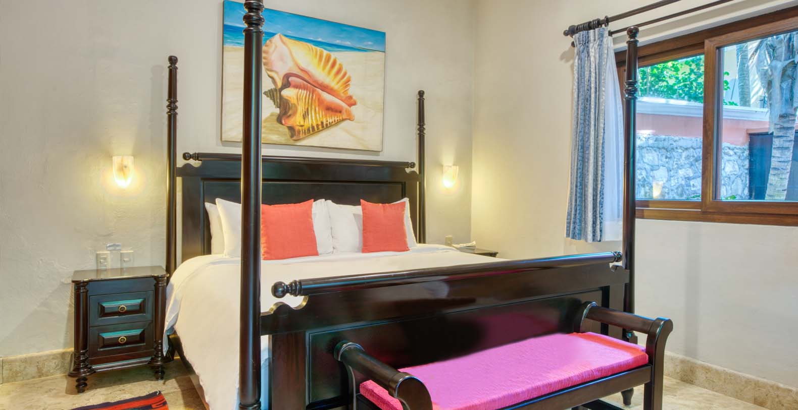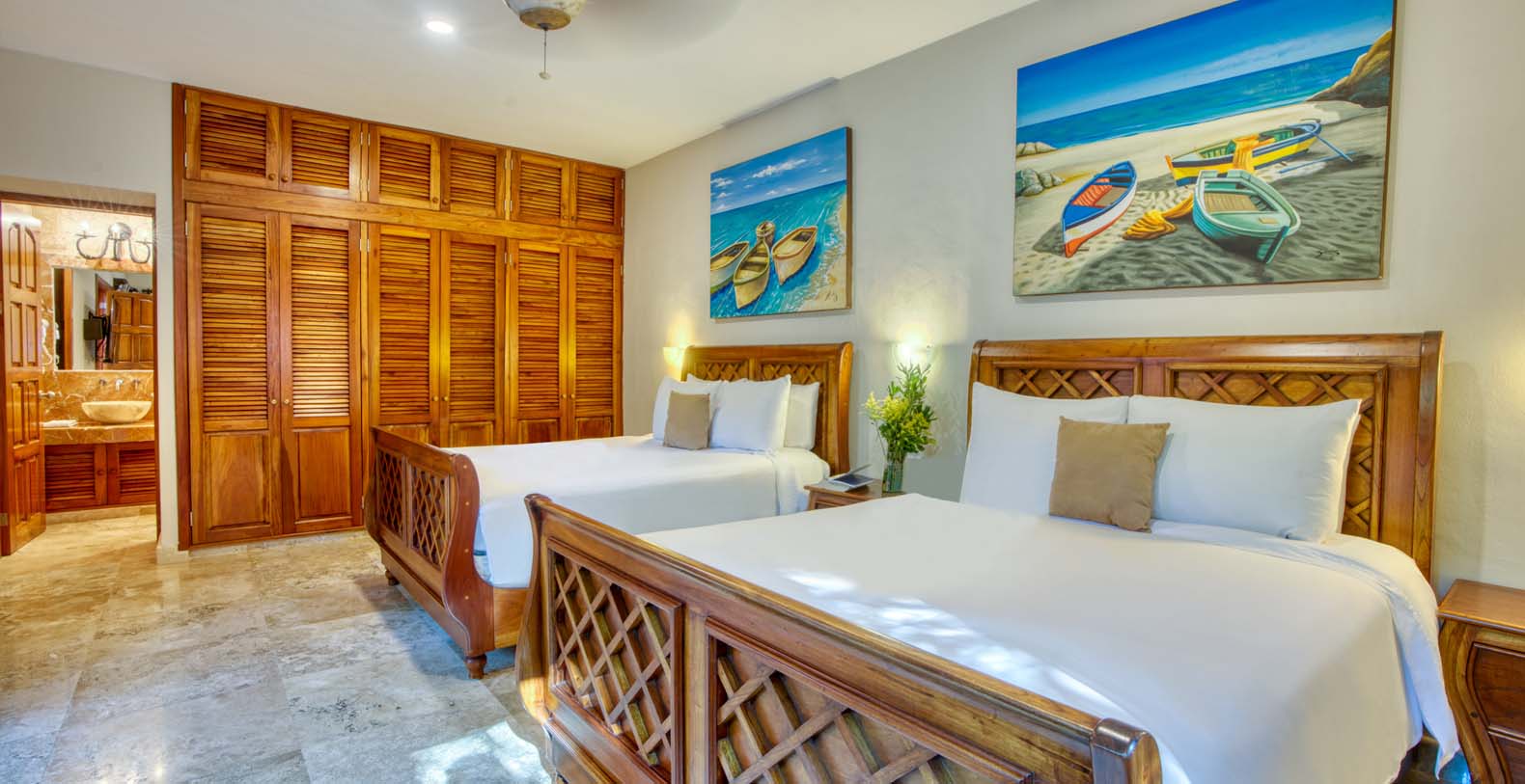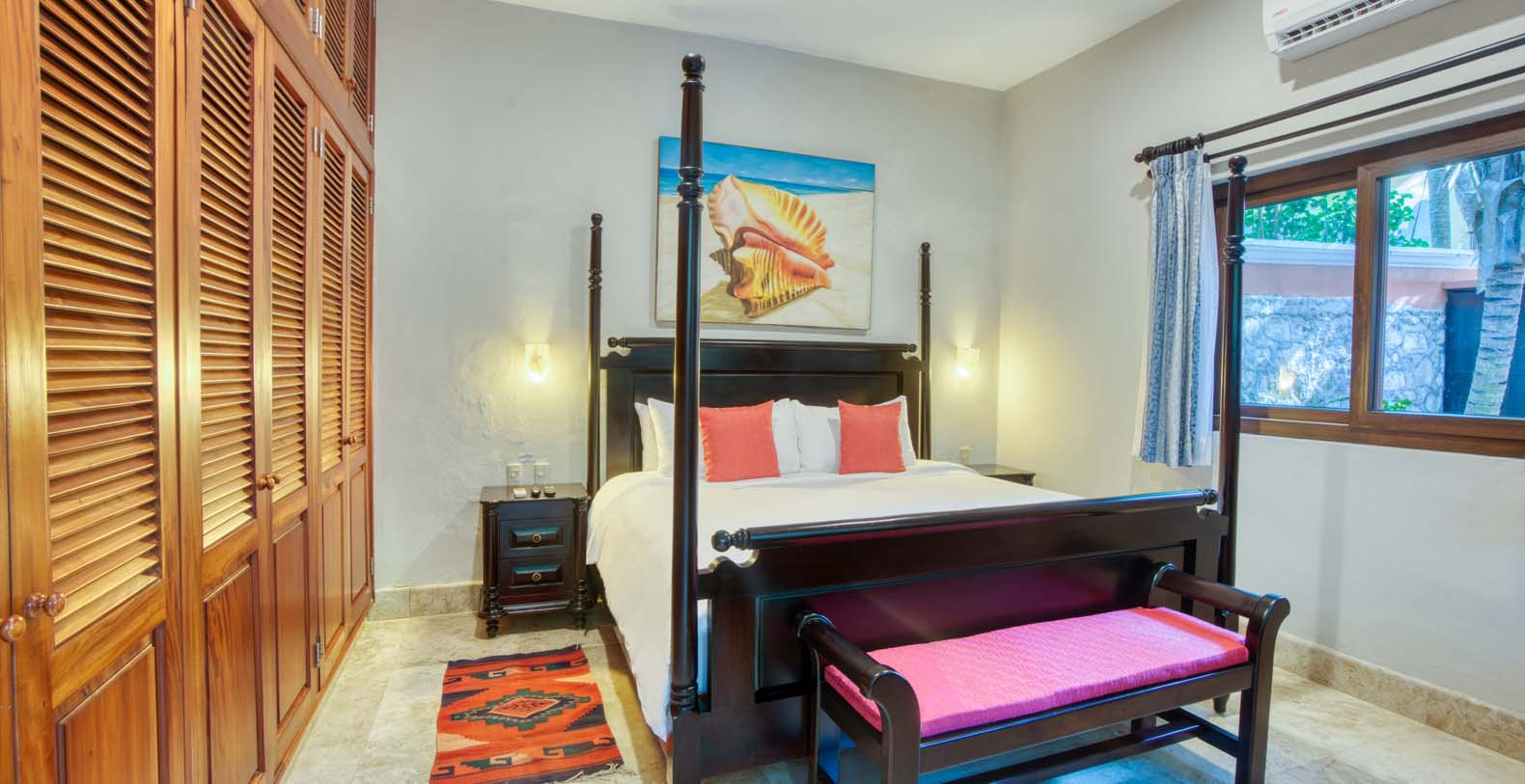 There are five artistically designed air-conditioned bedrooms with fourteen foot ceilings inside the villa, two bedrooms are furnished with two queen size beds, two bedrooms are furnished with one king size bed and one bedroom is furnished with one queen size bed. There are also four lovely guesthouses located outside, two of the guesthouses are furnished with two king size beds and the two other guesthouses each have one king size bed. Each of the nine bedrooms are equipped with ceiling fans, satellite TV, a DVD player, and a security safe. Casa Yardena's magnificent decor was inspired by Mexican architecture and craftsmanship. Every Bedroom has its private luxurious marble bathroom and the Master bathroom has a Jacuzzi tub with an incredible view of the Caribbean.