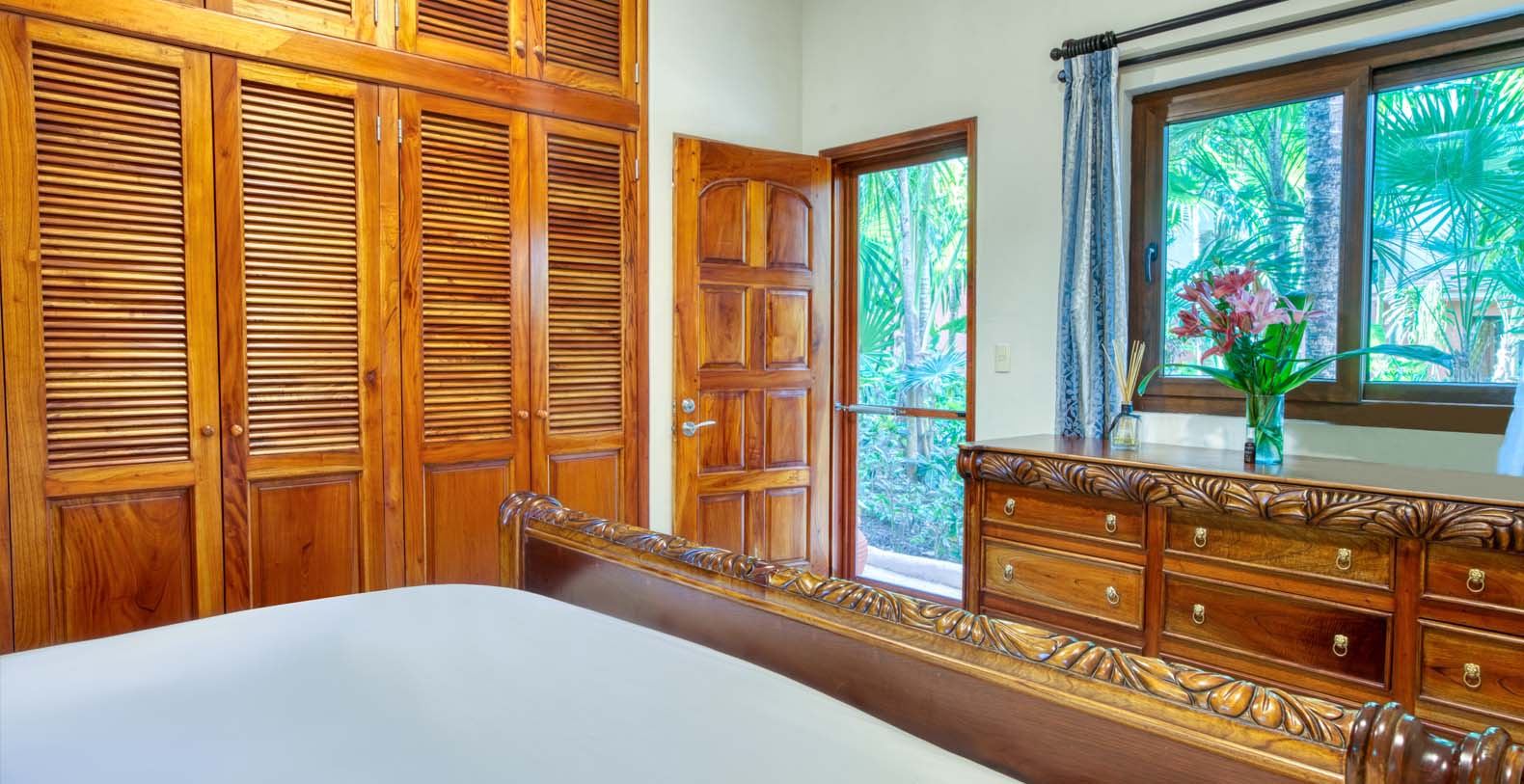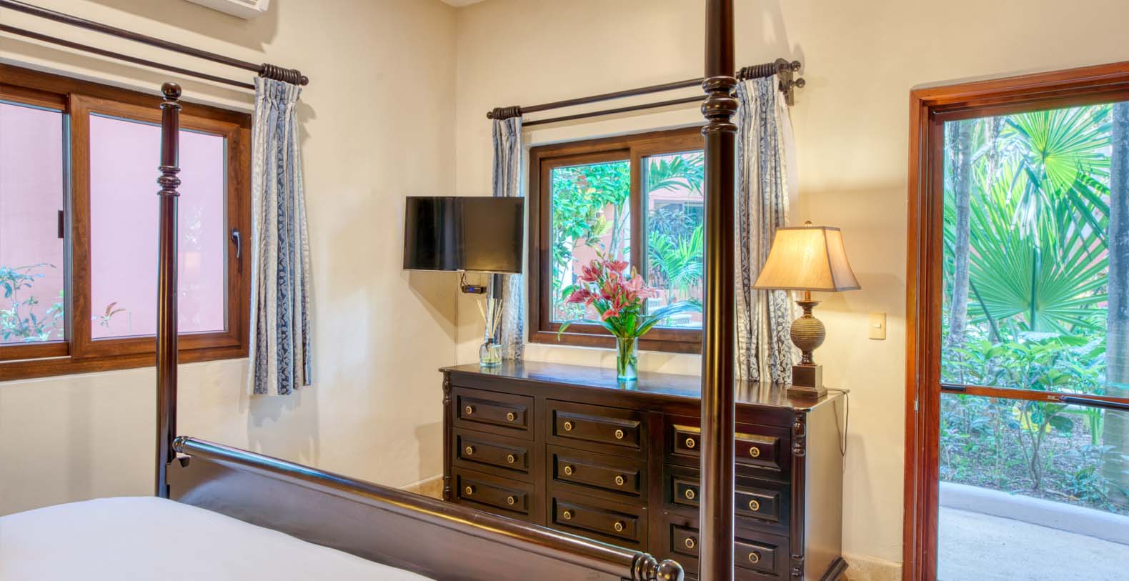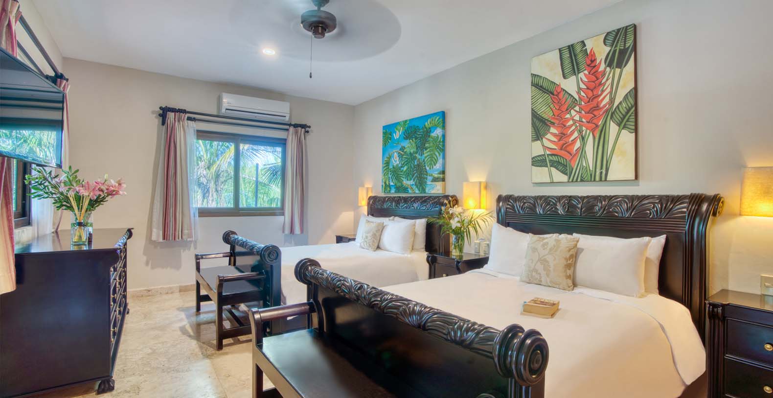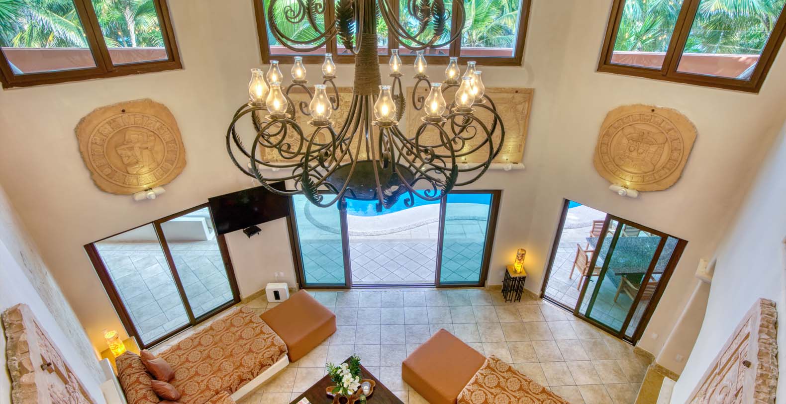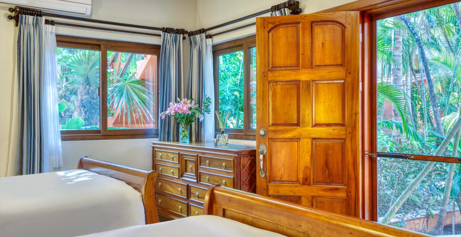 There are five artistically designed air-conditioned bedrooms with fourteen foot ceilings inside the villa, two bedrooms are furnished with two queen size beds, two bedrooms are furnished with one king size bed and one bedroom is furnished with one queen size bed. There are also four lovely guesthouses located outside, two of the guesthouses are furnished with two king size beds and the two other guesthouses each have one king size bed. Each of the nine bedrooms are equipped with ceiling fans, satellite TV, a DVD player, and a security safe. Casa Yardena's magnificent decor was inspired by Mexican architecture and craftsmanship. Every Bedroom has its private luxurious marble bathroom and the Master bathroom has a Jacuzzi tub with an incredible view of the Caribbean.