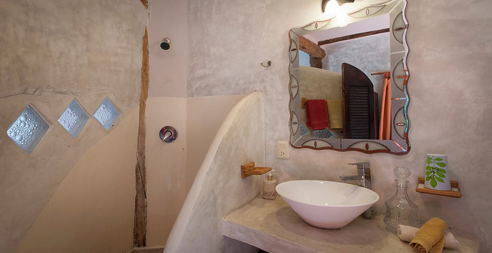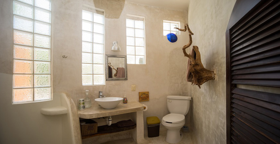 Casa de las Palmas is a stunning full-service vacation rental on Tulum Beach. Our because rental home has three bedrooms and sleeps 8. One bedroom is on the main floor with a queen sized bed and a balcony. Upstairs there are two more bedrooms with balconies, sea views, and private bathrooms. One upstairs bedroom has a king bed and the other has a queen bed plus 2 single beds. Natural elements and artistic touches throughout the house reflect the lovely laid back vibe and feel of Tulum.