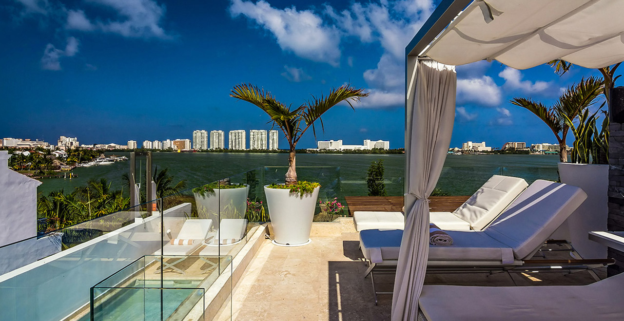 Chic and contemporary; this luxurious villa looks out over the lagoon to Cancun's energetic hotel strip. El Patron Villa offers the perfect luxury getaway for the discerning traveller looking to take advantage of everything the region has to offer. Gather with friends and family on the rooftop terrace where you can admire Cancun’s busy skyline or enjoy cocktails, prepared by your personal butler, on the lagoon jetty.