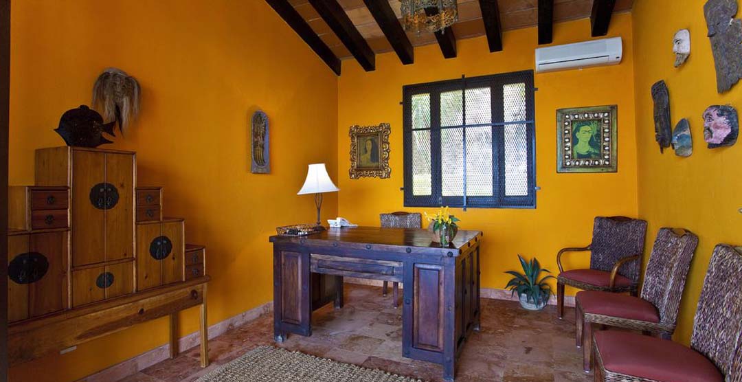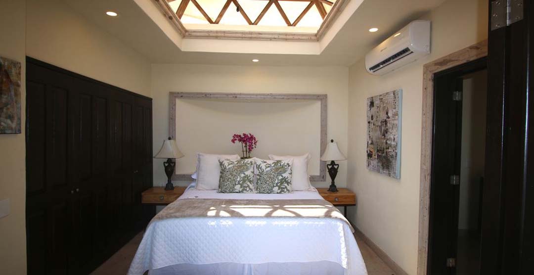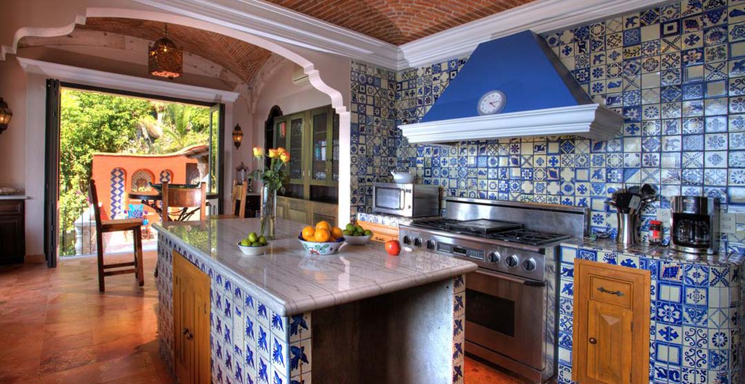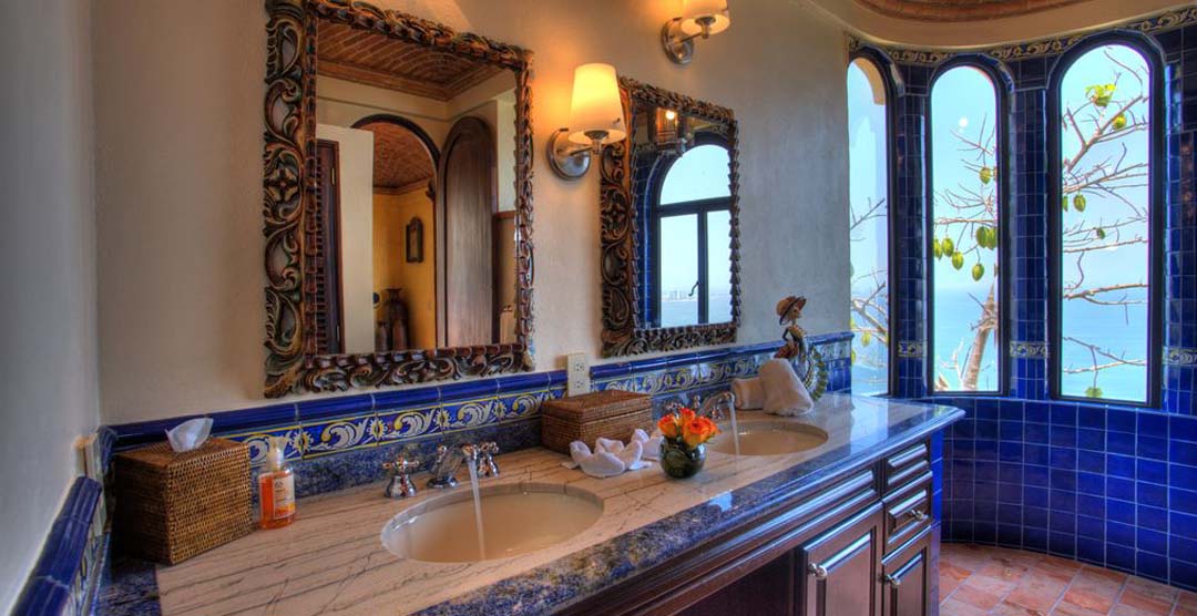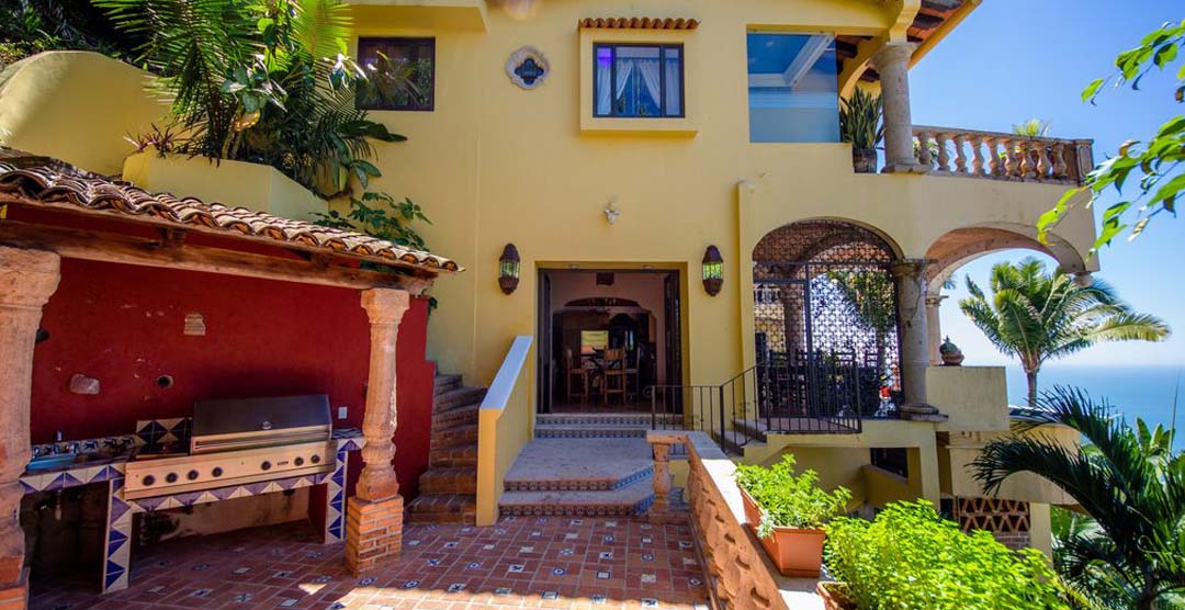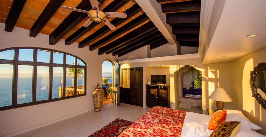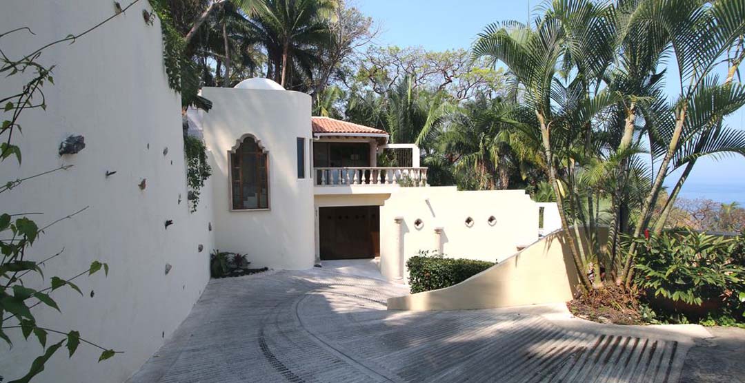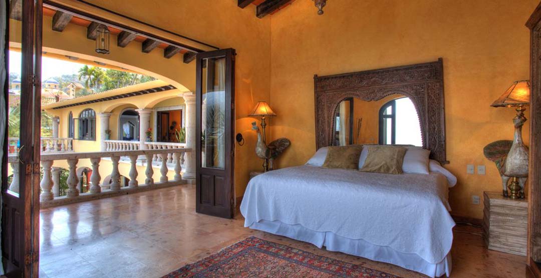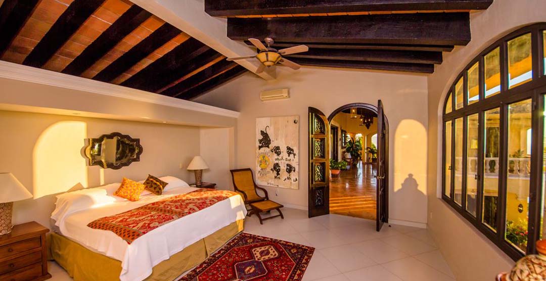 You will be pampered in this custom-designed and meticulously built home with its carved columns and balustrades, Spanish Alhambra tiles, bold arches, copper and crystal chandeliers, matte tikul flooring, vaulted brick vault ceilings, potted flowers and plants, coupons, and private patios and “Juliet” balconies. Four bedrooms face inward over an inner courtyard and pool, enjoying sweeping views of the Bay of Flags. A separate house has its own living room, kitchen, bedroom, bathroom, with views of the mountains, jungle, and south bay, and is a favorite of those wanting a bit more privacy.