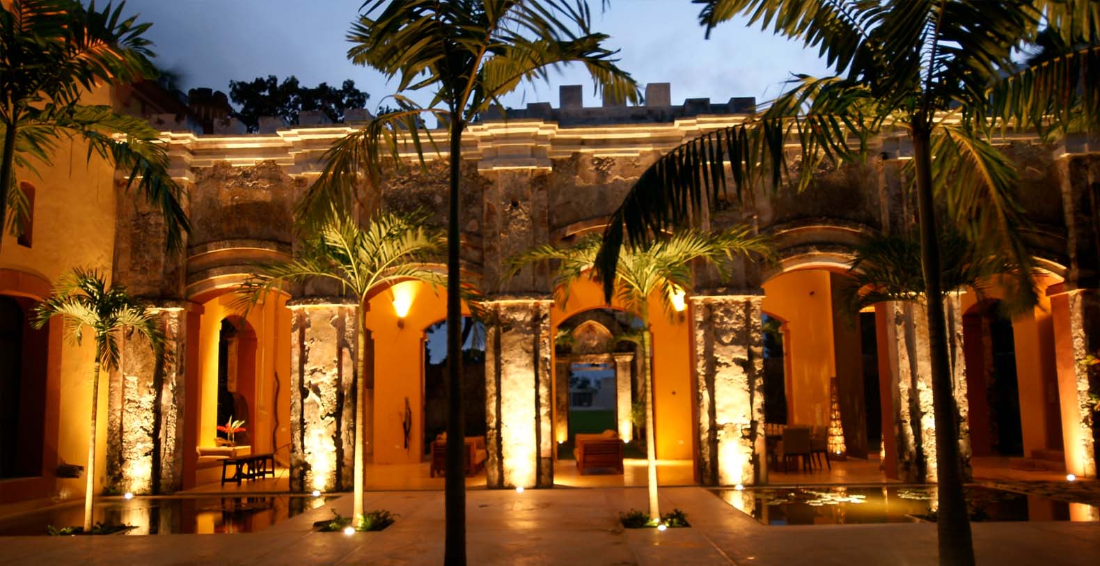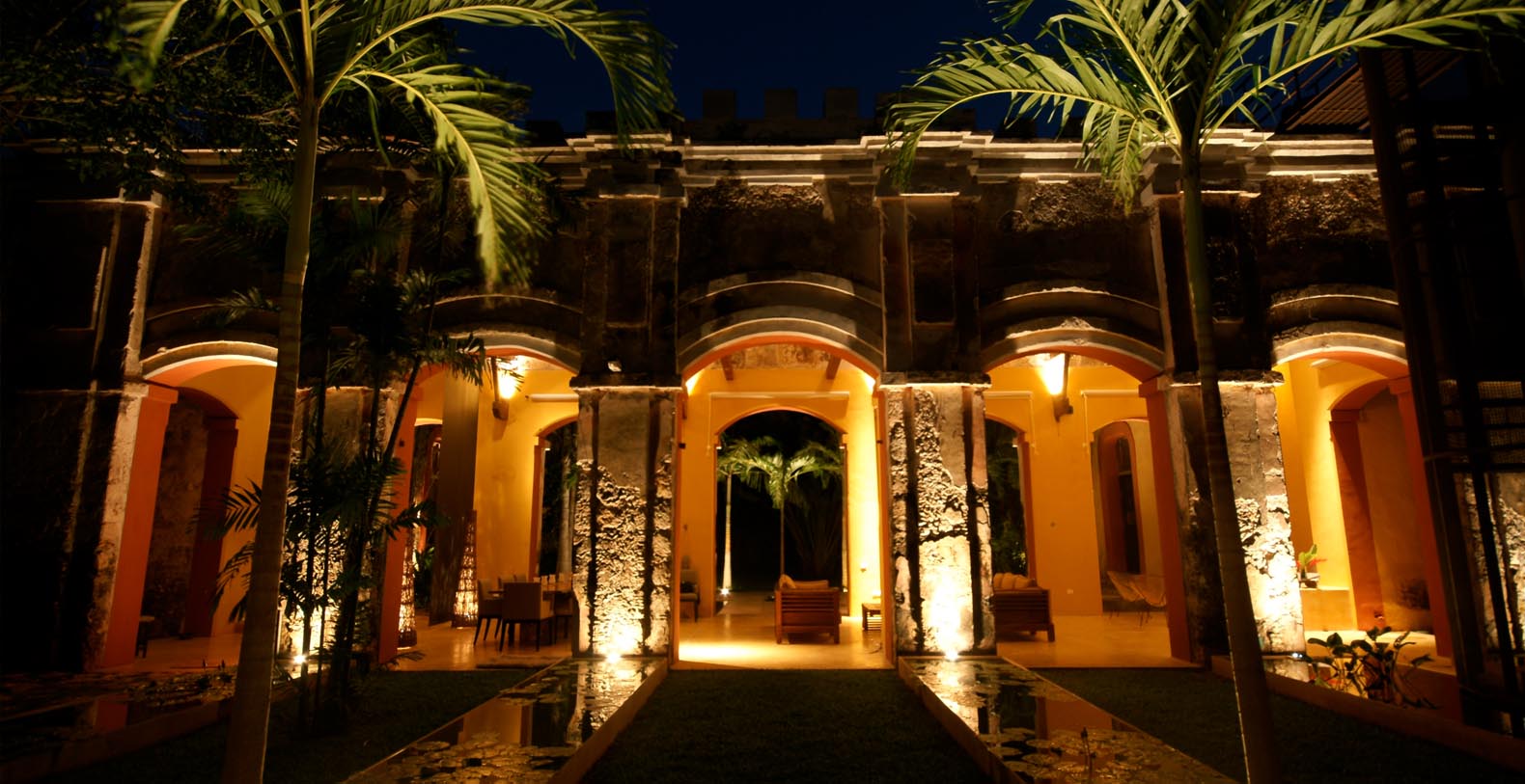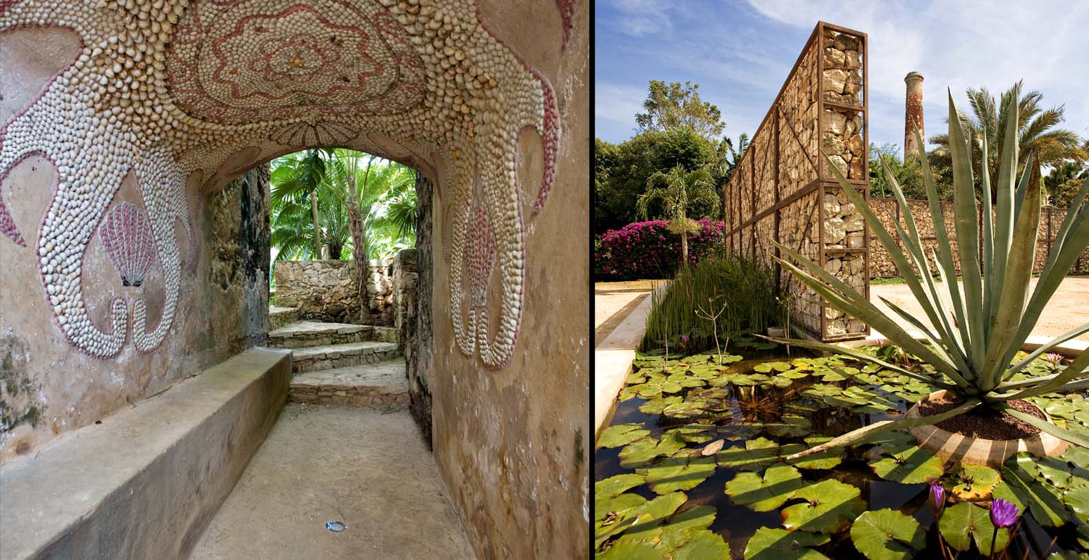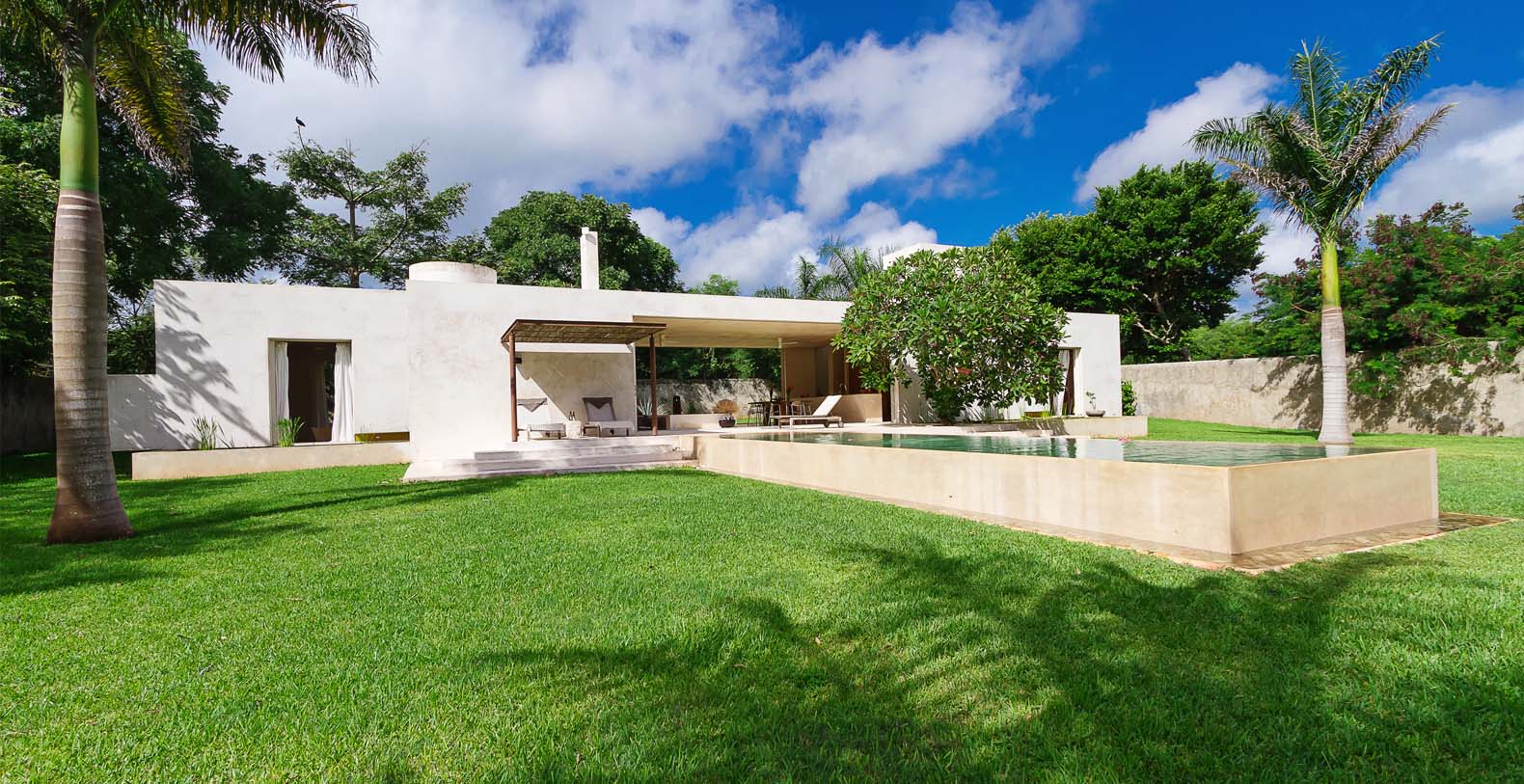Tucked away on the lush grounds of Hacienda Sac Chich,Casa de Maquinas are 3 limestone buildings, a water tower and an 85 ft. chimney. Surrounded by palm filled gardens Casa de Maquinas consists of three 2000sq.ft. rectangular structures that date to 1850.
