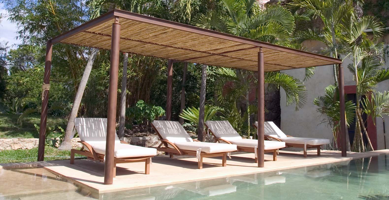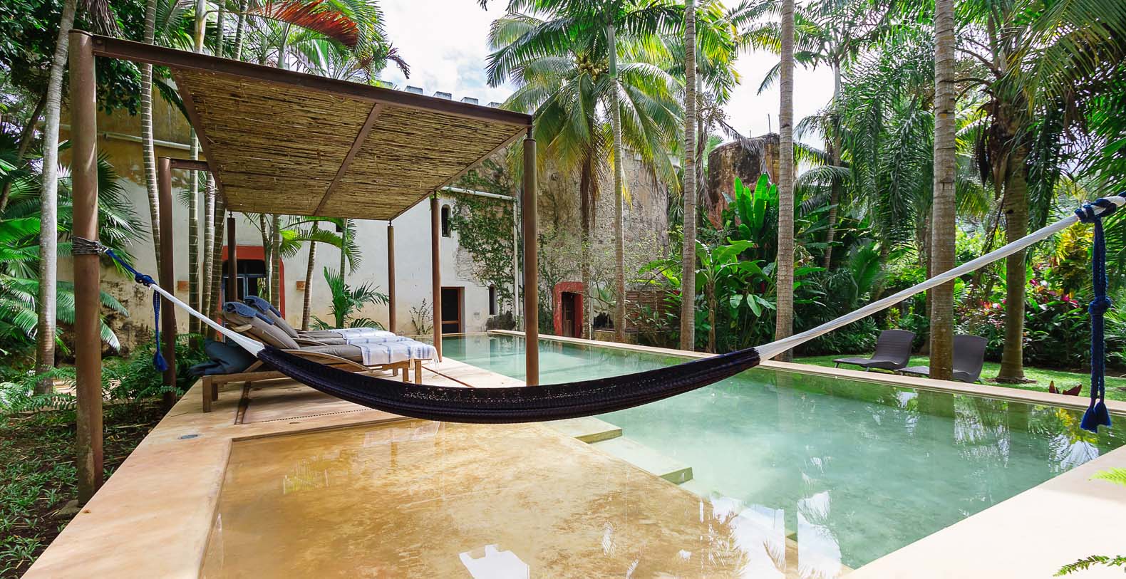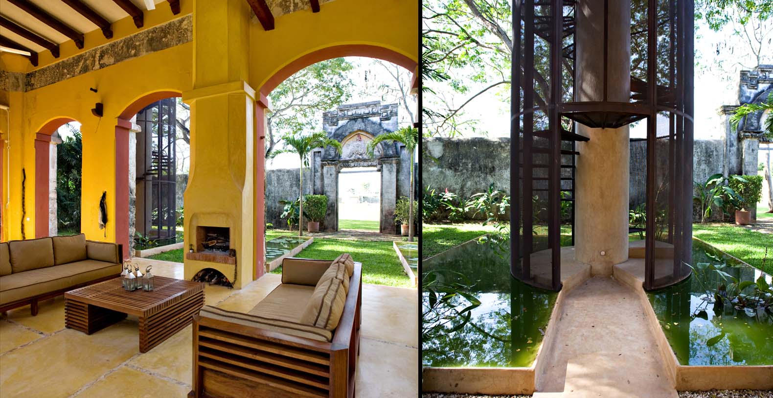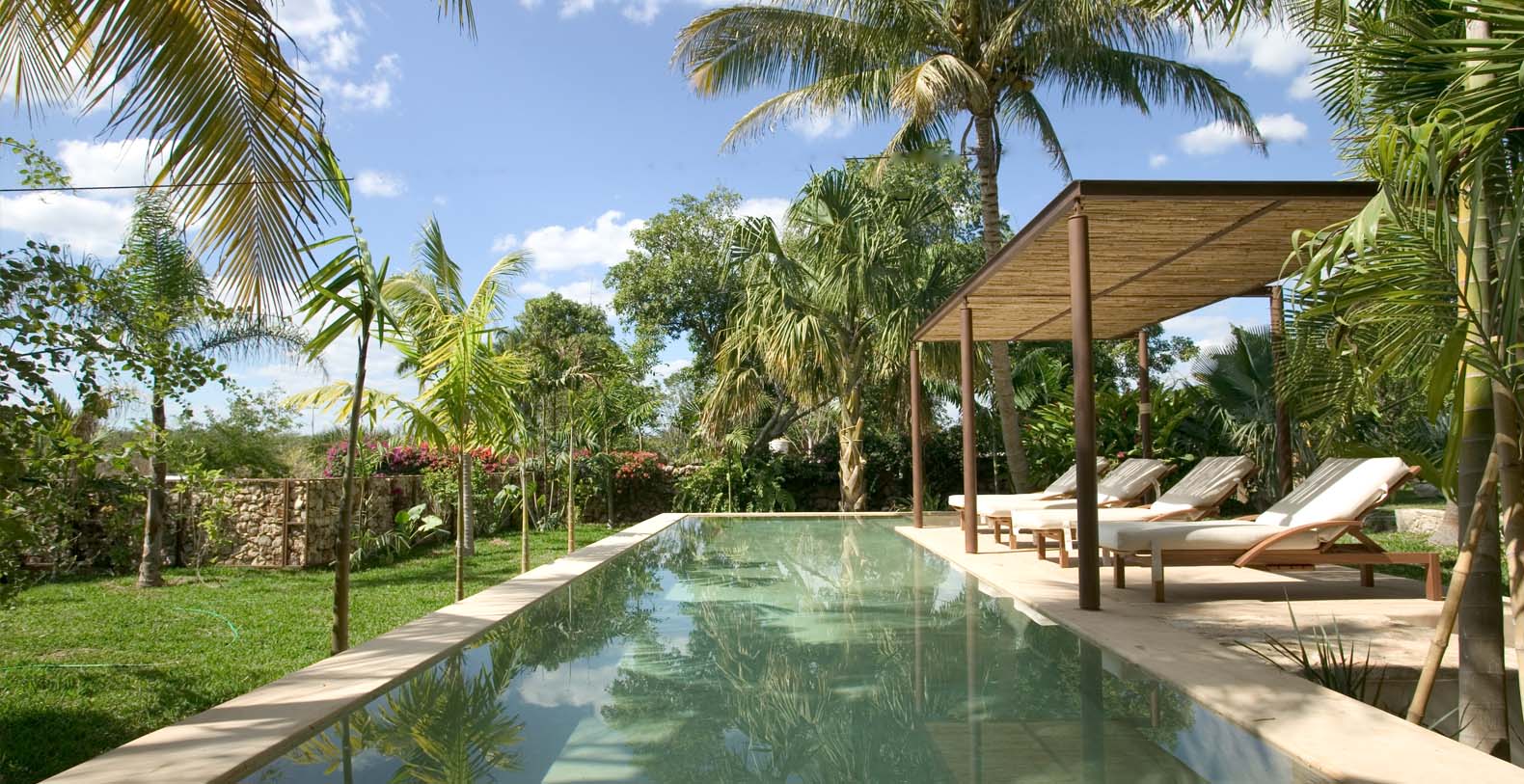 Throughout the hacienda there is evidence of its previous utilitarian life. Iron wheels and massive beams are remnants of its past. Once the water tank for the hacienda, the pool is now a shimmering refuge from the heat of the Yucatan. A steel and bamboo pergola and a playita of shallow water with a hammock suspended above provide areas for rest and shade. We have six chaise lounges for your relaxation. The open-air living room and dining pavilion, the Loggia is surrounded by lily and fish filled reflecting water ponds and dramatic lighting. From the loggia climb an enclosed spiral staircase to the roof top lounge area and a star gazing platform. Here you can watch the moon, stars, sunset, an approaching storm or enjoy the night breeze. Framing the entire hacienda are dry stacked stone walls, tall hedges of Fica and walls creatively designed with metal cages filled with local limestone. The grounds are filled with exotic rare palms, bamboos, gingers, tropical plants and fruit trees.