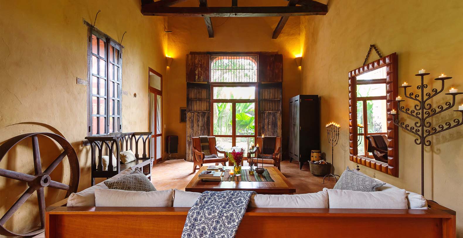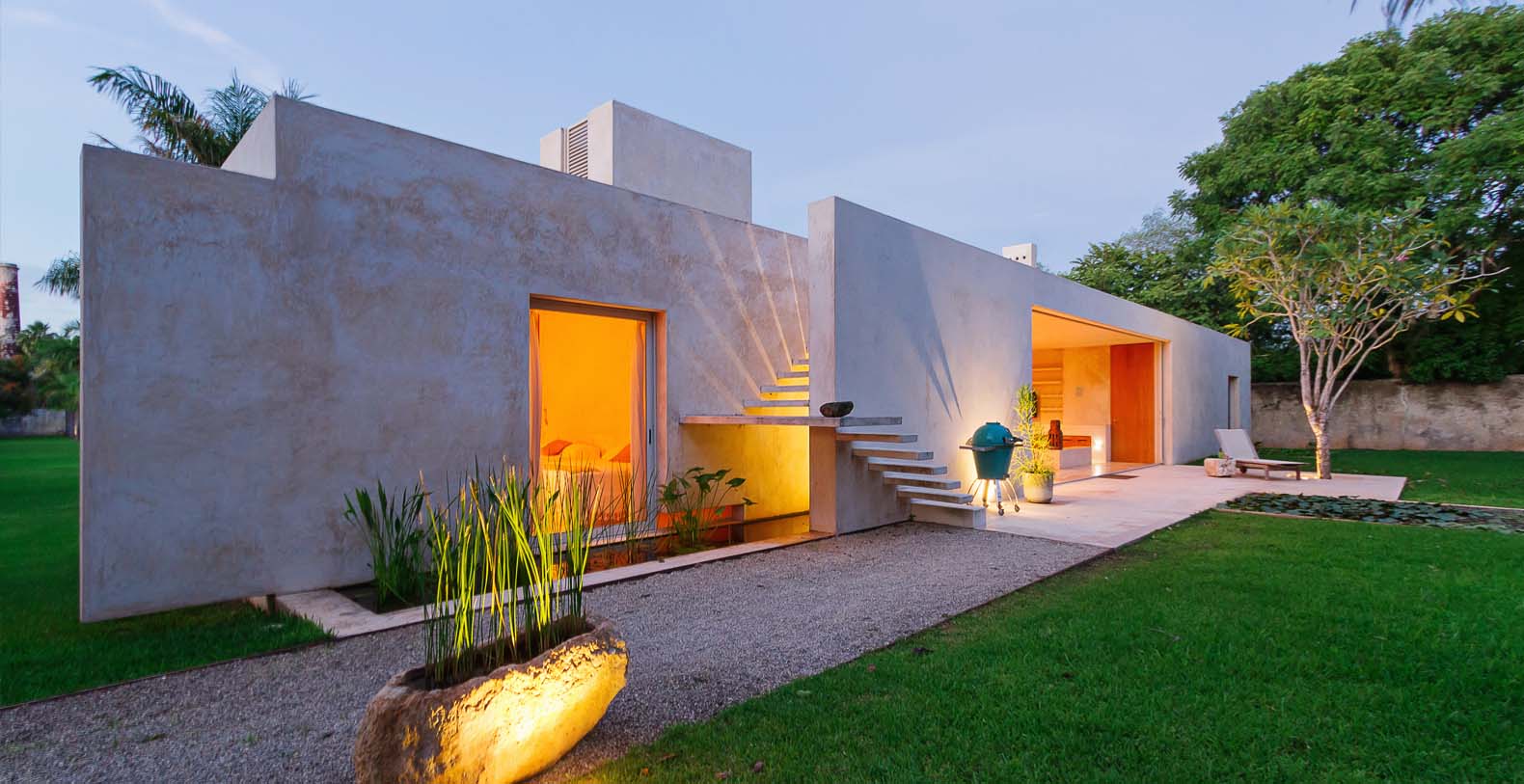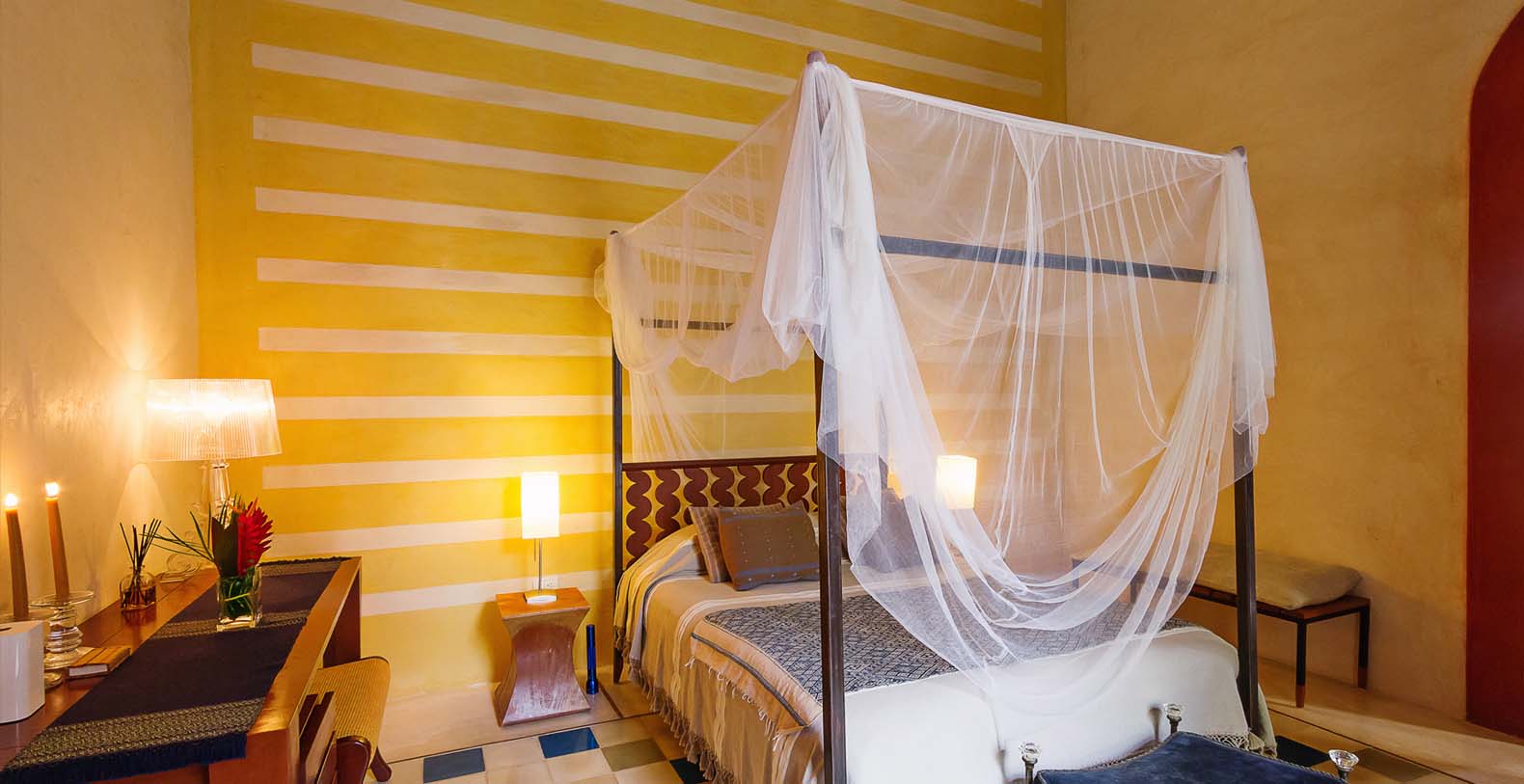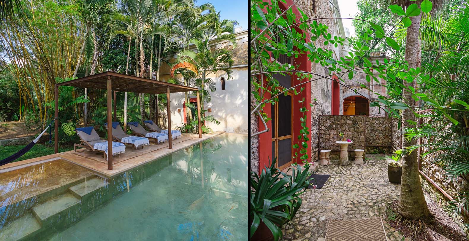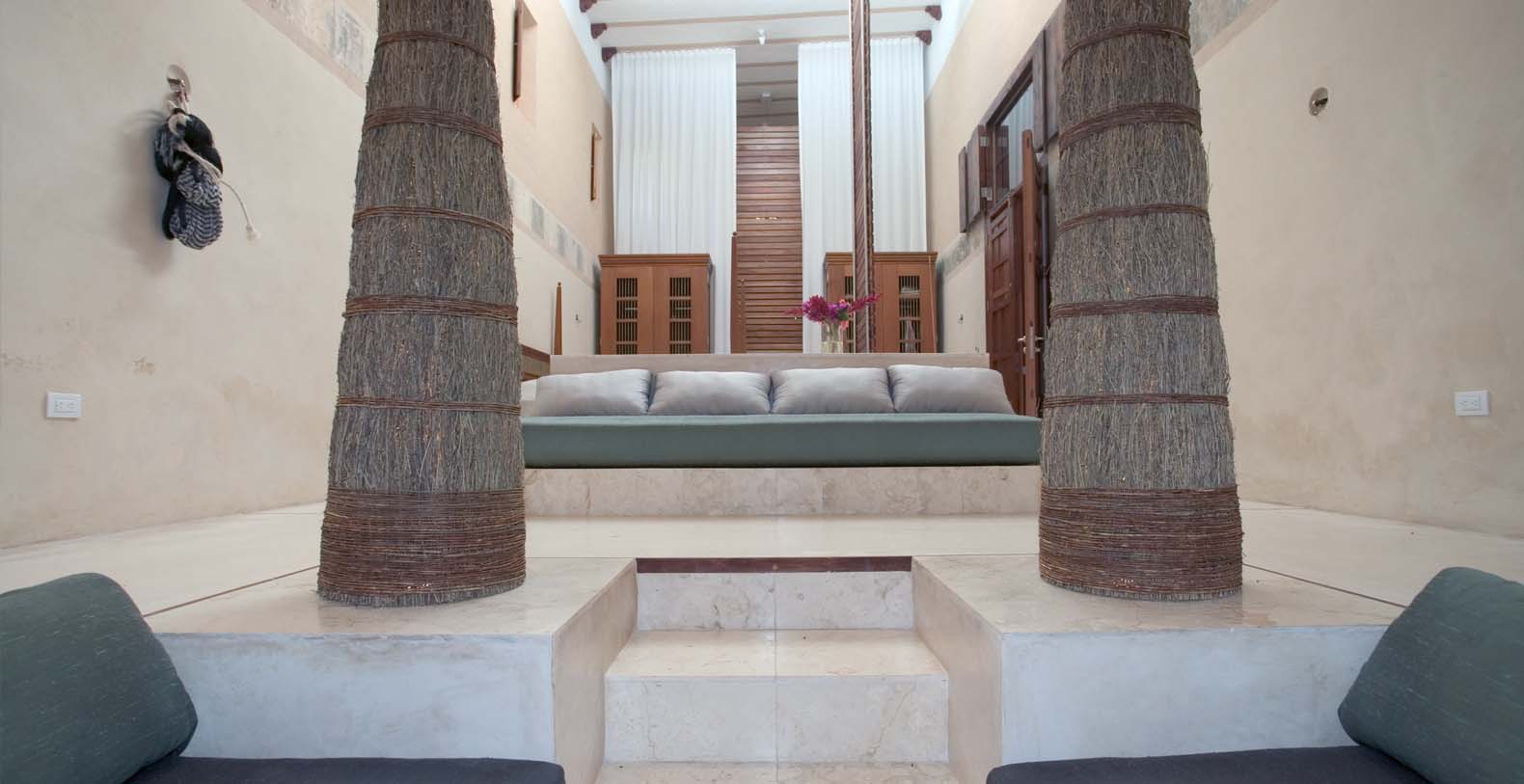 Throughout the hacienda there is evidence of its previous utilitarian life. Iron wheels and massive beams are remnants of its past. Once the water tank for the hacienda, the pool is now a shimmering refuge from the heat of the Yucatan. A steel and bamboo pergola and a playita of shallow water with a hammock suspended above provide areas for rest and shade. We have six chaise lounges for your relaxation. The open-air living room and dining pavilion, the Loggia is surrounded by lily and fish filled reflecting water ponds and dramatic lighting. From the loggia climb an enclosed spiral staircase to the roof top lounge area and a star gazing platform. Here you can watch the moon, stars, sunset, an approaching storm or enjoy the night breeze. Framing the entire hacienda are dry stacked stone walls, tall hedges of Fica and walls creatively designed with metal cages filled with local limestone. The grounds are filled with exotic rare palms, bamboos, gingers, tropical plants and fruit trees.